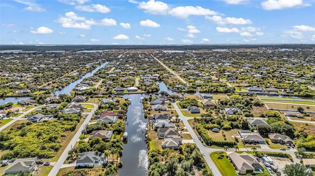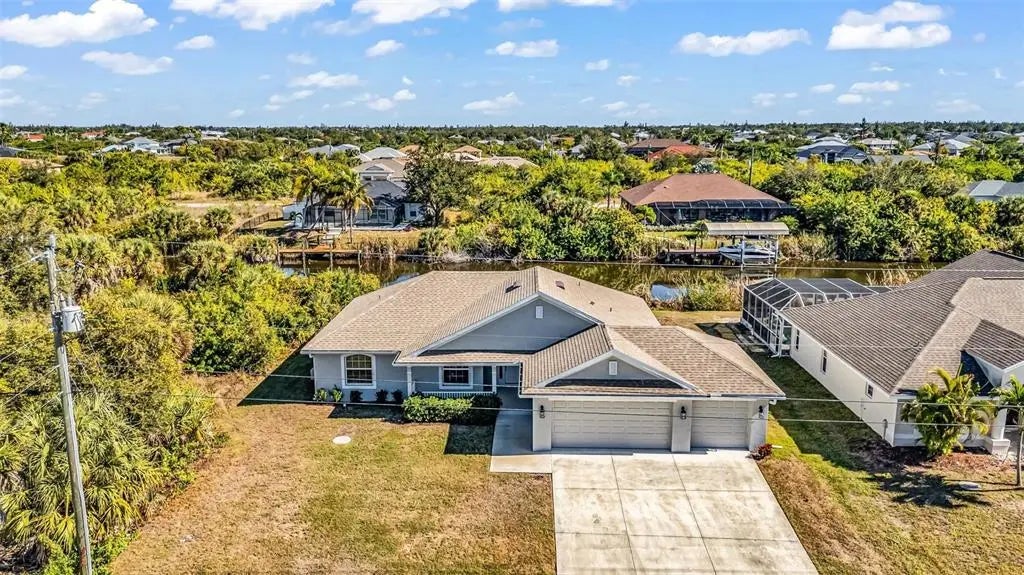 Welcome to 9500 Singer Cir, a •BRAND NEW• never-lived in •WATERFRONT• 4-bedroom, 2-bath home, completed at the end of 2023 and located in the desirable South Gulf Cove community. This thoughtfully designed home features a split floor plan and cathedral ceilings in the living room, creating a bright, open space that feels warm and inviting from the moment you enter. The home offers a •3-CAR GARAGE•, an •OVERSIZED DRIVEWAY•, a welcoming front porch, and a relaxing back patio. Situated on a •GULF ACCESS SALT WATER CANAL•, boating enthusiasts can reach the bay in approximately 30 minutes by boat. The home currently has no seawall or dock providing a great opportunity for future customization. Conveniently located just off a main access road, the home offers easy access while maintaining a quiet, peaceful setting. You’ll be within 10 minutes of one of the most beautiful beaches in Southwest Florida and just over 1.5 miles from the South Gulf Cove community clubhouse, home to a weekly farmers’ market and various social events. South Gulf Cove is known for its friendly atmosphere, 55+ miles of scenic waterways, and active coastal lifestyle. Nearby South Englewood offers charming dining, shopping, and a laid-back Gulf Coast feel. This pristine new construction home blends modern comfort, waterfront living, and a welcoming community—ready for you to make it your own. Don’t forget to look at the available floor plan and 3d virtual tour to get a great idea to the home layout before you arrive. Call your favorite real estate agent to schedule your own private tour of this wonderful home!