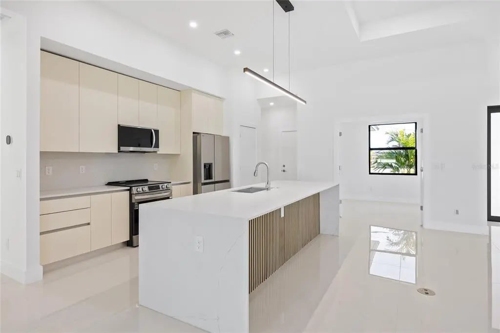 One or more photo(s) has been virtually staged. Welcome to Your Dream Florida Lifestyle! This stunning new custom-built home blends modern design with refined finishes throughout. Located in the highly sought-after South Gulf Cove community, this expansive neighborhood is surrounded by mature vegetation and scenic waterways, creating a serene and peaceful atmosphere just minutes from pristine beaches, marinas, golf courses, and the world-famous Boca Grande sandbar. Step inside this elegant home featuring three bedrooms plus a den /office, two and a half baths, and an open-concept layout with soaring ceilings and beautiful porcelain tile flooring throughout. The gourmet kitchen is a true showstopper, showcasing stainless steel appliances, a striking stone center island with bar seating, and custom cabinetry with under mount lighting. Each bathroom offers a modern design with fully tiled showers and quartz countertops, while every bedroom includes custom closets for elevated storage. The primary suite is a luxurious retreat, generously sized with two walk-in closets and a spa-inspired bathroom featuring double sink floating vanity, anti-fog touch light mirrors, a freestanding soaking tub, and a walk-around shower with dual rain shower heads. Your inside laundry room complete with side by side washer and dryer has access to your spacious two-car garage provides ample room for vehicles and/ or a workshop, while the elegant paver driveway adds curb appeal. Step outside to your 250-square-foot lanai with tiled flooring, extending your living space outdoors and creating the perfect setting for relaxing or entertaining in style. The fully irrigated St. Augustine lawn is complemented by tropical landscaping and a six-foot vinyl privacy fence, with plenty of space to build your future pool. South Gulf Cove offers an amenity-rich lifestyle with sidewalks, a park and playground, and unlimited access to the community boat ramp—all with an optional HOA. This home checks every box for luxury, lifestyle, and location. As an added bonus, the seller is offering a $10K credit toward a rate buy-down or closing cost assistance and will consider seller financing. Call today to schedule your private tour and make this Florida dream home yours!