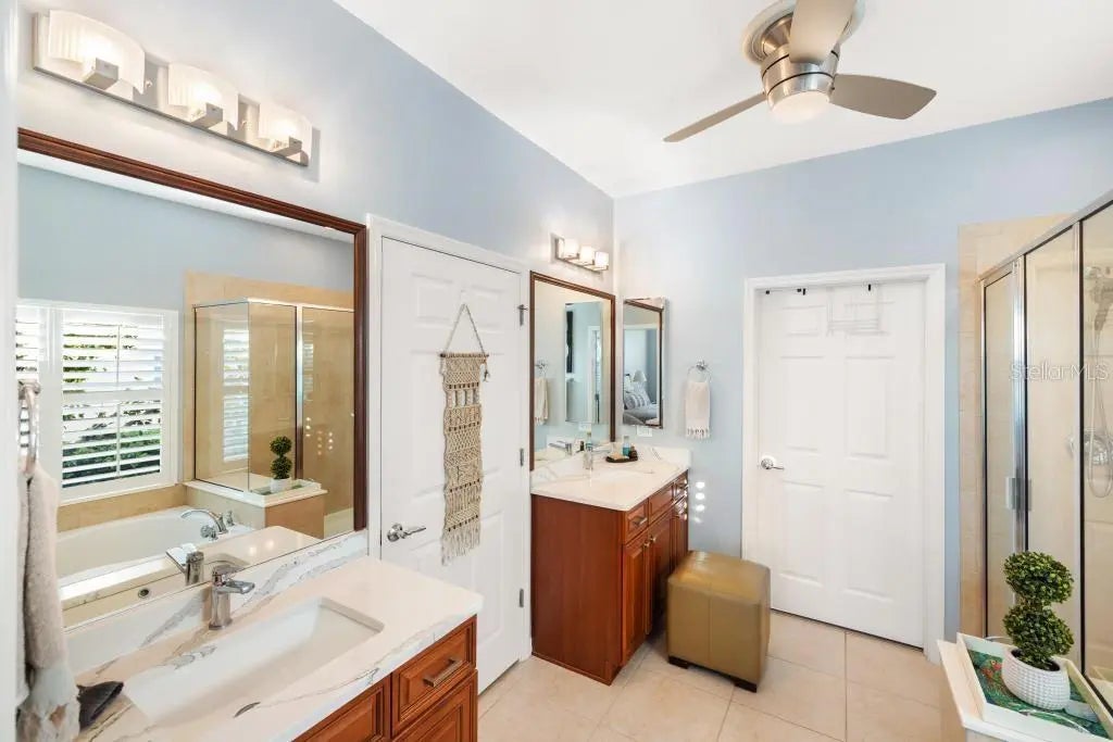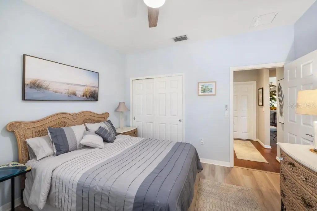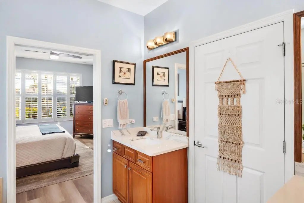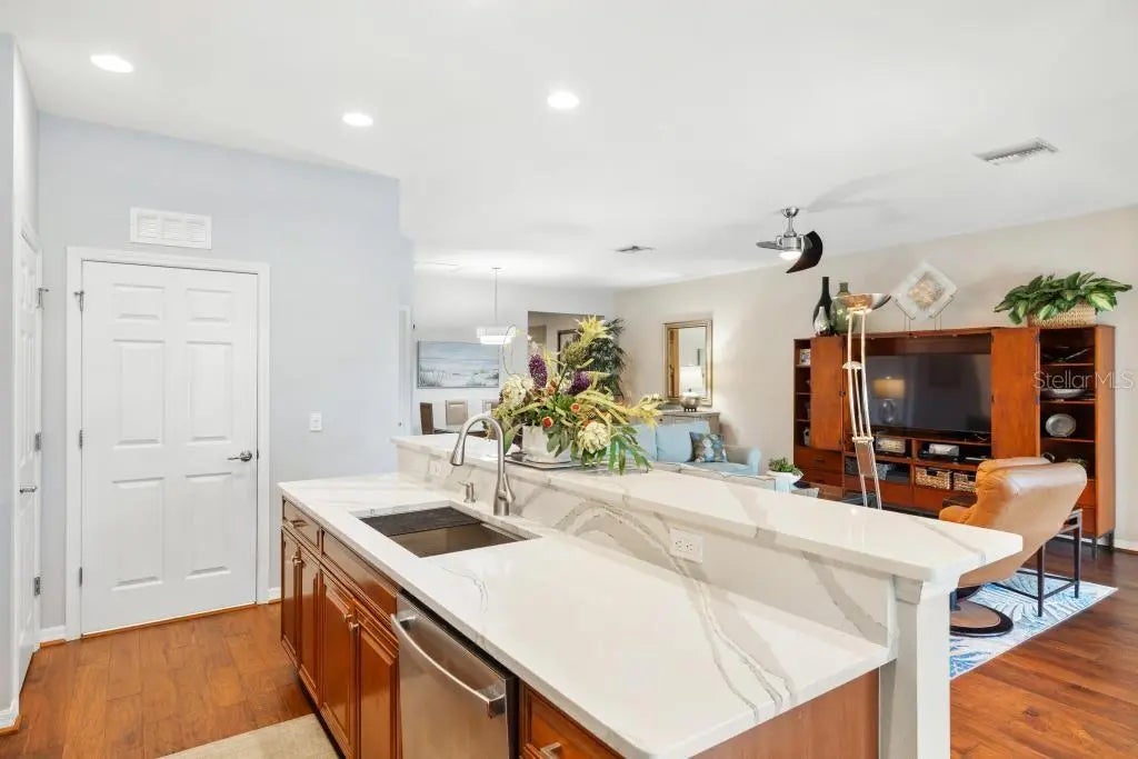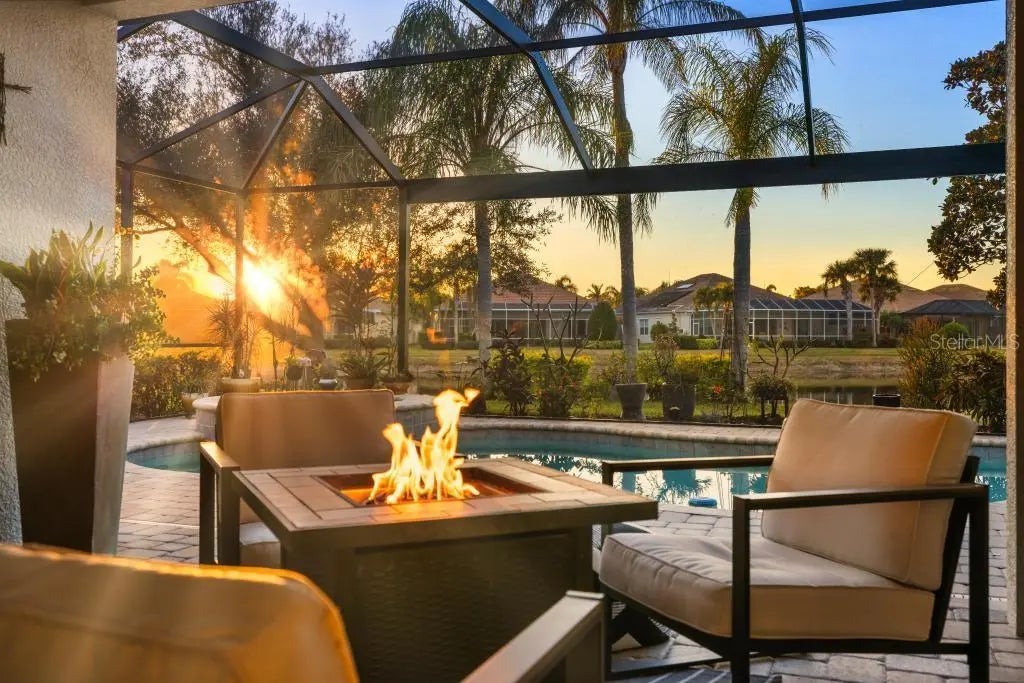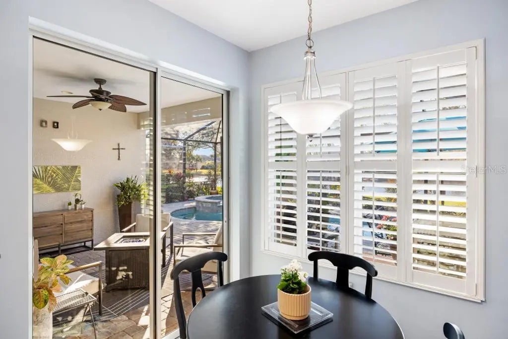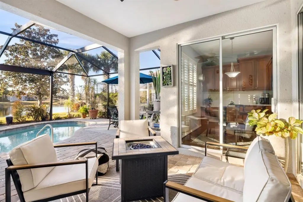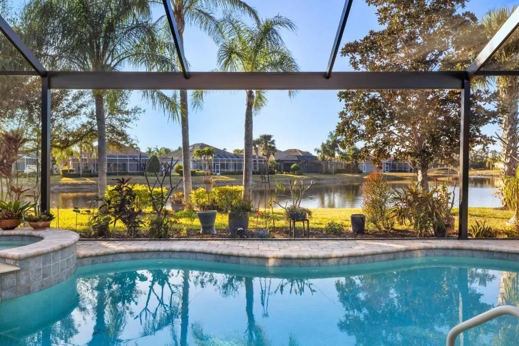 Perfectly positioned on a premier waterfront homesite in the highly sought-after, gated community of IslandWalk, this pristine pool home offers breathtaking sunset water views and maintenance free living. The panoramic screened lanai with a newer cage frames a heated saltwater pool, creating a private outdoor retreat ideal for entertaining or quiet evenings overlooking the water. Inside, refined upgrades and thoughtful enhancements elevate the home throughout. The kitchen features updated quartz countertops and backsplash, several newer appliances, enhanced lighting, a formal dining room, and a charming dining nook. Fresh interior and exterior paint, crown molding, plantation shutters, and newer flooring (no carpet anywhere) in the bedrooms provide a clean, coastal sophistication. The spacious primary suite offers a soaking tub, private water closet, and custom built-in closet system. Flexible living spaces include a den with built-in cabinetry (removable if desired), offering versatility for office or hobby use. System updates include a new A/C system (2025) and newer water heater. IslandWalk at Wellen Park is known for its resort-style amenities, including two clubhouses, heated lap and lagoon pools, state-of-the-art fitness centers, tennis and pickleball courts, walking trails, Venetian bridges,and a full-time activities director. Just minutes from Downtown Wellen Park, CoolToday Park, dining, shopping, and Gulf beaches, this location offers an unmatched lifestyle. Furniture and golf cart may be available separately. This is an exceptional opportunity to secure a sunset, water view property in one of Venice’s most vibrant, amenity-rich communities.