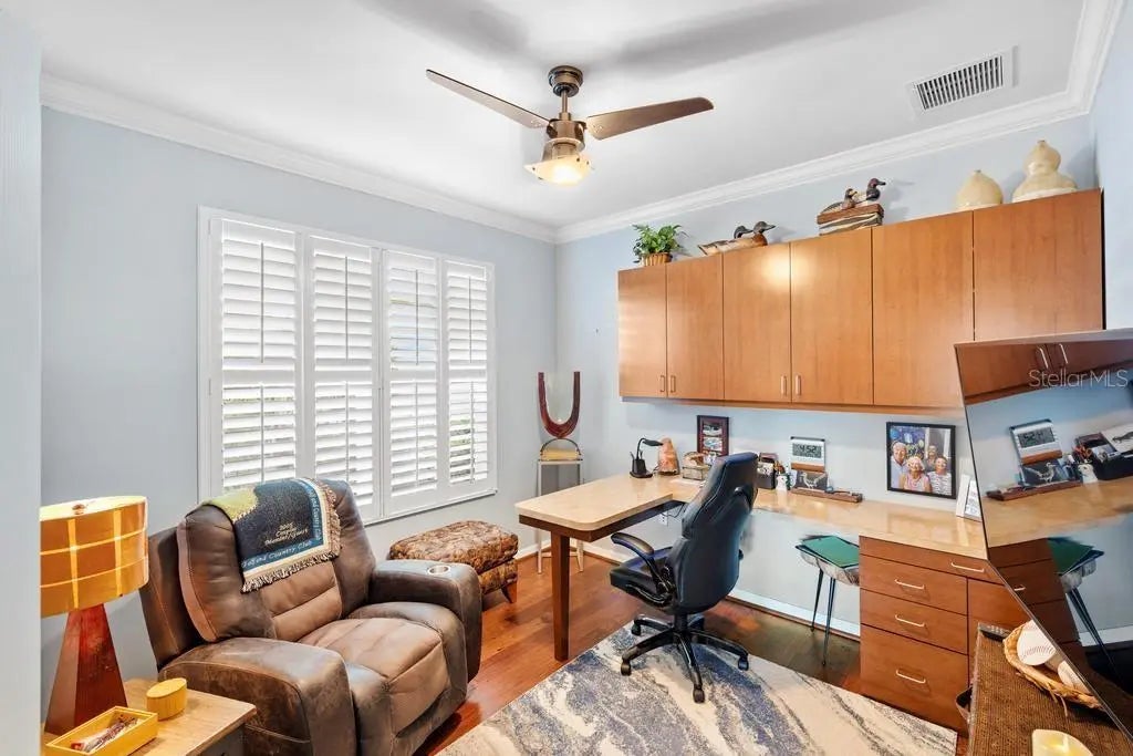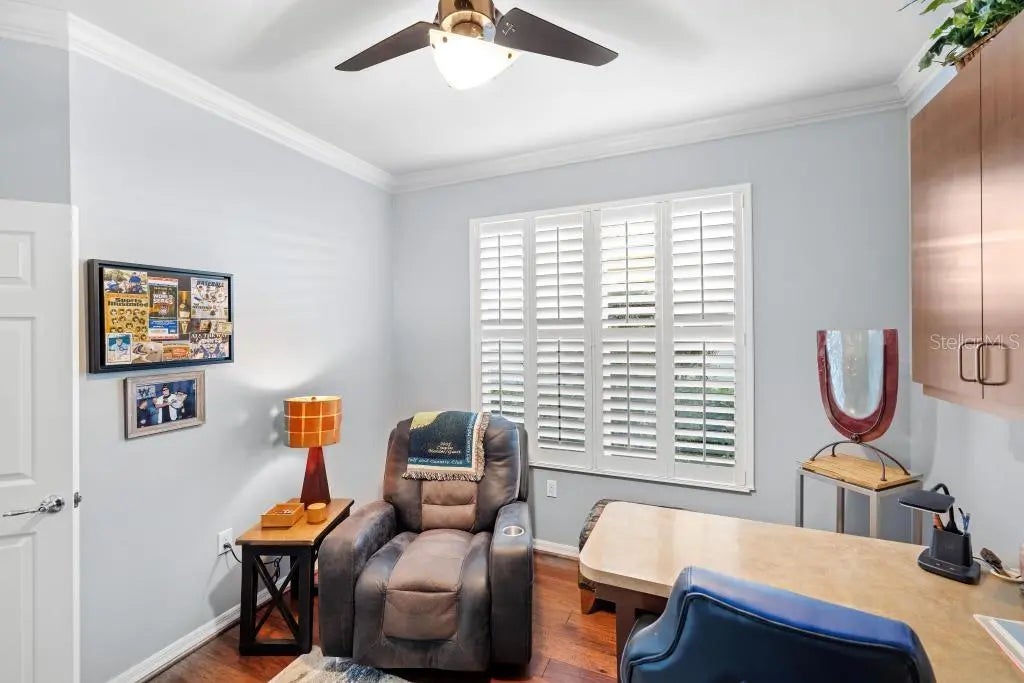 - Interior FeaturesCeiling Fan(s), Crown Molding, High Ceilings, Solid Surface Counters, Thermostat, Walk-In Closet(s), Window Treatments