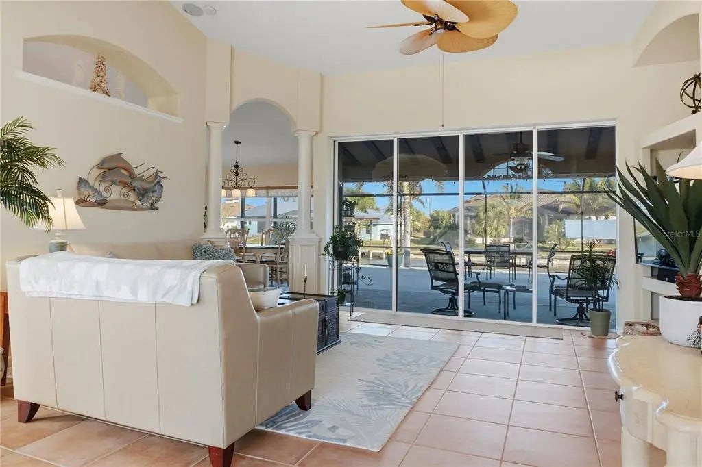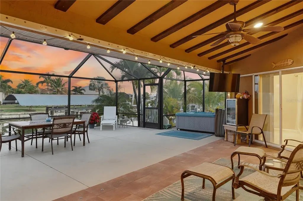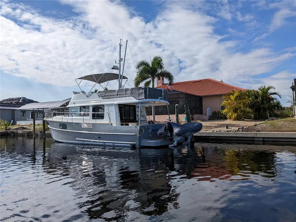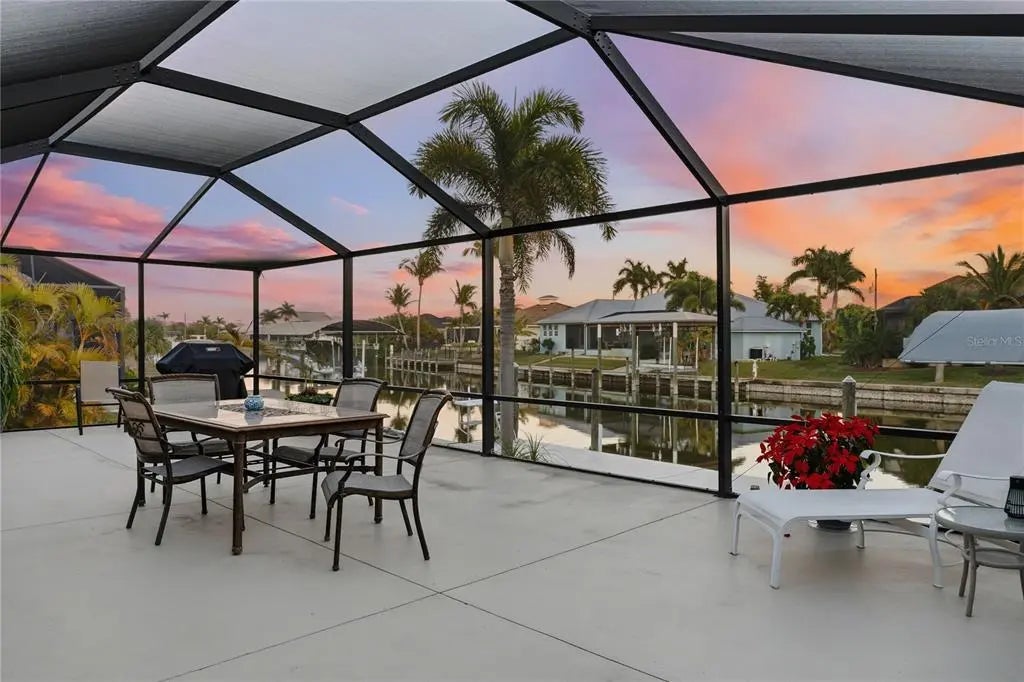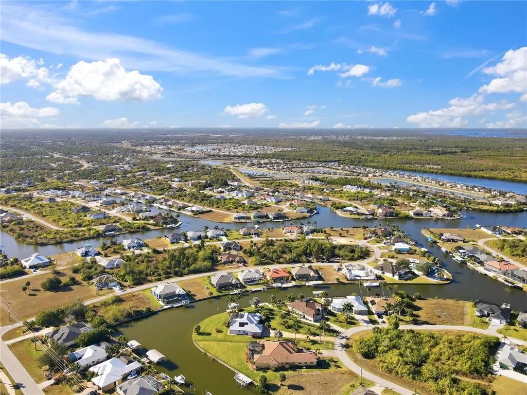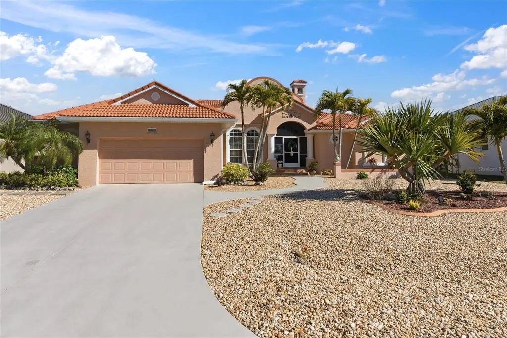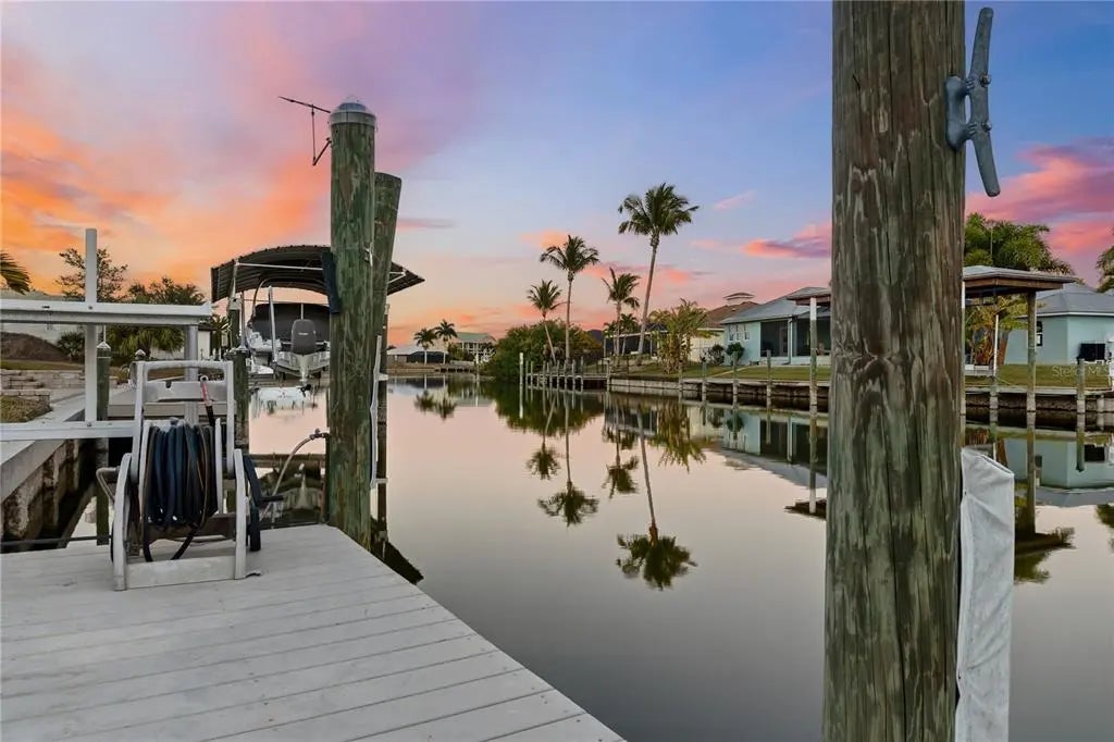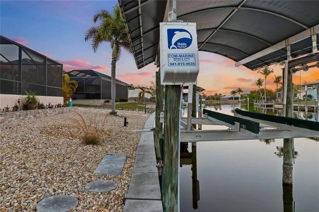 Waterfront living—thoughtfully designed and ideally positioned. Located in the northern section of South Gulf Cove, this beautifully maintained three-bedroom, two-bath waterfront home offers no fixed bridges, quick access to the lock, and approximately ten minutes to Charlotte Harbor and the Gulf. With approximately seventy-five feet of concrete seawall, a 30-foot composite dock equipped with 50amp shore power + a regular 110 service and water capable of accommodating a 45ft yacht plus a 6,500-lb covered boat lift, this setup is designed for real-world boating. Inside, the home features a warm Southwest and Mediterranean-inspired aesthetic paired with a functional, open layout. Double entry doors lead into a vaulted great room where full-length sliders bring in natural light and create a seamless connection to the outdoors. A wood-burning fireplace adds character and comfort, while a flexible adjacent space works well as a home office or formal dining area. The kitchen is both practical and inviting, offering water views, a breakfast bar, and a bright dining area that opens directly to the lanai—ideal for everyday living or entertaining. The primary suite is spacious and well-appointed, featuring a tray ceiling, lanai access, a large walk-in closet, and an en suite bath with soaking tub and walk-in Roman shower. Outdoor living is where this home truly shines. The covered lanai with exposed beams provides an ideal space to relax or entertain, while the stand-alone hot tub offers a private place to unwind. The home was intentionally designed without a pool to keep maintenance low; however, a reinforced stem wall is already in place should a future owner choose to add one. Additional highlights include a new hot water heater (2024), 4-ton 17-SEER A/C system (2023), a recently cleaned tile roof, generous garage storage, attic space, and low-maintenance landscaping with no lawn to mow. An optional HOA, community boat ramp, miles of walking and biking paths, and seasonal neighborhood events further enhance the appeal. Conveniently located between Englewood and Port Charlotte, close to Boca Grande & Englewood beach, golf courses, dining, shopping, and world-class fishing, this home delivers the waterfront lifestyle you've always wanted.