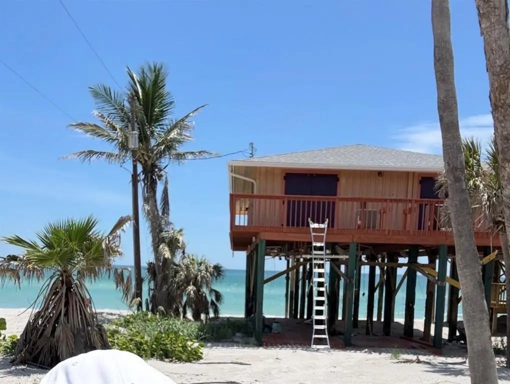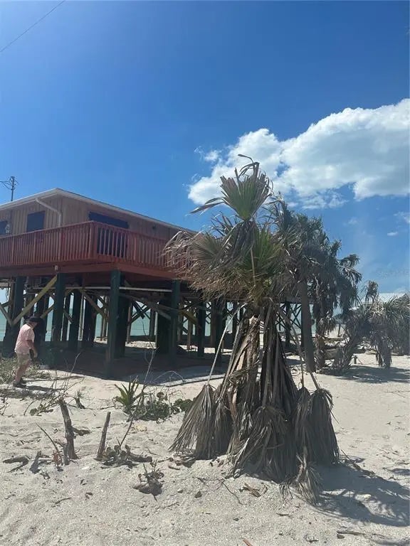 Escape to the quiet, unspoiled beauty of Little Gasparilla Island where sandy paths replace roads, golf carts replace cars, and the Gulf of Mexico becomes your backyard. Located directly on the beach, this stilt home sits on a prime stretch of shoreline offering sweeping water views, sea breezes, and the rare privacy only a boat-access barrier island can provide. You will soon be naming the dolphins and sea birds as they become a part of your everyday routine. If you enjoy watersports, you will never have to go far to set sail on the kayaks, wave runners or the Grady White. The dock is conveniently located and available for a minimal annual fee. The sunsets here are unlike all others. Breathtaking. The island is known for its remote, laid-back lifestyle—no bridges, no crowds, just miles of beach, wildlife, and the rhythm of the tides. Accessible by private boat or water taxi, this is Old Florida at its most authentic. Contact details provided for the water taxi service and on island golf cart rental. The existing elevated home has sustained damage to the lower level. Property is being sold strictly for land value. Seller makes no warranties or representations regarding condition, repairs, or improvements. Buyers should conduct their own due diligence. This offering presents an opportunity for those looking to renovate, rebuild, or create a custom island retreat on a coveted Gulf-front parcel. There are no steps or lifts to the second floor. Bring your imagination along with your contractor. If you’ve been waiting for a chance to own a slice of Little Gasparilla’s secluded beachfront, this is your canvas.