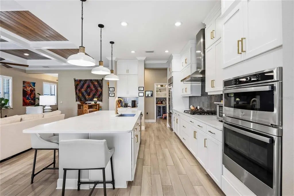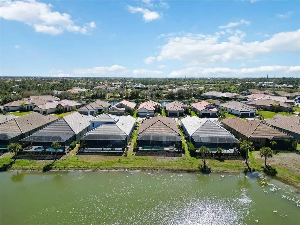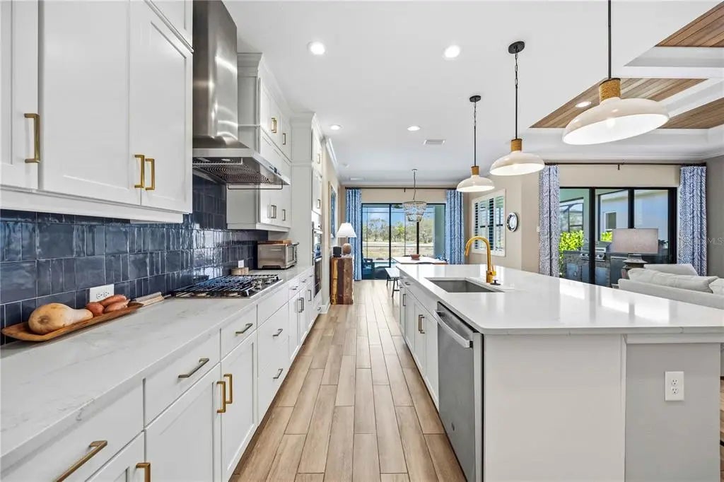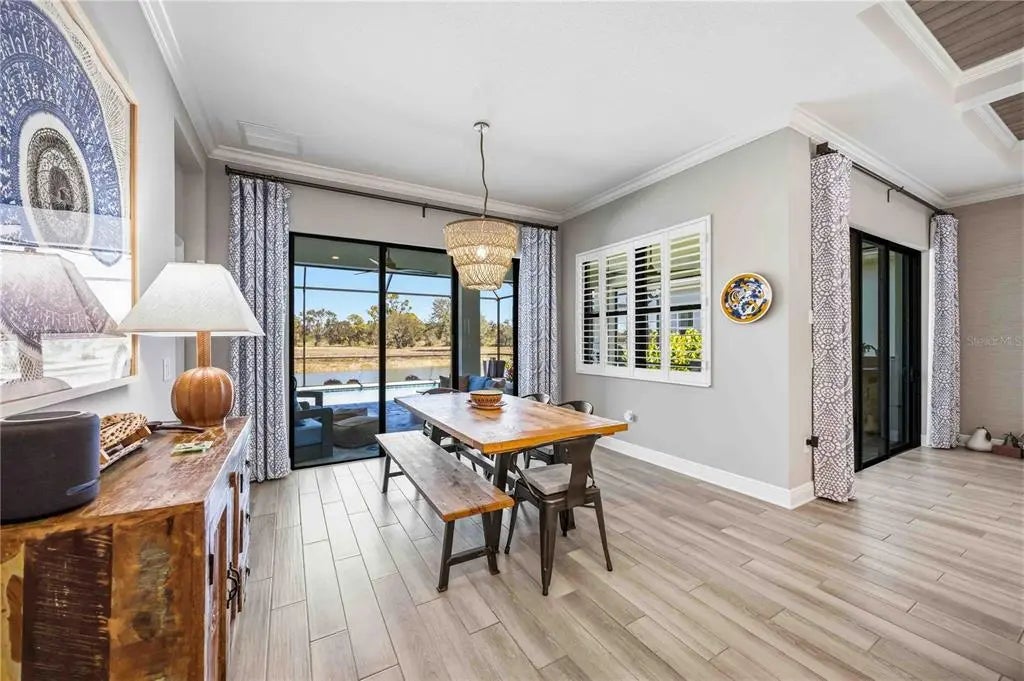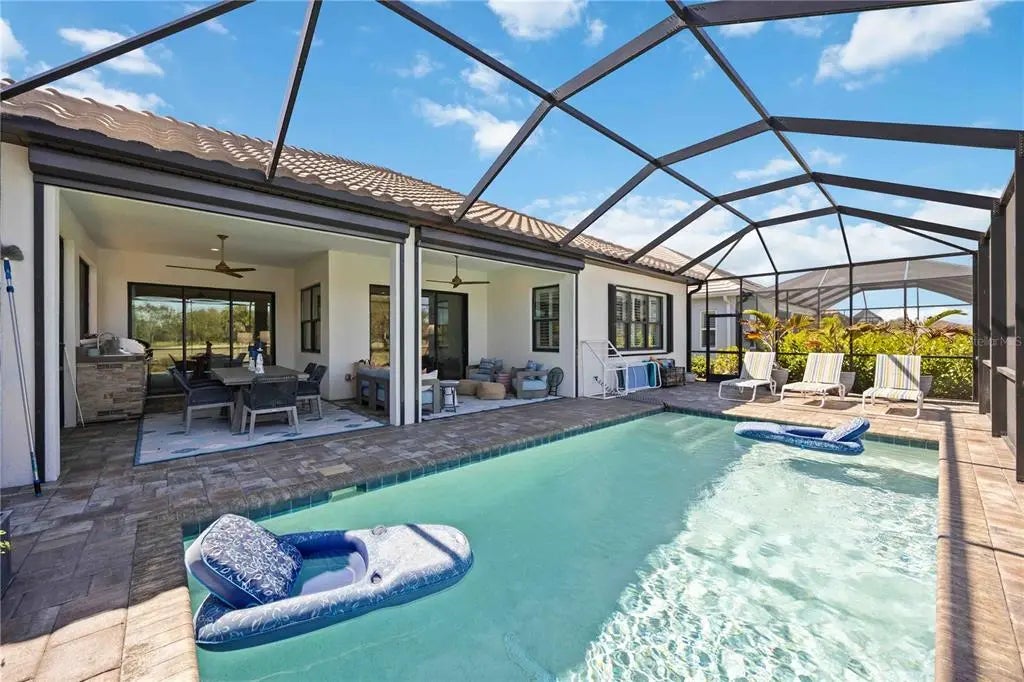 Set against a tranquil lake and preserve backdrop, this impeccably appointed residence delivers breathtaking views and effortless indoor–outdoor living. Enjoy serene moments in your private pool overlooking shimmering water and abundant wildlife, while the expansive covered lanai—beautifully finished with pavers, an oversized seating area, and a fully equipped outdoor kitchen—creates an exceptional setting for entertaining or quiet relaxation in every season. Built in late 2023, the home was thoughtfully designed for comfort, durability, and peace of mind, featuring electric roll-down hurricane screens, accordion hurricane shutters, a whole-house generator, and location within an X flood zone where flood insurance is not required. Inside, refined architectural details abound. Soaring 10-foot ceilings with crown molding, 8-foot doors, coffered and tray ceilings accented with wood-grain finishes, and luxury wood look plank tile flooring establish an elegant yet inviting atmosphere. Plantation shutters, custom drapery, designer lighting, and smart-home conveniences—including Wi-Fi thermostats and a camera doorbell—blend style with modern functionality. Two expansive sliders span the rear of the home, framing uninterrupted water views and filling the living space with natural light. A well-placed half bath adjacent to the kitchen and main living area adds everyday convenience and is ideal for guests while entertaining. The chef-inspired kitchen is a true showpiece, featuring quartz countertops, a custom backsplash, ceiling-height cabinetry with accent displays, gold hardware, a built-in refrigerator, gas range with a statement hood, built-in ovens, and a generous island with seating for six. A walk-in butler’s pantry with butcher block counters, wine refrigerator, and dedicated coffee station completes this exceptional culinary space. The Sea Mist floor plan by Neal Communities offers a serene primary suite retreat with dual custom-built walk-in closets and a spa-inspired bath showcasing a frameless glass shower with floor-to-ceiling tile, custom mirrors, and a dual-sink vanity. Two guest bedrooms share a beautifully appointed secondary bath with a large vanity and tub/shower combination. A den or office with custom built-in cabinetry provides flexible living space or an optional fourth bedroom. An oversized laundry and utility room adds everyday convenience with extensive cabinetry, a sink, folding counter, and newer washer and dryer. Additional highlights include custom closet built-ins throughout, a whole-home water filtration system, freezer in the garage, upgraded bathroom mirrors, and the option to purchase the home partially FURNISHED. Located within a private gated enclave of Grand Palm, residents enjoy maintenance-included lawn and landscape care along with resort-style amenities, including two community pools, a fitness center, and a vibrant calendar of social events. This is refined Florida living at its finest—where luxury finishes, thoughtful upgrades, and a spectacular natural setting come together in perfect harmony.