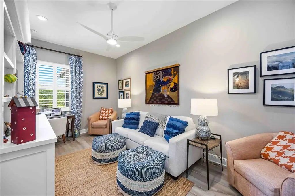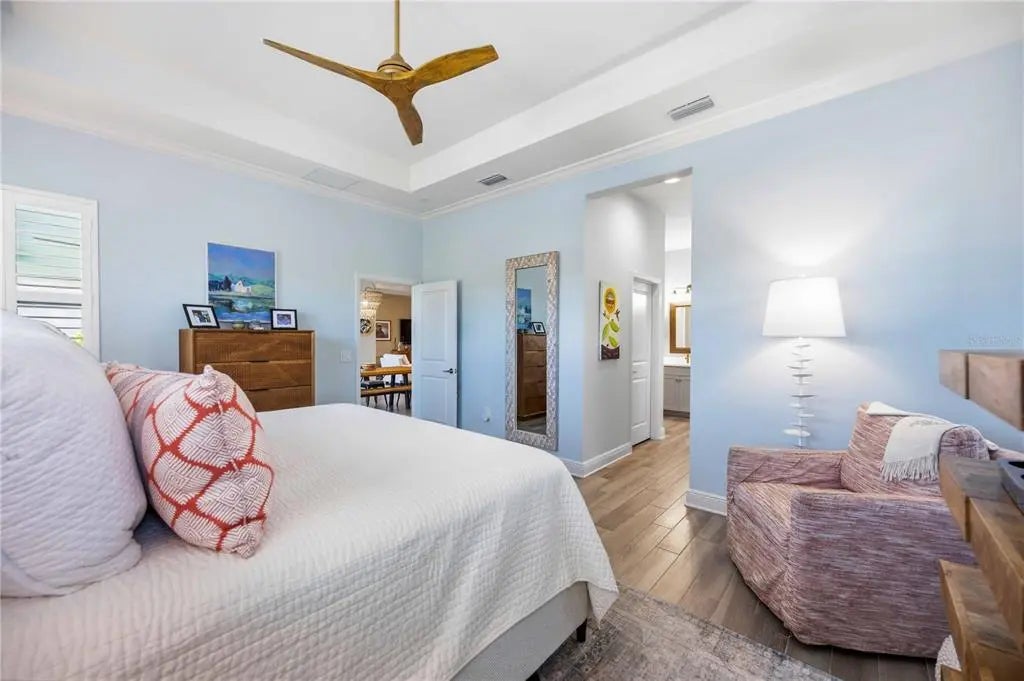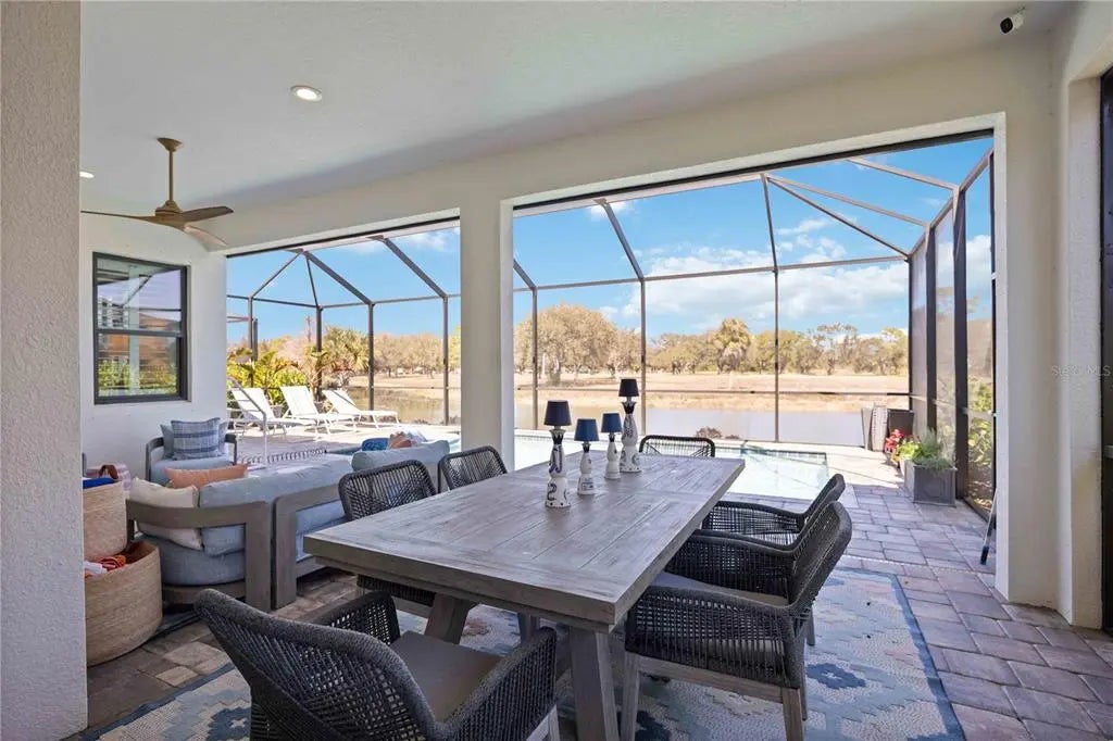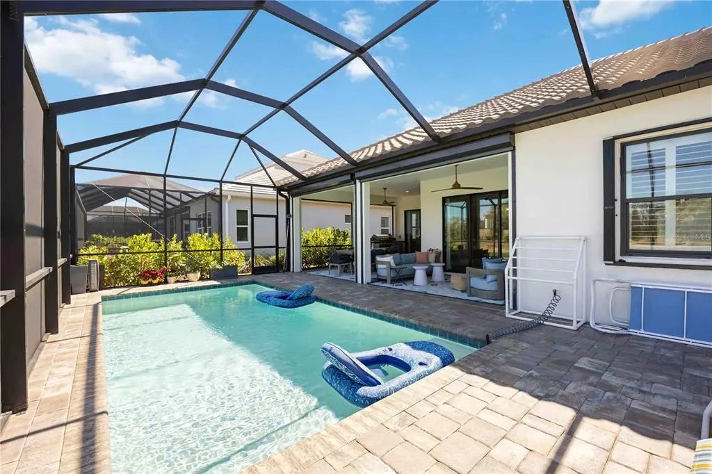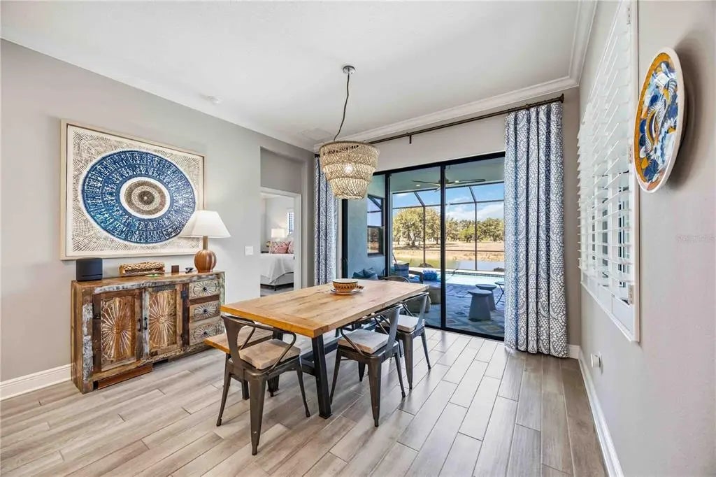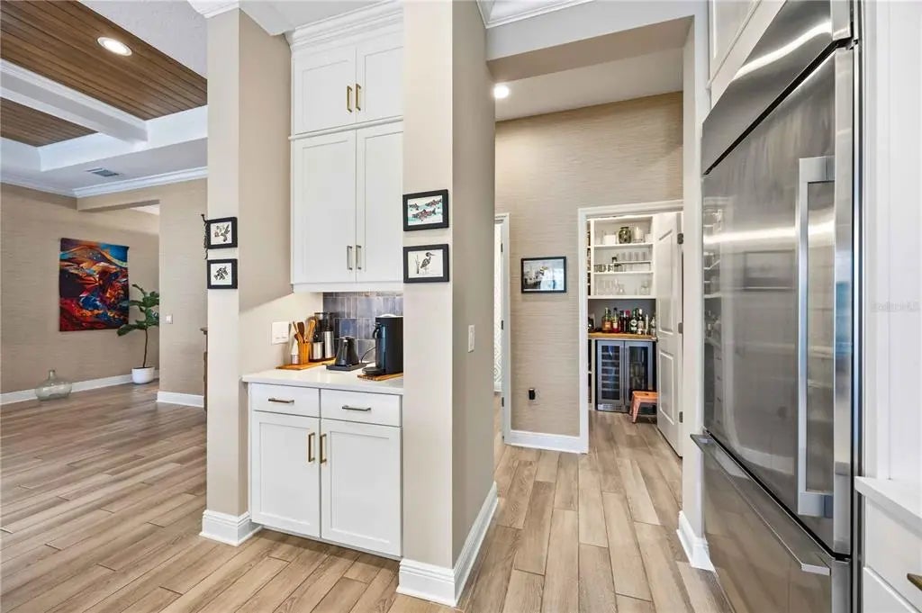 Set against a tranquil lake and preserve backdrop, this impeccably appointed residence delivers breathtaking views and effortless indoor–outdoor living. Enjoy serene moments in your private pool overlooking shimmering water and abundant wildlife, while the expansive covered lanai—beautifully finished with pavers, an oversized seating area, and a fully equipped outdoor kitchen—creates an exceptional setting for entertaining or quiet relaxation in every season. Built in late 2023, the home was thoughtfully designed for comfort, durability, and peace of mind, featuring electric roll-down hurricane screens, accordion hurricane shutters, a whole-house generator, and location within an X flood zone where flood insurance is not required. Inside, refined architectural details abound. Soaring 10-foot ceilings with crown molding, 8-foot doors, coffered and tray ceilings accented with wood-grain finishes, and luxury wood look plank tile flooring establish an elegant yet inviting atmosphere. Plantation shutters, custom drapery, designer lighting, and smart-home conveniences—including Wi-Fi thermostats and a camera doorbell—blend style with modern functionality. Two expansive sliders span the rear of the home, framing uninterrupted water views and filling the living space with natural light. A well-placed half bath adjacent to the kitchen and main living area adds everyday convenience and is ideal for guests while entertaining. The chef-inspired kitchen is a true showpiece, featuring quartz countertops, a custom backsplash, ceiling-height cabinetry with accent displays, gold hardware, a built-in refrigerator, gas range with a statement hood, built-in ovens, and a generous island with seating for six. A walk-in butler’s pantry with butcher block counters, wine refrigerator, and dedicated coffee station completes this exceptional culinary space. The Sea Mist floor plan by Neal Communities offers a serene primary suite retreat with dual custom-built walk-in closets and a spa-inspired bath showcasing a frameless glass shower with floor-to-ceiling tile, custom mirrors, and a dual-sink vanity. Two guest bedrooms share a beautifully appointed secondary bath with a large vanity and tub/shower combination. A den or office with custom built-in cabinetry provides flexible living space or an optional fourth bedroom. An oversized laundry and utility room adds everyday convenience with extensive cabinetry, a sink, folding counter, and newer washer and dryer. Additional highlights include custom closet built-ins throughout, a whole-home water filtration system, freezer in the garage, upgraded bathroom mirrors, and the option to purchase the home partially FURNISHED. Located within a private gated enclave of Grand Palm, residents enjoy maintenance-included lawn and landscape care along with resort-style amenities, including two community pools, a fitness center, and a vibrant calendar of social events. This is refined Florida living at its finest—where luxury finishes, thoughtful upgrades, and a spectacular natural setting come together in perfect harmony.