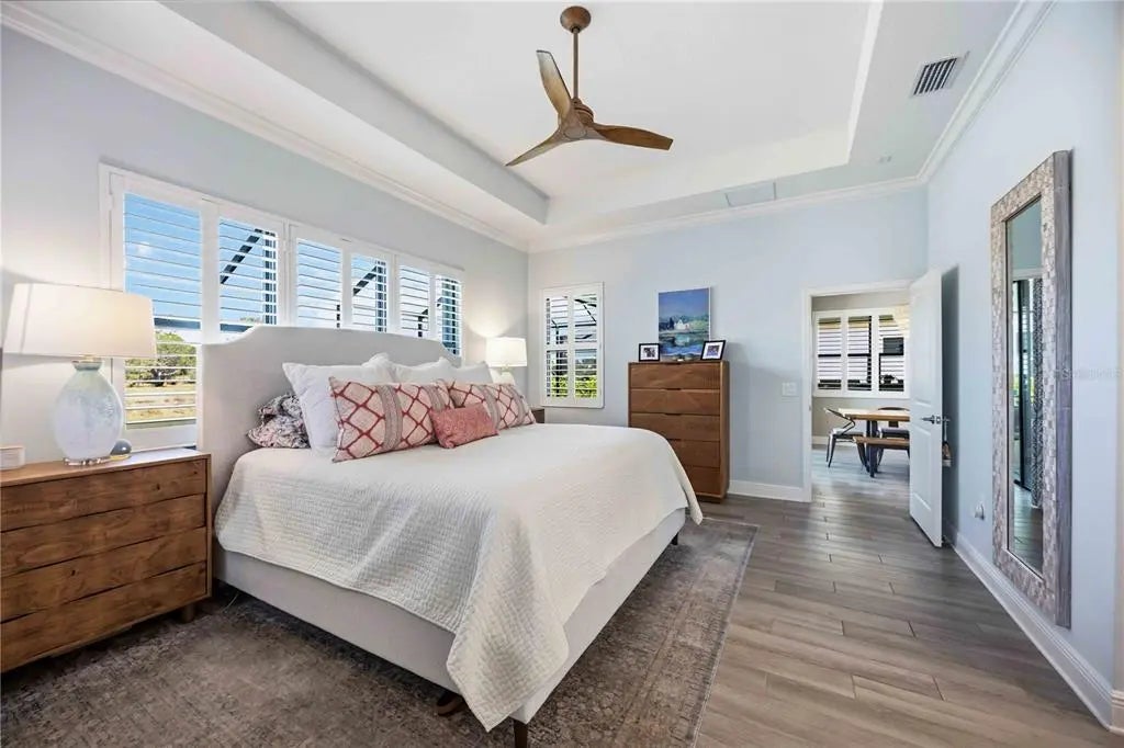 - Interior FeaturesCeiling Fan(s), Coffered Ceiling(s), Crown Molding, High Ceilings, Kitchen/Family Room Combo, Living Room/Dining Room Combo, Open Floorplan, Primary Bedroom Main Floor, Smart Home, Solid Surface Counters, Solid Wood Cabinets, Thermostat, Tray Ceiling(s), Walk-In Closet(s), Window Treatments