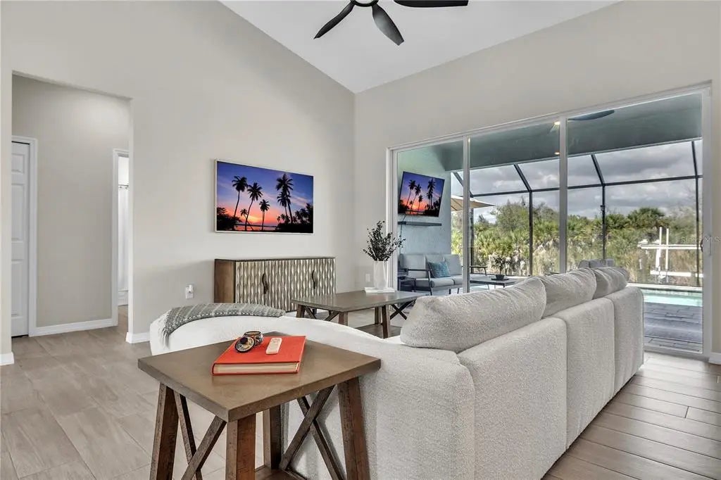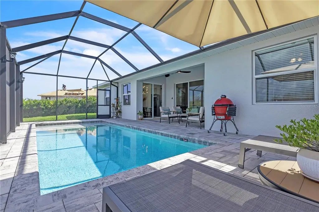 Welcome to waterfront living in the boating community of South Gulf Cove! This beautifully maintained and landscaped 3-bedroom, 2-bath home with an office sits on an oversized lot offering an impressive 106 feet of waterfront—perfect for enjoying the Florida lifestyle. Step through the foyer into an inviting open floor plan featuring a spacious living room that flows seamlessly into the kitchen and dining area. The kitchen is designed for both functionality and style, showcasing granite countertops, stainless steel appliances, and a large island with breakfast bar seating—ideal for entertaining or casual dining. The primary suite offers a peaceful retreat with a walk-in closet and an ensuite bathroom complete with a double vanity and tile shower. The home’s split floor plan provides privacy, with two guest bedrooms and a full bathroom located on the opposite side of the home. Just off the entryway, a versatile office or bonus room provides the perfect space for working from home, hobbies, or additional living space. Sliding glass doors from the living room—hurricane- and impact-resistant for added peace of mind—open to a screened-in patio with a heated pool, creating the perfect setting for relaxing or entertaining year-round. The spacious backyard is newly fenced and leads to your private dock and boat lift, making it easy to get out on the water whenever you like. You can also unwind by the water’s edge and take in the peaceful surroundings. Additional features include a freshly painted exterior (2025), a garage equipped with an electric vehicle charger, a Ring security system, and a gas generator that can be connected to the home to provide power during emergencies. Residents of South Gulf Cove enjoy access to a variety of community amenities including parks, a clubhouse, nature trails, boat ramps, picnic pavilions, pickleball courts, BBQ grills, and a kayak launch. The voluntary HOA also offers an active social calendar with clubs, committees, and events for all interests. Conveniently located near Boca Grande, Englewood Beach, and Manasota Key, this home provides easy access to some of Southwest Florida’s most beautiful beaches, boating, dining, and recreation.