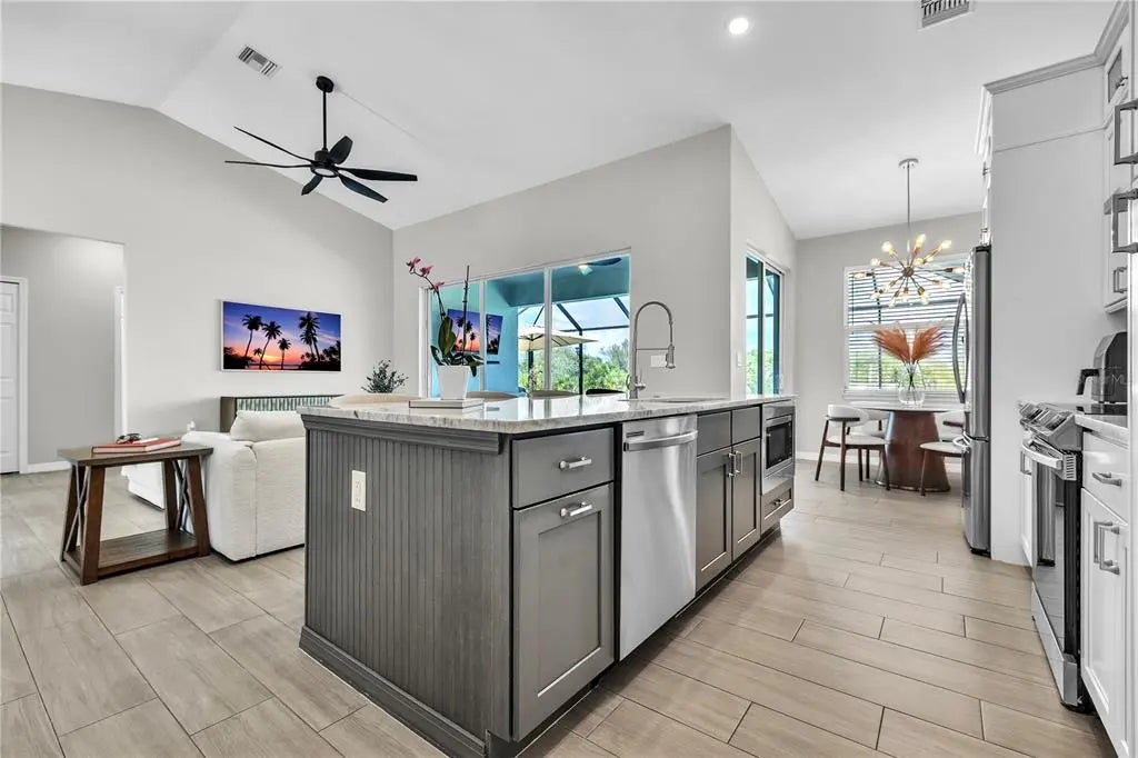 - Interior FeaturesCathedral Ceiling(s), Ceiling Fan(s), Eating Space In Kitchen, High Ceilings, Kitchen/Family Room Combo, Open Floorplan, Solid Wood Cabinets, Split Bedroom, Stone Counters, Thermostat, Walk-In Closet(s)