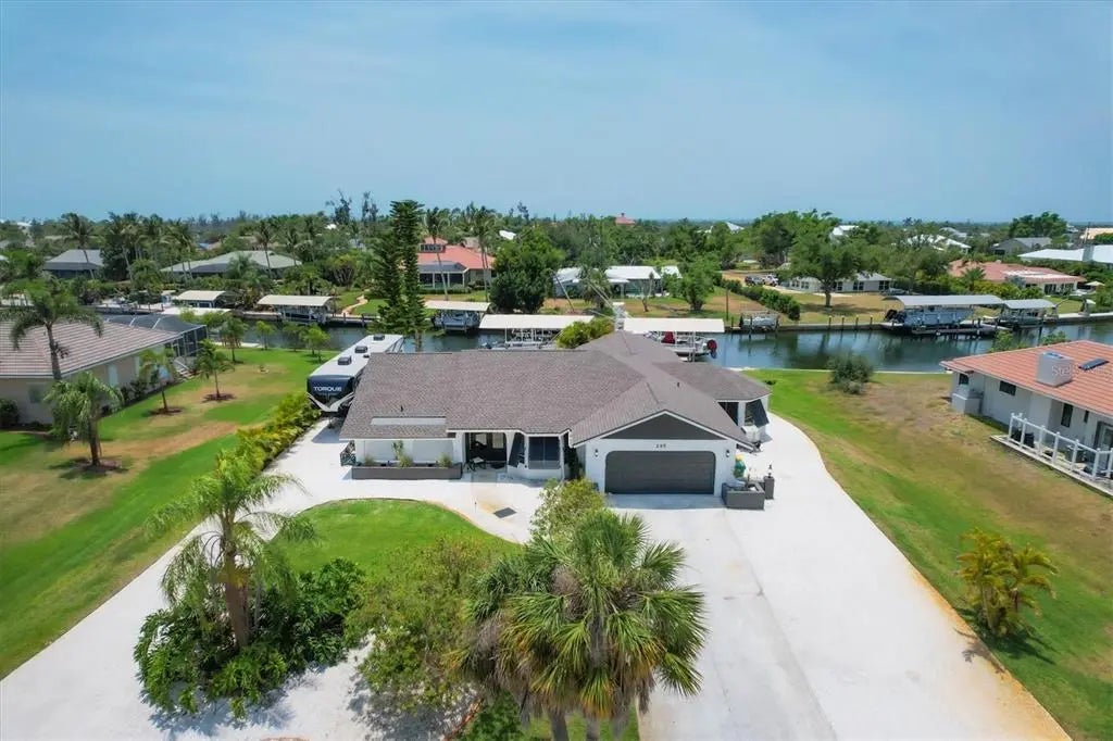 Sunsets!! Sunsets!! and more Sunsets!! While sitting in your backyard oasis enjoying the panoramic water views you will experience a different Florida sunset everyday of the year. This waterfront home offers an oversized lot (.51 acres) on a saltwater canal leading to the Intracoastal and Gulf of Mexico. If you value a great location for your activities by land or sea this home has it. Located only minutes from Boca Grande and Manasota Key beaches by car or by boat, you'll likely choose your boat. As you approach the front door you'll admire the Bahama shutters giving the home a coastal vibe. Upon entering the home, the first thing you'll notice is the spacious living area and large expansive wall of glass sliders leading to views of the pool and waterfront. You then enter the spacious kitchen which has been recently updated with plenty of counter space and cabinet storage. The kitchen opens to a spacious Family room that will probably be where you spend most of your time. As you exit the main living space to your expansive enclosed lanai your heart should really start to beat faster. This area features a large deck surrounding your pool and spa. The dock area and waterfront features are probably the most important. It allows you the ability to have your water based toys all in one spot. The area features two covered boat lifts, one being a 12,000lbs lift and the other a 16,000lbs lift, at the same time leaving room for an even bigger vessel. The home also incorporates a storage area off the back of the home for all your pool and boating items. This setup is very difficult to find and won't leave you disappointed. If you are into adventure this house needs to make your short list. Back inside the master suite is large and spacious with direct access to the lanai and pool area. It features a recently updated shower as well as plenty of storage space. The guest rooms are on the other side of the home and offer you and your guests much needed privacy. They share a recently updated bathroom and have access out to the pool area from their side of the home as well. This property has a newer roof (2023), Hurricane shutters (2020), A/C (2020), and boatlifts and canopies (2017). It also has shell landscaping over much of the property for ease of maintenance.