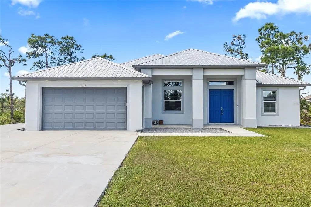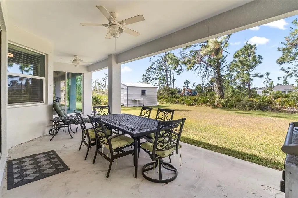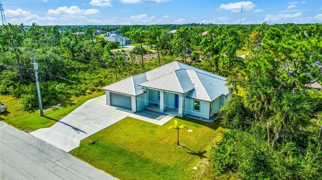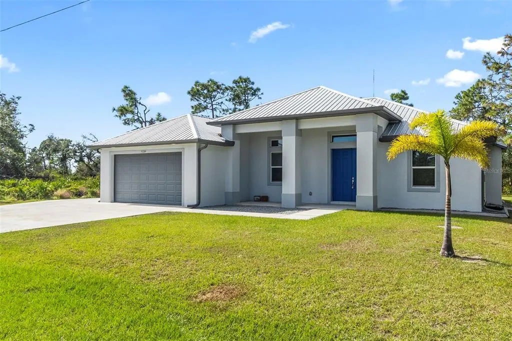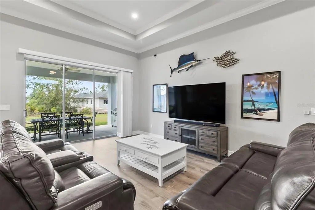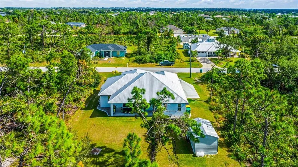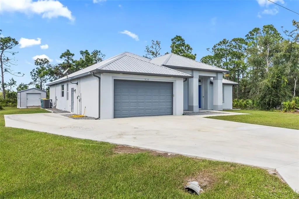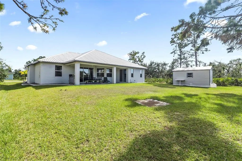 Discover elegance and tranquility in this Coastal-themed residence, crowned with a durable metal roof, perfectly situated in the heart of the Cape Haze Peninsula. Upon entering through grand 8ft double doors, you're greeted by a space designed for both stylish entertaining and cherished family moments. This home embodies luxury and comfort, boasting impeccable finishes throughout. The living room, framed by 8ft tall sliders, offers a captivating view of the spacious backyard, creating a seamless indoor-outdoor experience. Luxury vinyl flooring enhances the entire home, complementing the large great room and the serene master suite, which features an exquisite walk-in shower and a luxurious soaker tub. Generously sized guest bedrooms ensure comfort for family and visitors alike. Thoughtfully designed hallways promote a natural flow throughout the home, while soaring ceilings, crown molding, and tray ceilings add sophistication and charm. The gourmet kitchen is a chef's delight, equipped with 42” crowned cabinets, stainless steel appliances, and a substantial island for culinary creations. Rarely found in homes of this size, a den/office provides additional flexibility and space. Step onto the expansive lanai, offering limitless possibilities to enjoy Florida's delightful year-round weather. The oversized garage easily accommodates full-size trucks or SUVs, complemented by a paved side driveway perfect for storing a boat or RV. An additional shed provides extra storage or workspace. Whether you're savoring the serene surroundings at home, exploring the area's numerous golf courses, or basking in the nearby beaches, this home epitomizes the Florida lifestyle at its finest, enhanced by its elegant and durable metal roof.
