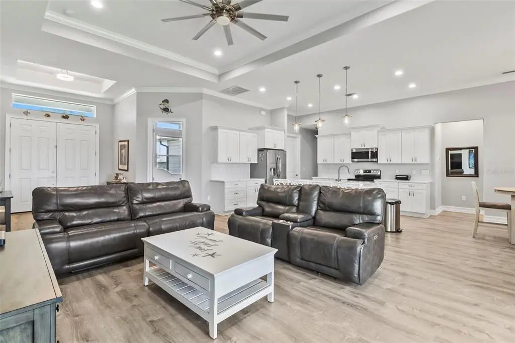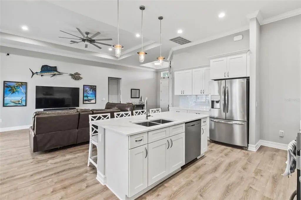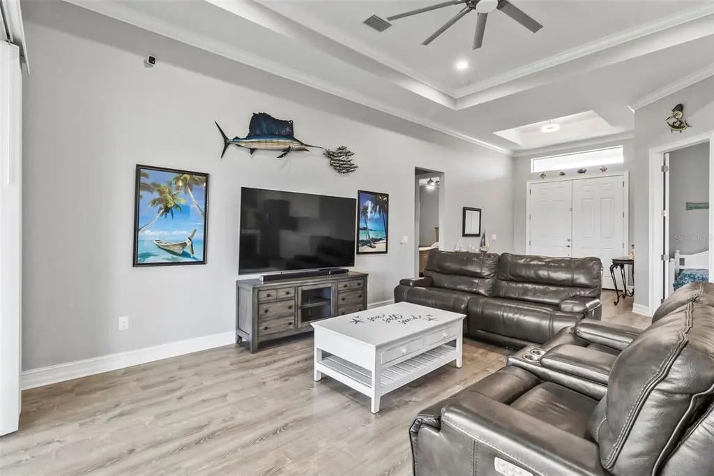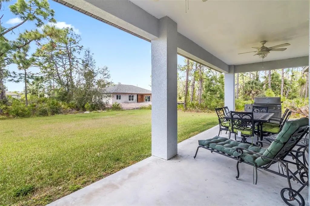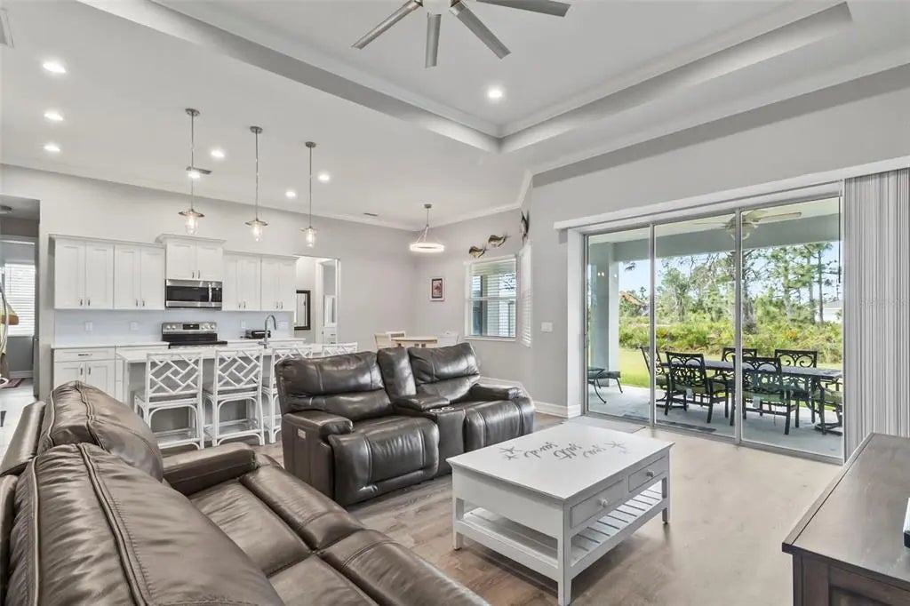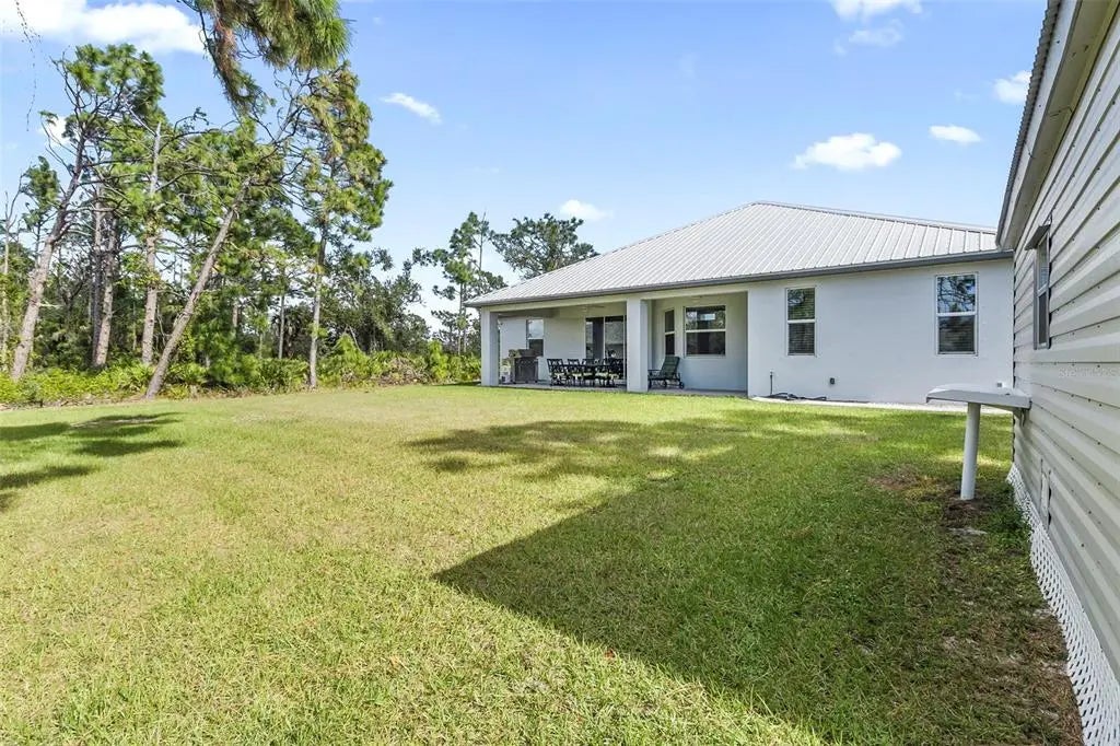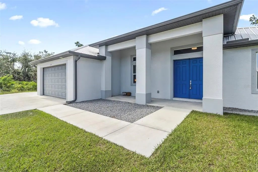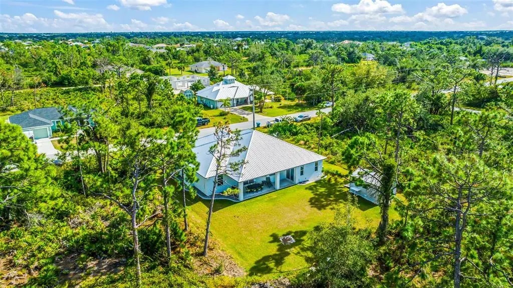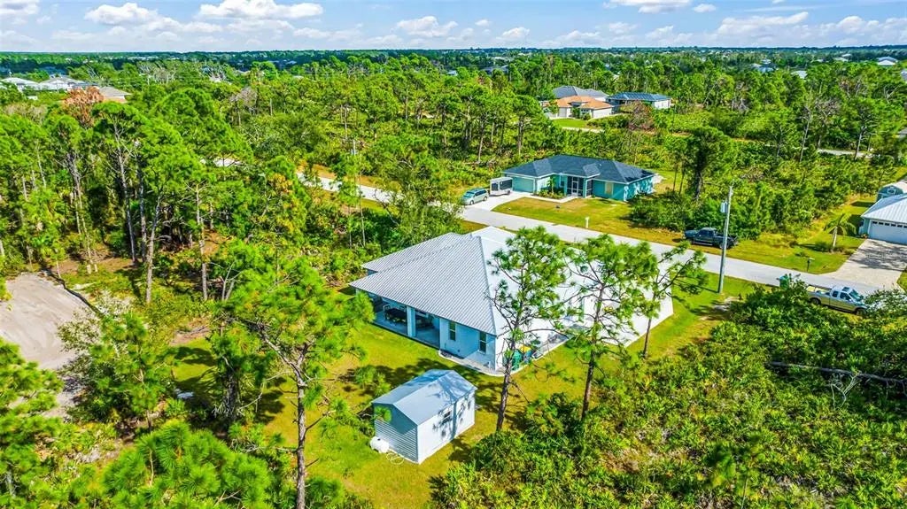 Discover elegance and tranquility in this Coastal-themed residence, crowned with a durable metal roof, perfectly situated in the heart of the Cape Haze Peninsula. Upon entering through grand 8ft double doors, you're greeted by a space designed for both stylish entertaining and cherished family moments. This home embodies luxury and comfort, boasting impeccable finishes throughout. The living room, framed by 8ft tall sliders, offers a captivating view of the spacious backyard, creating a seamless indoor-outdoor experience. Luxury vinyl flooring enhances the entire home, complementing the large great room and the serene master suite, which features an exquisite walk-in shower and a luxurious soaker tub. Generously sized guest bedrooms ensure comfort for family and visitors alike. Thoughtfully designed hallways promote a natural flow throughout the home, while soaring ceilings, crown molding, and tray ceilings add sophistication and charm. The gourmet kitchen is a chef's delight, equipped with 42” crowned cabinets, stainless steel appliances, and a substantial island for culinary creations. Rarely found in homes of this size, a den/office provides additional flexibility and space. Step onto the expansive lanai, offering limitless possibilities to enjoy Florida's delightful year-round weather. The oversized garage easily accommodates full-size trucks or SUVs, complemented by a paved side driveway perfect for storing a boat or RV. An additional shed provides extra storage or workspace. Whether you're savoring the serene surroundings at home, exploring the area's numerous golf courses, or basking in the nearby beaches, this home epitomizes the Florida lifestyle at its finest, enhanced by its elegant and durable metal roof.
