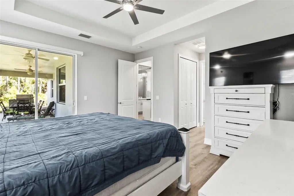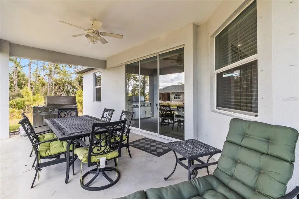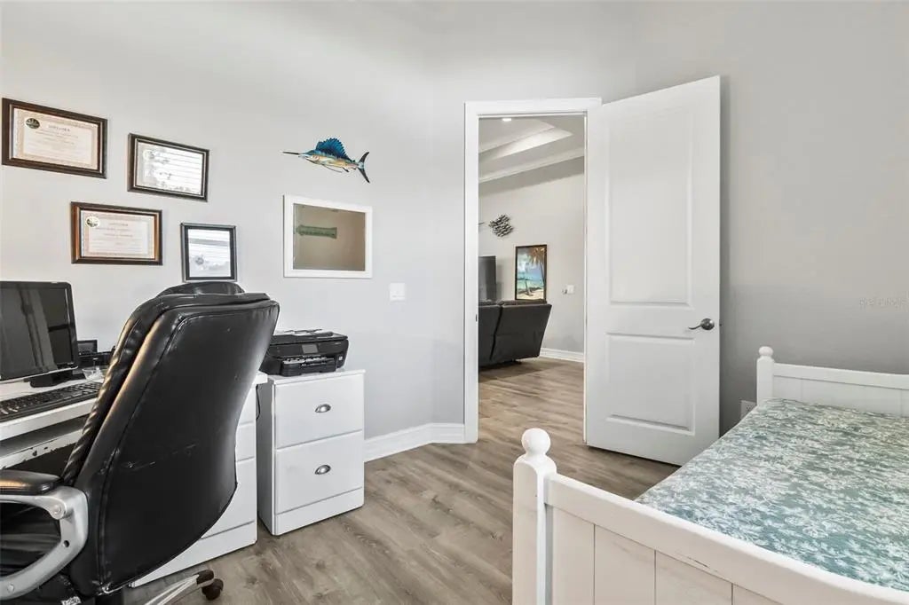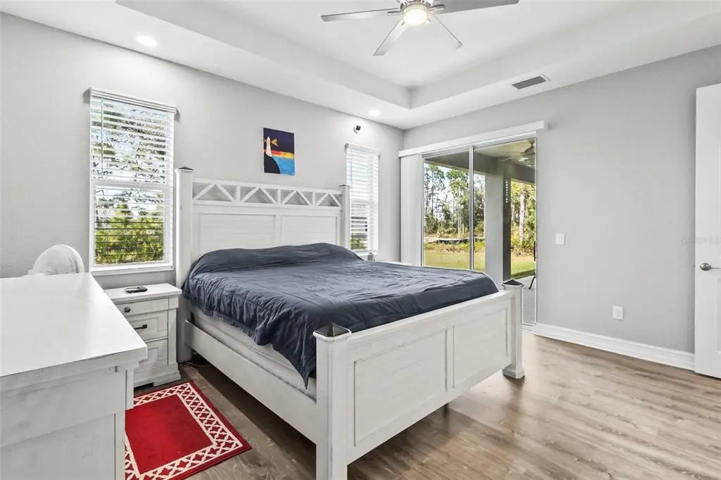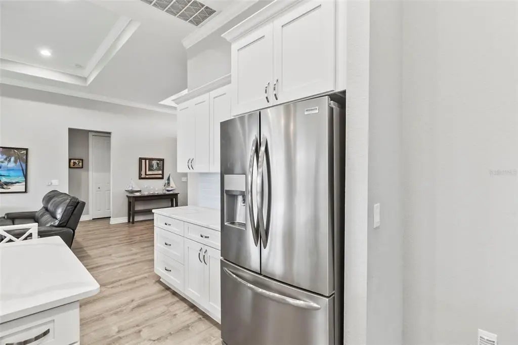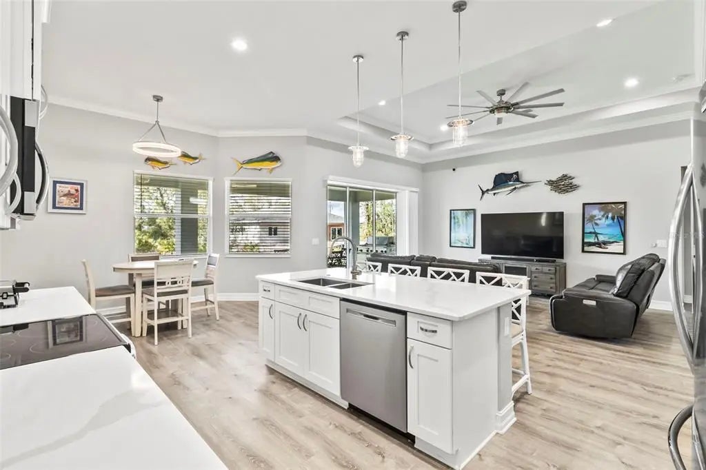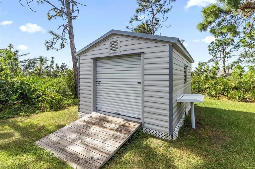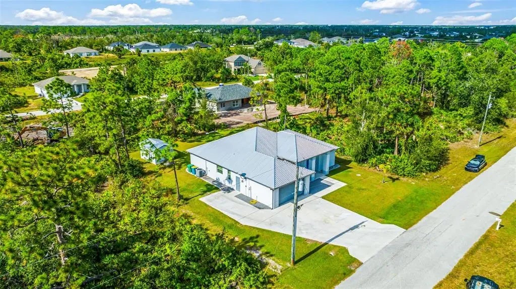 Discover elegance and tranquility in this Coastal-themed residence, crowned with a durable metal roof, perfectly situated in the heart of the Cape Haze Peninsula. Upon entering through grand 8ft double doors, you're greeted by a space designed for both stylish entertaining and cherished family moments. This home embodies luxury and comfort, boasting impeccable finishes throughout. The living room, framed by 8ft tall sliders, offers a captivating view of the spacious backyard, creating a seamless indoor-outdoor experience. Luxury vinyl flooring enhances the entire home, complementing the large great room and the serene master suite, which features an exquisite walk-in shower and a luxurious soaker tub. Generously sized guest bedrooms ensure comfort for family and visitors alike. Thoughtfully designed hallways promote a natural flow throughout the home, while soaring ceilings, crown molding, and tray ceilings add sophistication and charm. The gourmet kitchen is a chef's delight, equipped with 42” crowned cabinets, stainless steel appliances, and a substantial island for culinary creations. Rarely found in homes of this size, a den/office provides additional flexibility and space. Step onto the expansive lanai, offering limitless possibilities to enjoy Florida's delightful year-round weather. The oversized garage easily accommodates full-size trucks or SUVs, complemented by a paved side driveway perfect for storing a boat or RV. An additional shed provides extra storage or workspace. Whether you're savoring the serene surroundings at home, exploring the area's numerous golf courses, or basking in the nearby beaches, this home epitomizes the Florida lifestyle at its finest, enhanced by its elegant and durable metal roof.