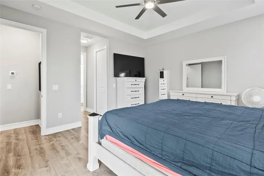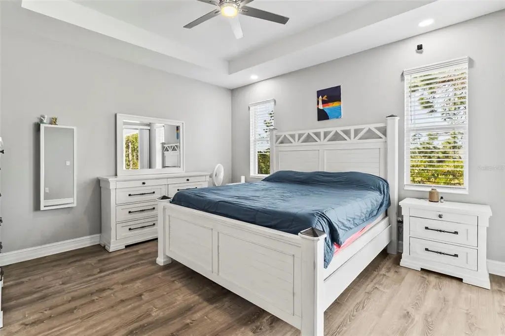 - Interior FeaturesCeiling Fan(s), High Ceilings, Kitchen/Family Room Combo, Open Floorplan, Solid Surface Counters, Tray Ceiling(s), Window Treatments