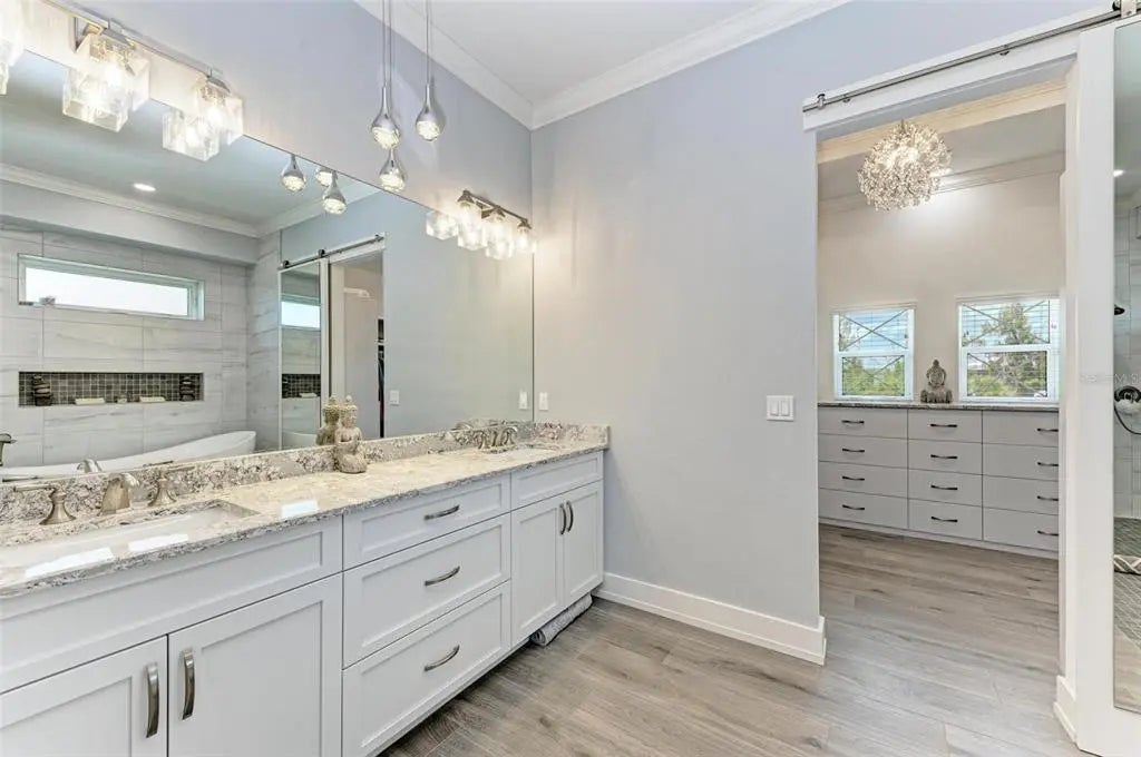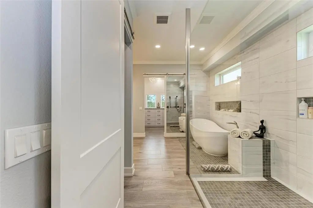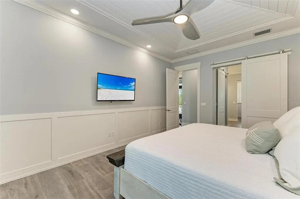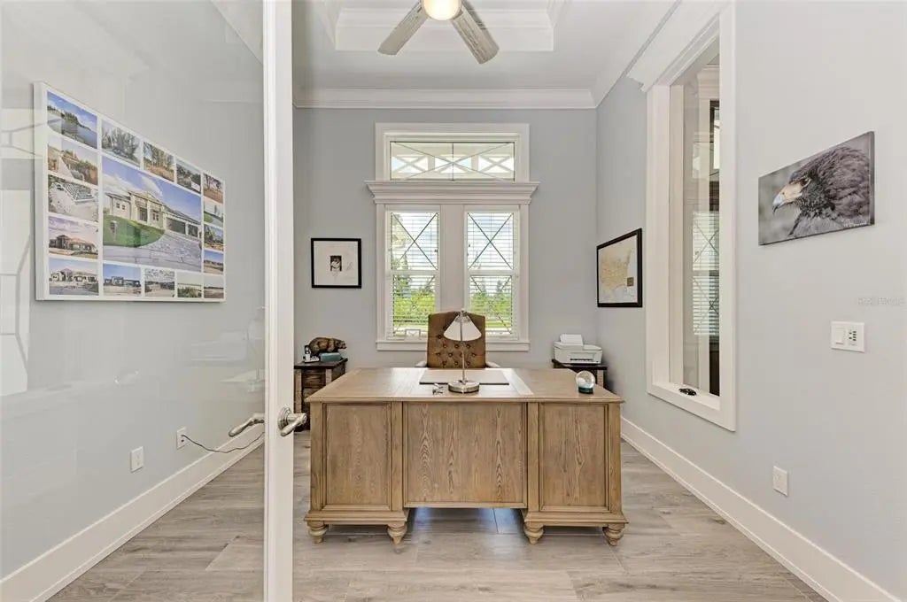 - Interior FeaturesCeiling Fan(s), Crown Molding, Eating Space In Kitchen, High Ceilings, Open Floorplan, Primary Bedroom Main Floor, Solid Surface Counters, Solid Wood Cabinets, Split Bedroom, Stone Counters, Thermostat, Tray Ceiling(s), Vaulted Ceiling(s), Walk-In Closet(s), Window Treatments