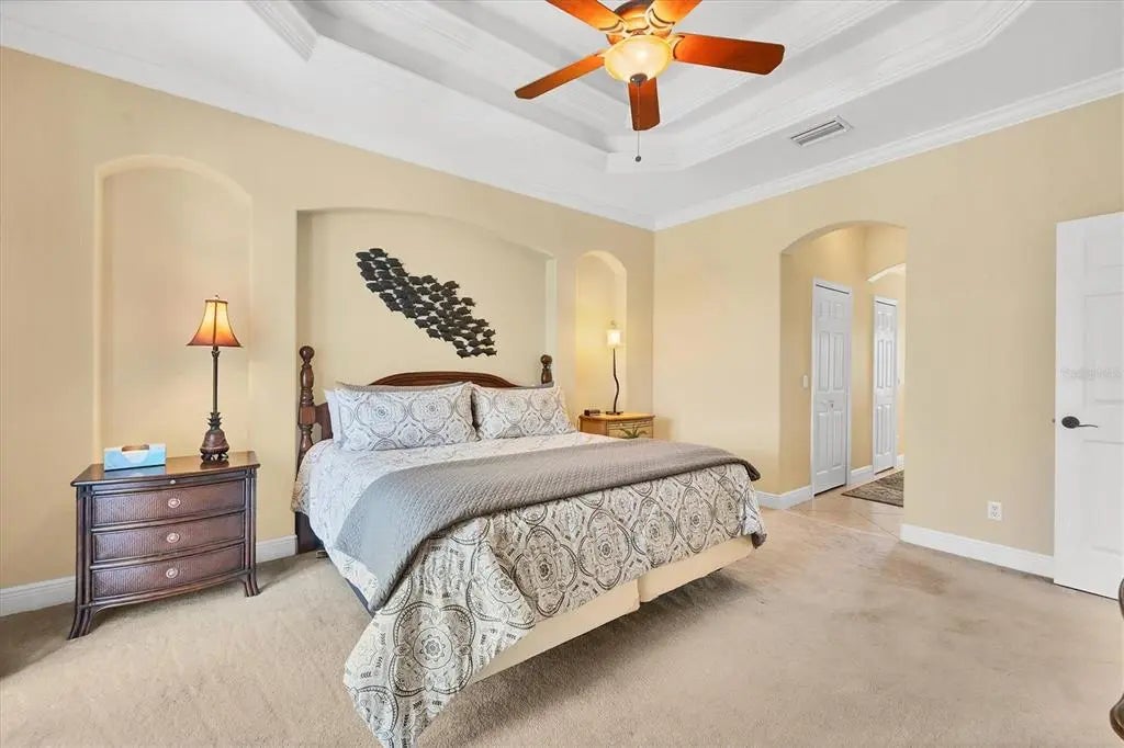 - Interior FeaturesCeiling Fan(s), Crown Molding, Eating Space In Kitchen, Kitchen/Family Room Combo, Solid Surface Counters, Split Bedroom, Thermostat, Tray Ceiling(s), Walk-In Closet(s), Window Treatments