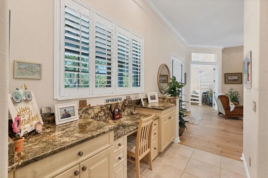- Interior FeaturesCeiling Fan(s), Crown Molding, High Ceilings, Kitchen/Family Room Combo, Open Floorplan, Solid Surface Counters, Stone Counters, Thermostat, Walk-In Closet(s), Window Treatments