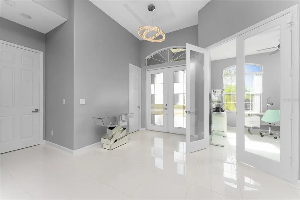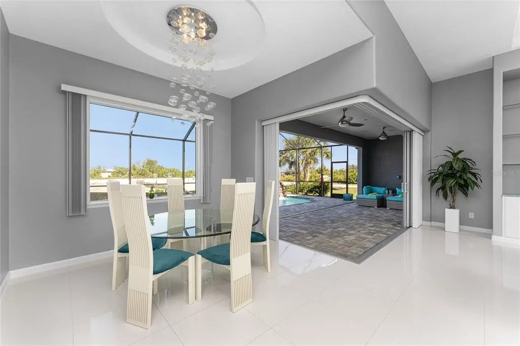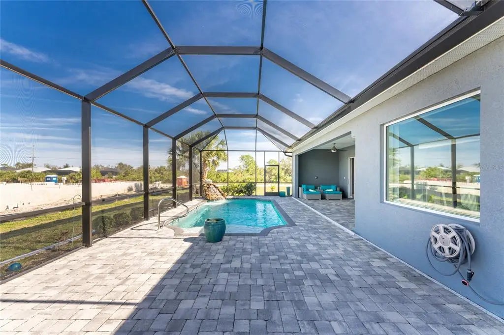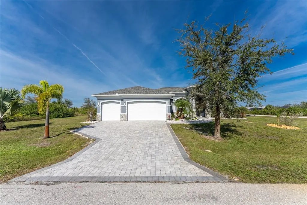 Welcome to this meticulously maintained 3-bedroom, 2-bathroom home plus den that offers an impressive 2,115 sq. ft. of living space. Set on a large double lot, this home has been thoughtfully designed, blending modern amenities with luxurious finishes. Boasting a new HVAC V/S motor and deluxe UV light installed in February 2022, along with fresh interior and exterior paint, this home is move-in ready and perfect for anyone looking for a stylish, worry-free lifestyle. The culinary kitchen, is a true chef’s paradise! This gourmet kitchen is outfitted with stunning aqua onyx countertops, a beautiful glass tile backsplash, and an expansive double island—perfect for entertaining or casual family meals. The sleek glass cooktop and abundance of soft-close cabinets and drawers provide both style and function, making cooking a true joy. This open and airy floor plan is enhanced by soaring high ceilings and elegant touches, including double tray ceilings in the living area, a circular tray ceiling in the dining room, and tray ceilings in the foyer. The open concept seamlessly connects the living room, dining area, and kitchen, with pocket sliding doors leading to the gorgeous pool area, perfect for enjoying Florida’s indoor-outdoor lifestyle. Entertaining made easy with The great room that features a striking built-in electric fireplace, framed by custom-built shelving. A state-of-the-art 8-speaker stereo system runs throughout the great room, kitchen, primary bedroom, and lanai, making it ideal for hosting gatherings or simply enjoying music throughout your home. Step outside to your private oasis featuring a luxurious heated saltwater pool with a sun shelf and a tranquil waterfall feature. This space is perfect for both relaxation and entertaining guests in the gorgeous Florida weather. The spacious primary bedroom features ample walk-in closets to accommodate all your storage needs, while the high-end finishes provide a sense of retreat and relaxation. The primary bathroom is a spa-like retreat, with an oversized walk-through shower featuring dual shower heads for an ultimate luxury experience. This home offers a split floor plan with 2 bedrooms and a guest bathroom that offers a beautifully tiled walk-in shower with direct access to the pool area—perfect for rinsing off after a swim. The large laundry room offers Topaz Gem countertops, extensive cabinetry, and a convenient laundry tub. The home is equipped with hurricane windows throughout and a lanai panel for added protection during storm season. New roof installed in 2023, 2x2 porcelain tile throughout, and a Rain Soft water treatment system, installed in October 2019, ensures high-quality water for everyday use. The exterior of the home is just as stunning as the interior, featuring a beautifully paved driveway that leads up to the insulated 3-car garage with epoxy-coated flooring. Lush landscaping, mature plants, irrigation system and white Caribbean beach pebbles add to the home’s appeal. Fenced in pet area with 2 gates provide a safe haven for your pets. This home is truly a showstopper, offering a blend of luxurious features, thoughtful upgrades, and a prime location in South Gulf Cove. Whether you’re looking for a peaceful retreat or an entertainer’s dream home, this property has everything you need and more.