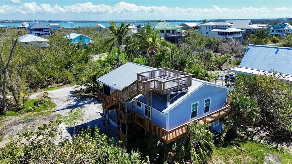 PRICE REDUCED. This 2 bedroom, 2 bathroom home is located in Gaspar’s Hideaway on Little Gasparilla Island, a bridgeless barrier island located off the coast of the Cape Haze peninsula. The open floorplan has a large living room, dining room, and kitchen area great for entertaining. The spacious screened in front porch, which has pocketing sliding glass doors, is the perfect place to sit and relax among the tropical setting. The bedrooms are split, the primary bedroom has an en-suite bathroom. There is a roof top deck area where you can see the gulf and the bay and you can watch the beautiful sunrises and sunsets. Downstairs under the home there is a large deck with seating area, outdoor shower, golf cart parking, laundry/storage room, and a bonus bedroom and ½ bath. There is deeded dockage for your boat and deeded beach access. The beach access is a short walk from the home and there is 3 ½ miles of beautiful beach to walk, swim, collect shells and sharks teeth, fish, or just sit and soak up the sun. If you have been looking for a quiet and unique place to get away Little Gasparilla Island is for you. No stores, restaurants, or cars, just sandy trails, tropical foliage, and friendly neighbors. Call to set an appointment to come and see this home and see what island life is like.