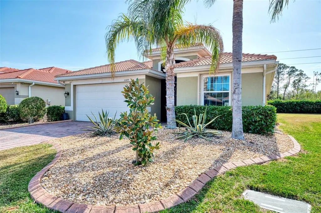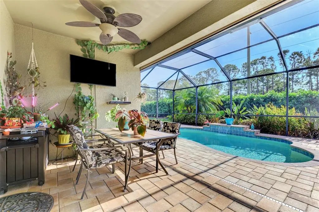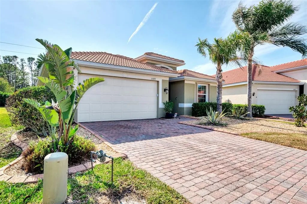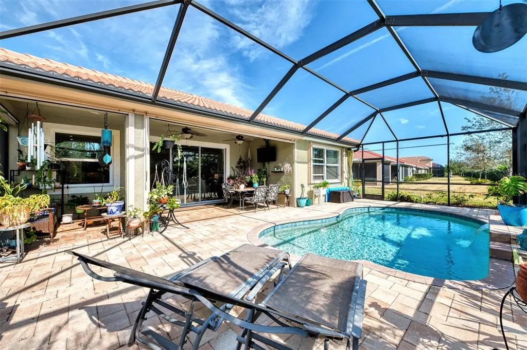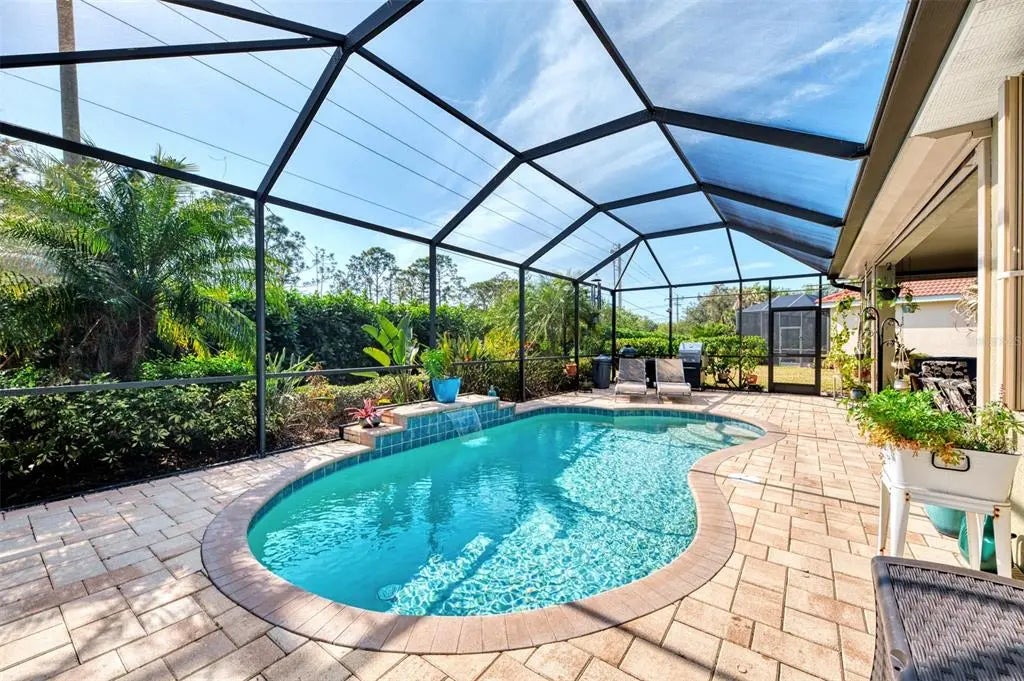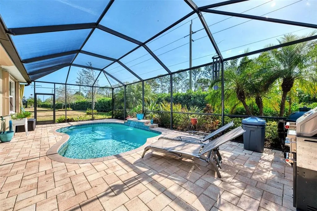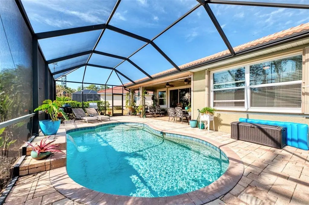 Under contract-accepting backup offers. Stunning Pool Home in the Desirable Community of Caribbean Village in Venice, FL. Welcome to 11479 Blackfin St, a beautifully designed Edison floor plan with 3-bedrooms, 2-bathrooms, plus a DEN/FLEX ROOM WITH GLASS DOUBLE DOORS, offers a perfect blend of comfort, functionality, and modern elegance. Enjoy the Florida lifestyle at its finest with your very own PRIVATE POOL, complete with a HEATER, WATER FEATURE, and a large screened lanai – perfect for outdoor relaxation and entertaining. The spacious kitchen is a chef's dream, featuring a large island that comfortably seats 4 and opens to the living and dining areas, making it ideal for family gatherings and socializing. GRANITE COUNTERTOPS IN KITCHENS AND BATHS, UNDER CABINET LIGHTING, GLASS BACKSPLASH, CROWN MOLDING, 8-FOOT DOORS, and LARGE DIAGONAL TILE FLOORING add a touch of luxury. The home is equipped with ceiling fans for comfort and upgraded features such as blinds on all windows and a UV LIGHT SANITIZER FOR THE HVAC SYSTEM. The pool area is a true standout, with the POOL PUMP REPLACED in 2020 and the POOL HEATER INSTALLED in 2018. Additional features include UPGRADED ACCORDION HURRICANE SHUTTER AND ROLL-DOWN STORM SCREEN FOR THE LANAI AND FRONT ENTRANCE (a $20K Value), whole-house gutters, and a surge protector for the electrical panel. For added convenience, the home is PRE-WIRED FOR A GENERATOR and a GENERATOR INTERLOCK SYSTEM IS ALREADY IN PLACE. The living room, entryway, master bedroom and bathroom have TRAY CEILINGS for added elegance. The property also boasts EPOXY FLOORING IN GARAGE and landscape edging for a polished look. PATIO FURNITURE INCLUDED. Located JUST 7 MILES FROM THE BEAUTIFUL BEACHES OF VENICE and offering easy access to I-75, this home is in a prime location (NOT IN A FLOOD ZONE) close to golfing, restaurants, Wellen Park, and historic downtown Venice. Enjoy the best of Florida living in a maintenance-free community with two gated entrances, a community pool with clubhouse, fitness center, and bocce ball courts. With low HOA fees and no CDD, this home provides both luxury and affordability. Don't miss out on this opportunity—schedule your showing today and be sure to check out the virtual tour, which includes a walking tour of Venice! This home is move-in ready and waiting for you to make it your own. Lanai furniture on site, master bedroom furniture, TV's and brown desk in guest bedroom will convey at no charge. Cameras on site.