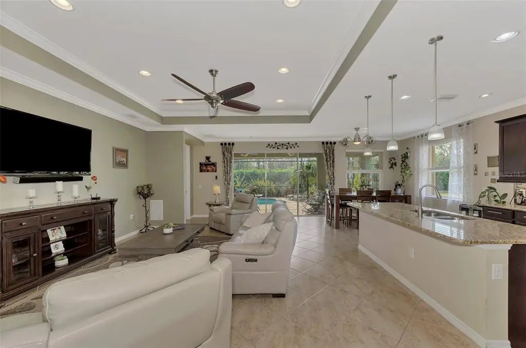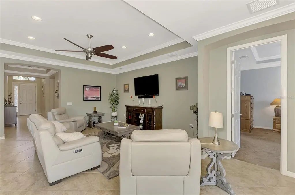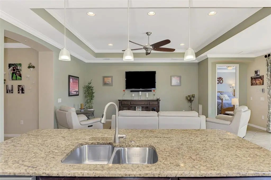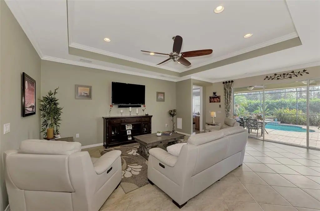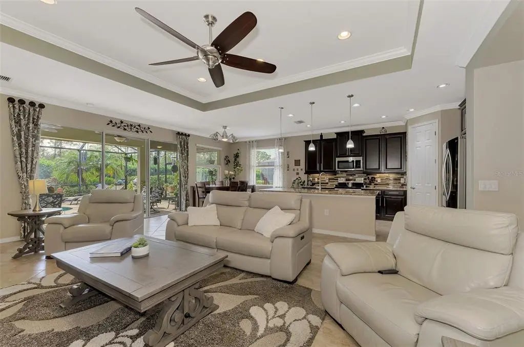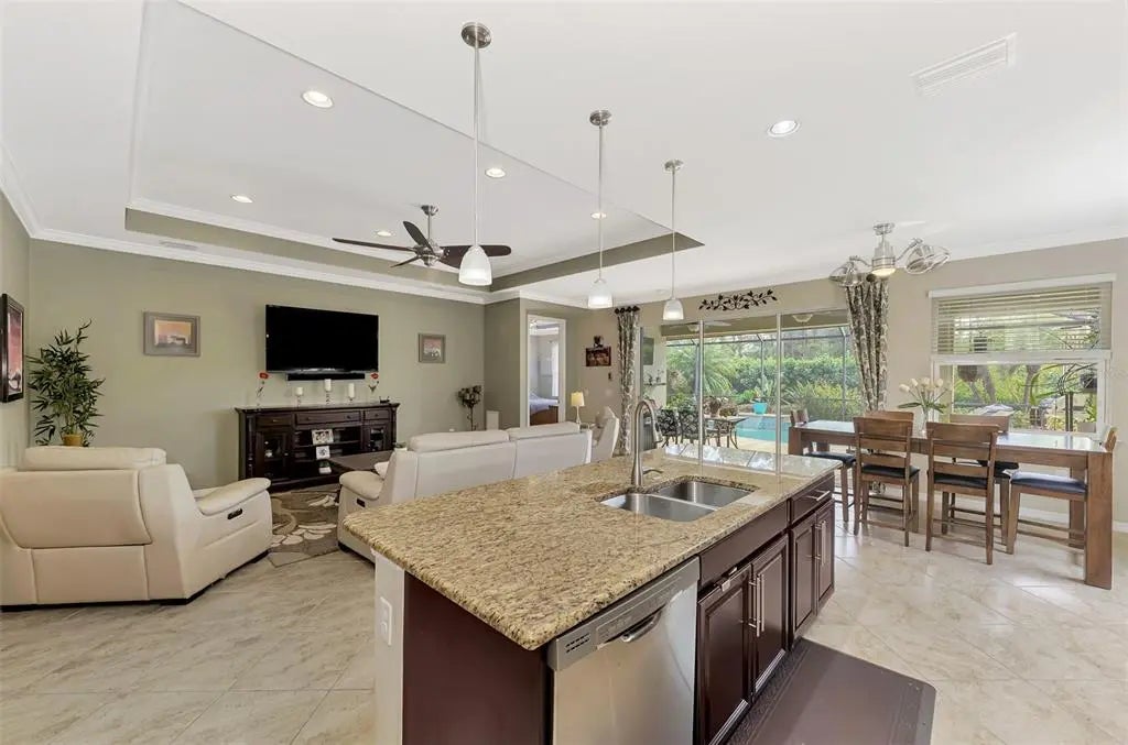 Under contract-accepting backup offers. Stunning Pool Home in the Desirable Community of Caribbean Village in Venice, FL. Welcome to 11479 Blackfin St, a beautifully designed Edison floor plan with 3-bedrooms, 2-bathrooms, plus a DEN/FLEX ROOM WITH GLASS DOUBLE DOORS, offers a perfect blend of comfort, functionality, and modern elegance. Enjoy the Florida lifestyle at its finest with your very own PRIVATE POOL, complete with a HEATER, WATER FEATURE, and a large screened lanai – perfect for outdoor relaxation and entertaining. The spacious kitchen is a chef's dream, featuring a large island that comfortably seats 4 and opens to the living and dining areas, making it ideal for family gatherings and socializing. GRANITE COUNTERTOPS IN KITCHENS AND BATHS, UNDER CABINET LIGHTING, GLASS BACKSPLASH, CROWN MOLDING, 8-FOOT DOORS, and LARGE DIAGONAL TILE FLOORING add a touch of luxury. The home is equipped with ceiling fans for comfort and upgraded features such as blinds on all windows and a UV LIGHT SANITIZER FOR THE HVAC SYSTEM. The pool area is a true standout, with the POOL PUMP REPLACED in 2020 and the POOL HEATER INSTALLED in 2018. Additional features include UPGRADED ACCORDION HURRICANE SHUTTER AND ROLL-DOWN STORM SCREEN FOR THE LANAI AND FRONT ENTRANCE (a $20K Value), whole-house gutters, and a surge protector for the electrical panel. For added convenience, the home is PRE-WIRED FOR A GENERATOR and a GENERATOR INTERLOCK SYSTEM IS ALREADY IN PLACE. The living room, entryway, master bedroom and bathroom have TRAY CEILINGS for added elegance. The property also boasts EPOXY FLOORING IN GARAGE and landscape edging for a polished look. PATIO FURNITURE INCLUDED. Located JUST 7 MILES FROM THE BEAUTIFUL BEACHES OF VENICE and offering easy access to I-75, this home is in a prime location (NOT IN A FLOOD ZONE) close to golfing, restaurants, Wellen Park, and historic downtown Venice. Enjoy the best of Florida living in a maintenance-free community with two gated entrances, a community pool with clubhouse, fitness center, and bocce ball courts. With low HOA fees and no CDD, this home provides both luxury and affordability. Don't miss out on this opportunity—schedule your showing today and be sure to check out the virtual tour, which includes a walking tour of Venice! This home is move-in ready and waiting for you to make it your own. Lanai furniture on site, master bedroom furniture, TV's and brown desk in guest bedroom will convey at no charge. Cameras on site.