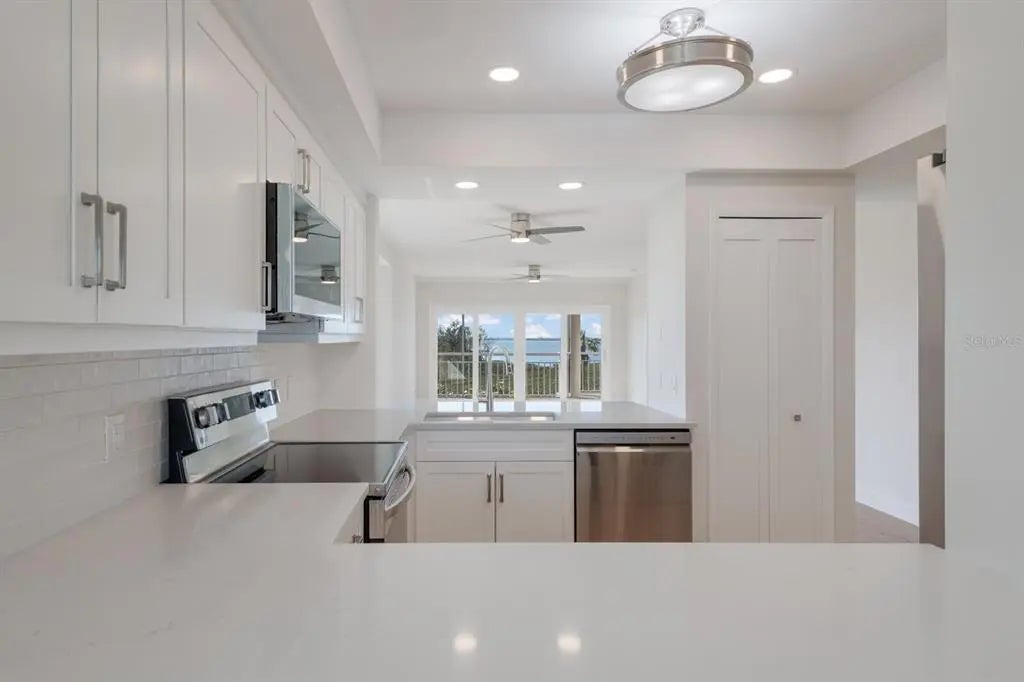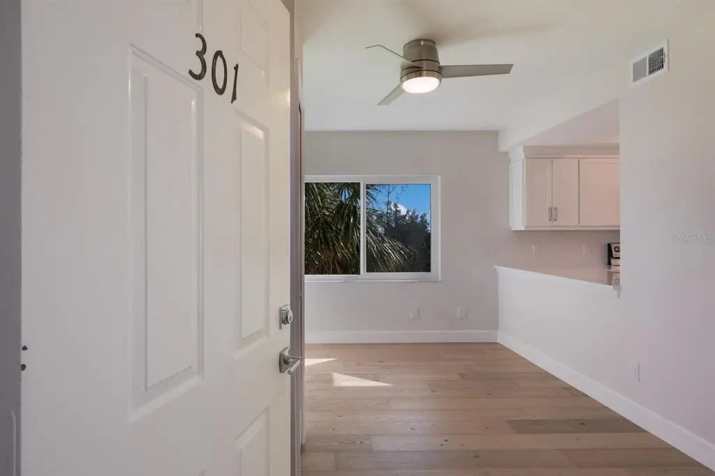 Brand new renovated waterfront condo now available for purchase! This deluxe 2 bedroom 2 bath end unit overlooks Placida Sound and is located within a short walk to the pickle ball courts and heated pool & spa. Seagate Development Group performed this luxurious renovation with similar premium finishes used during the construction of Hill Tide Estates residences on Boca Grande. Built to last with newly installed hurricane impact windows and doors, this elevated concrete unit offers convenient access to the elevator and stairways leading to parking garage & private storage room. Interior finishes feature European white oak wood flooring, premium quartz solid countertops, and new stainless-steel appliances. Relax in the lush VIP bathroom suite thoughtfully modified to present a showcase walk in glass marble tile laid shower and a massive double vanity highlighted by stone countertops and wood cabinetry. The kitchen floorplan was also improved to create additional ceiling height, expansive cabinetry storage, and a unique water view breakfast bar. In addition, this exclusive coastal retreat provides a recreational lifestyle offering social activities unique to the area with a soon to be remodeled clubhouse and fitness center equipped with new exercise equipment, and two additional clubhouses, each offering a heated swimming pool and tropical walkways. Placida Harbour also includes a boat basin marina with deep-water docks equipped with power, water, and storage, providing direct access to Placida Sound, Charlotte Harbor, & the Gulf of America. Residents and guests will enjoy the ferry taxi service with daily transport to another private beach club on the pristine secluded beaches of Little Gasparilla Island! ***Some of the club photos taken were prior to 2024 storms.