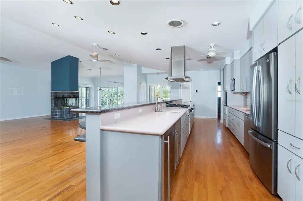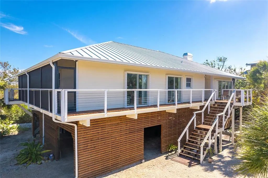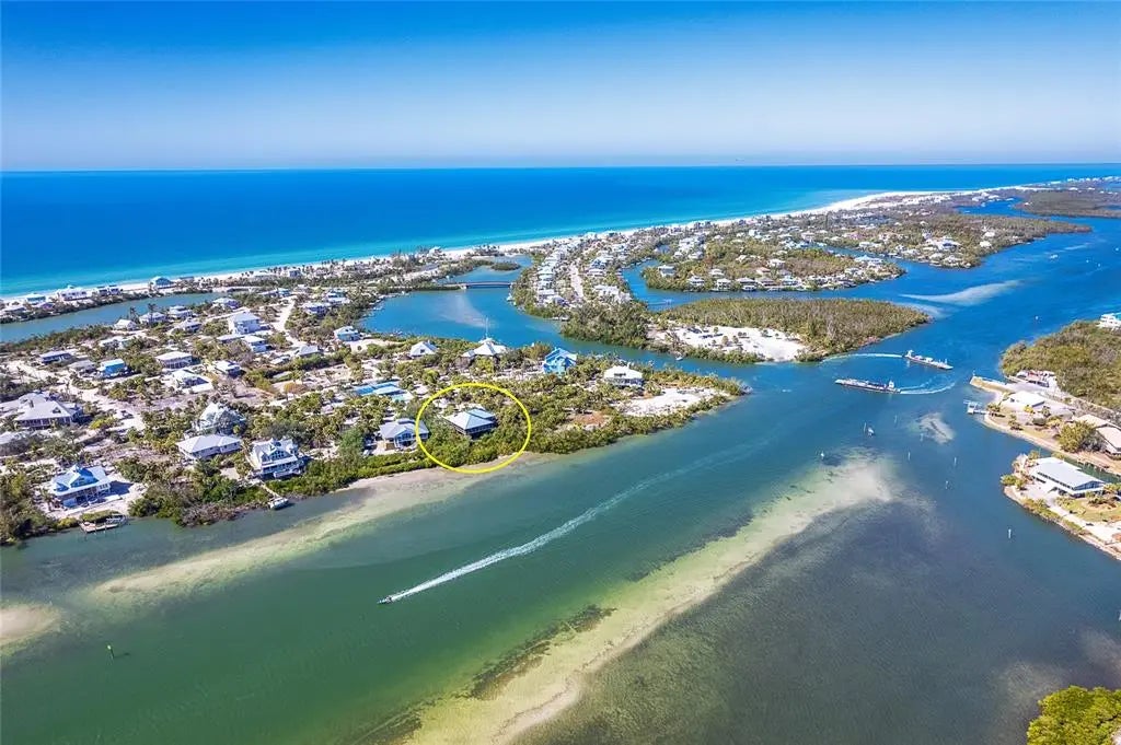 Sleek and sophisticated home in the private and secluded development of Pointe Bocilla. Custom designed and modern, yet laid back enough for island living. With the open living room and gourmet kitchen, it is perfect for entertaining or just relaxing with the island breezes wafting through. Sliders in the living area and primary bedroom retract into the walls so you feel as if you are sitting outdoors in the lush tropical setting. Native low maintenance landscaping abounds! The red oak floors in the living area ooze warmth, the fireplace between the dining and living area make cozy the word that comes to mind. The gourmet kitchen is a delight for the one who cooks, with stainless steel appliances, gas Viking cooktop, convection oven with pizza stone, warming drawer and two wine coolers. The primary suite is separate from the two guest bedrooms making this home ideal for hosting friends and family. There are views of the Intracoastal Waterway from the living area, primary bedroom and rear deck, which also includes a mini outdoor kitchen with large gas grill. This home has a new roof and gutters, screens, crab trap, AC, hot water heater, refrigerator, elevator, interior and exterior paint, lighting, fans, tile and carpeting. There are hurricane shutters for all windows. Pointe Bocilla has only 12 homesites. It's amenities include a heated pool, tennis court and deeded deep water dock. Don Pedro-Knight-Palm Island is a bridgeless, barrier island situated between Sarasota/Tampa to the north and Ft. Myers/Naples to the south. It is accessible only via private boat or a 4 minute car passenger ferry. Your island dream home awaits!!!