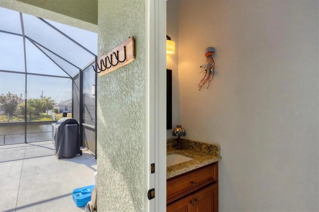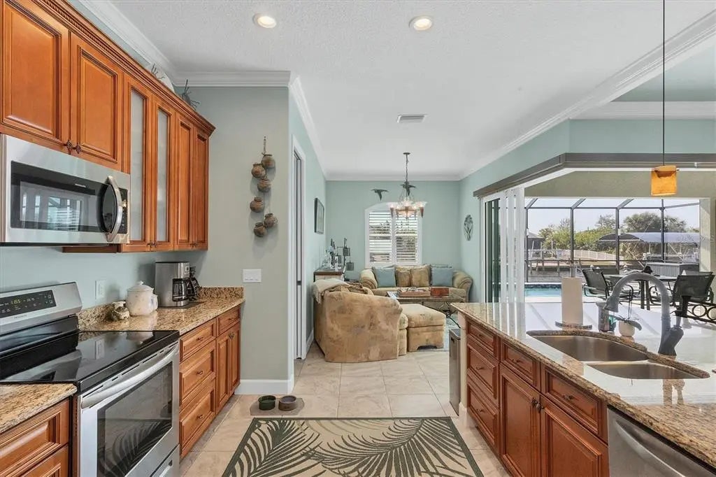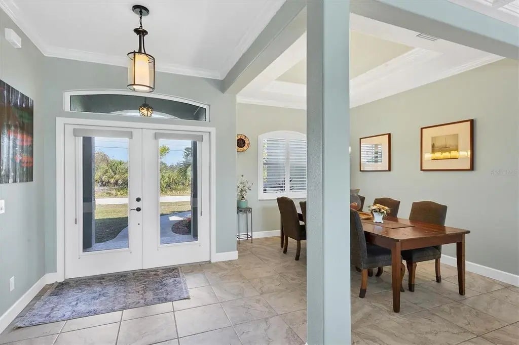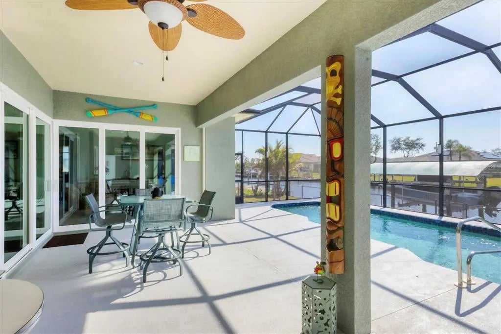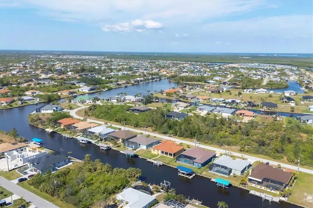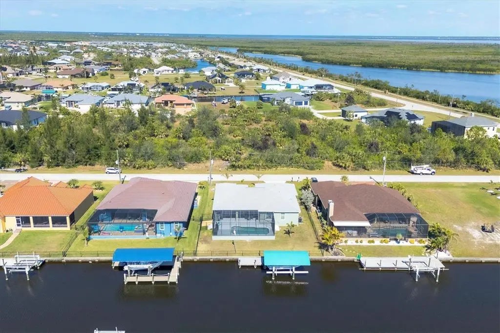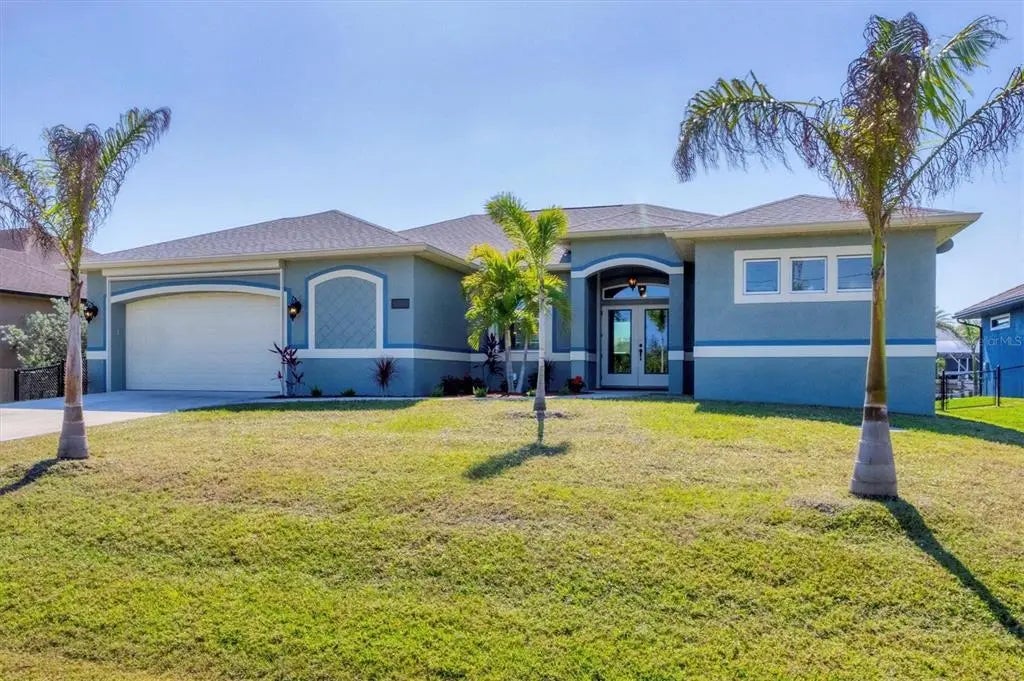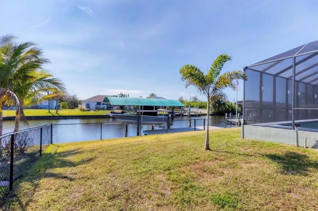 Location, location! South Gulf Cove welcomes you to the Florida lifestyle, in one of the most desirable areas of Port Charlotte. As you enter your view of the lanai and waterway is wide open through zero corner sliders that line the main living area. These literally bring the outdoors in and double your living space. The living room/great room is spacious with a beautiful coffered tray ceiling, and adjoining dining room will compliment your special gatherings. These flow to the open kitchen featuring an oversized granite breakfast bar with plenty of room for preparing and serving. Crowned wood cabinets, stainless appliances, walk in pantry and an cooktop make your life easy. Serve your feast in the large dinette area, which is also open to the beautiful views outdoors. The master suite is lovely with two HUGE closets, and the ensuite features a walk through shower with two rainheads. The guest bedrooms in this split plan can be closed off for privacy. The finishes in this home are lovely, with crowned molding throughout, tray ceilings, elegant light and fan fixtures. Practical features include impact glass, panels for the lanai sliders, concrete seawall, bonus area in garage. The garage also featured an remote control roll down bug screen. The salt water heated pool surrounded by multicolored LED lights and lanai complete your outdoor living, with an additional half bath. Electric Hurricane roll down shutter protect the front and back of the house. The house also features a wired in surge protector, a dog walk, 10k boat lift, new roof (2023), New salt water generator (2025), Interior and exterior paint. Imagine the wonderful times you can spend entertaining family and friends, or just relax enjoying life.