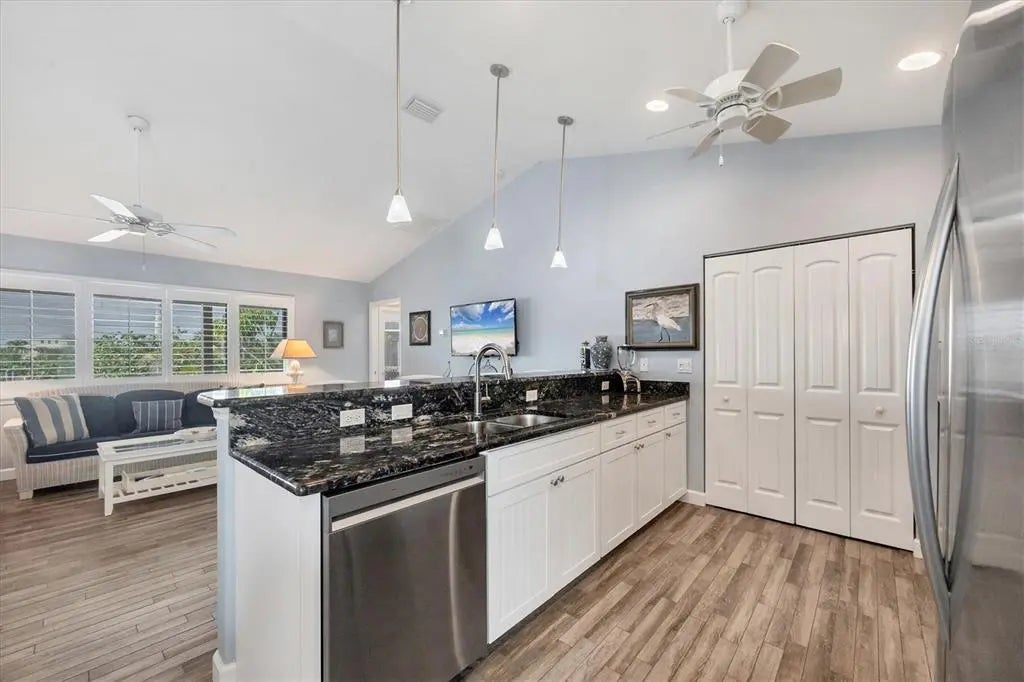 - Interior FeaturesCathedral Ceiling(s), Ceiling Fan(s), Coffered Ceiling(s), Eating Space In Kitchen, High Ceilings, Kitchen/Family Room Combo, Open Floorplan, Primary Bedroom Main Floor, Solid Wood Cabinets, Split Bedroom, Stone Counters, Thermostat, Vaulted Ceiling(s), Walk-In Closet(s), Window Treatments