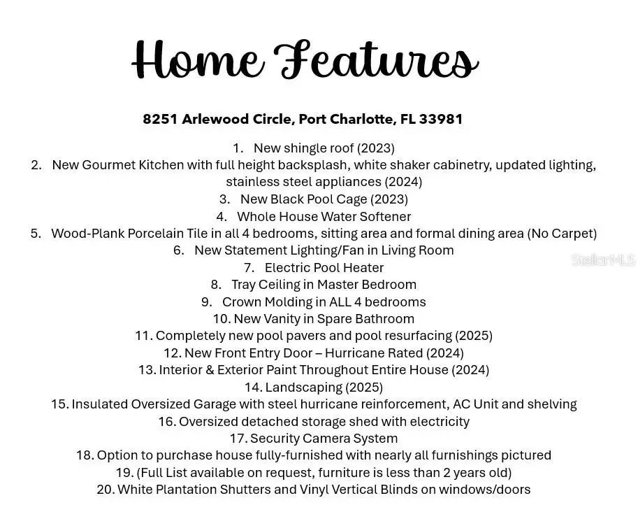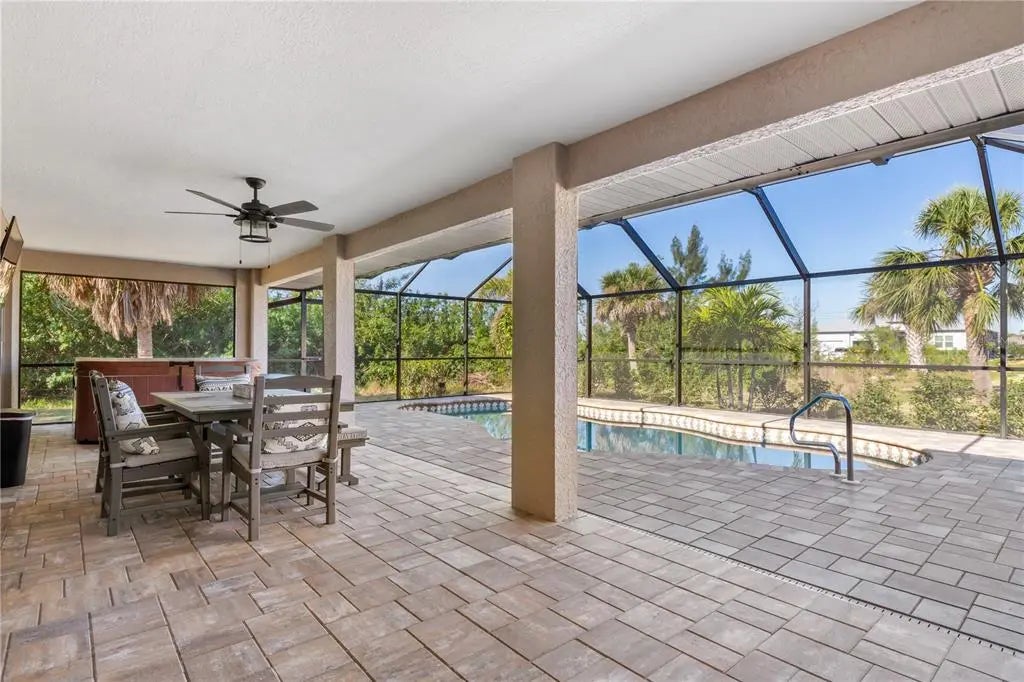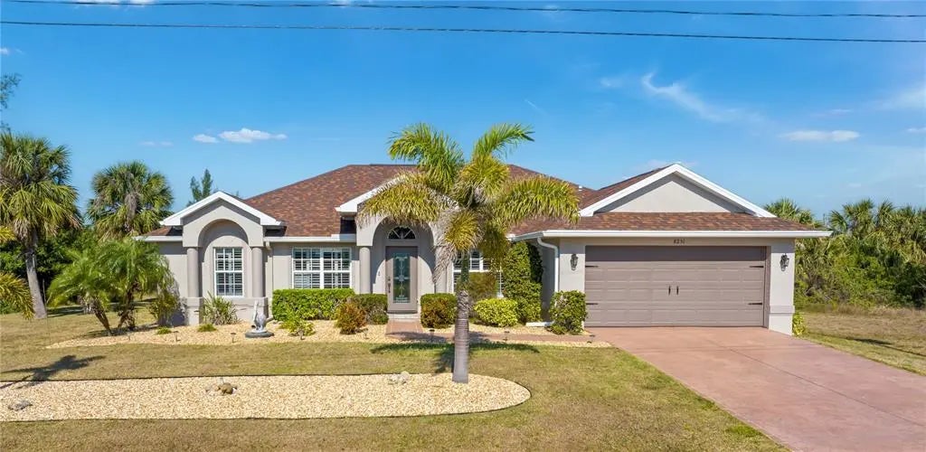 Welcome to South Gulf Cove, a "Waterfront Sanctuary" Community. The curb appeal is undeniable as high-end homes adorn this street. This home sits right across the street from the canal front in the highly sought after Section 93 of the community. Upon arrival, you'll notice the exterior pops with a fresh coat of neutral paint and mature landscaping. Take note in the photos of all the brand-new furnishings, with a few exceptions, all of these pieces are negotiable! Enter through your brand-new, hurricane rated front door and you'll notice beautiful plantation shutters and a freshly painted neutral interior. You’ll be in awe at the abundance of the natural light filling the grand living room with cathedral ceilings. The sitting room invites you to have your morning coffee with breathtaking views of an EASTERN sunrise. Make your way into the open concept kitchen and living space complimented by 2 sets of sliders overlooking your HUGE LANAI and heated, saltwater, RESURFACED pool with all new pool pavers (2025) and above ground hot-tub. What’s more, a new black pool cage was installed in (2023) as well as a NEW ROOF (2023). FULL-TIME owners took immense pride in their home with the impressive number of recent upgrades, including a COMPLETE KITCHEN REMODEL (2024) featuring gorgeous granite countertops with a full height backsplash, white shaker cabinetry, sleek stainless-steel appliances and a farmers sink as well as a whole-house water softener. Make your way over to the primary suite, this tranquil bedroom provides stunning tray ceilings, crown-molding, a walk-in closet and direct access to the pool and above ground jetted hot tub. The ensuite bathroom features a large dual-sink vanity, tiled shower and soaker tub. The signature split floorplan has THREE more bedrooms complete with crown-molding, WOOD-PLANK TILE FLOORS and a second full-bathroom with a new vanity, tiled shower/tub combo and an exterior door to the pool. A hot commodity also sits just outside of your pool cage, A LARGE DEATTACHED WORKSHOP with ELECTRICITY is large enough to fit your Sunday Convertible and/or all your holiday décor, lawn equipment and tools. This highly sought after perk, provides extra storage space for all your needs while freeing up your OVERSIZED, AIR-CONDITIONED, INSULATED garage to use how you see fit, complete with a new garage-door opener (2024). Newly planted privacy bushes line the back property line and will give you an extra layer of greenscape privacy. Perhaps you want to own a double-lot? Privacy is yours with empty lots on either side of you, one of which is currently on the market for purchase on a separate contract. This location cannot be duplicated – South Gulf Cove has a Voluntary HOA - which includes access to the beautiful clubhouse and massive outdoor Pavillion area, Community Boat Ramp, Playgrounds and more. You’re in close proximity to beautiful local beaches on Boca Grande Island, Don Pedro Island and Manasota Beaches. GOLF COURSES, local restaurants, live music and shopping are in every direction whether you’re headed north towards Englewood, Wellen Park, Venice or Sarasota or south towards Punta Gorda - Fisherman’s Village, Fort Myers and Naples. Three major airports are all within 30 minutes to 1 hour of this lovely home. Don’t miss this exceptional opportunity to own your gorgeous coastal retreat! Schedule a private showing today - this one will not disappoint. Owner is also offering a 1 year home warranty with purchase.