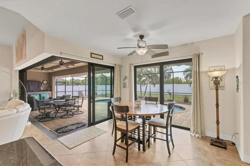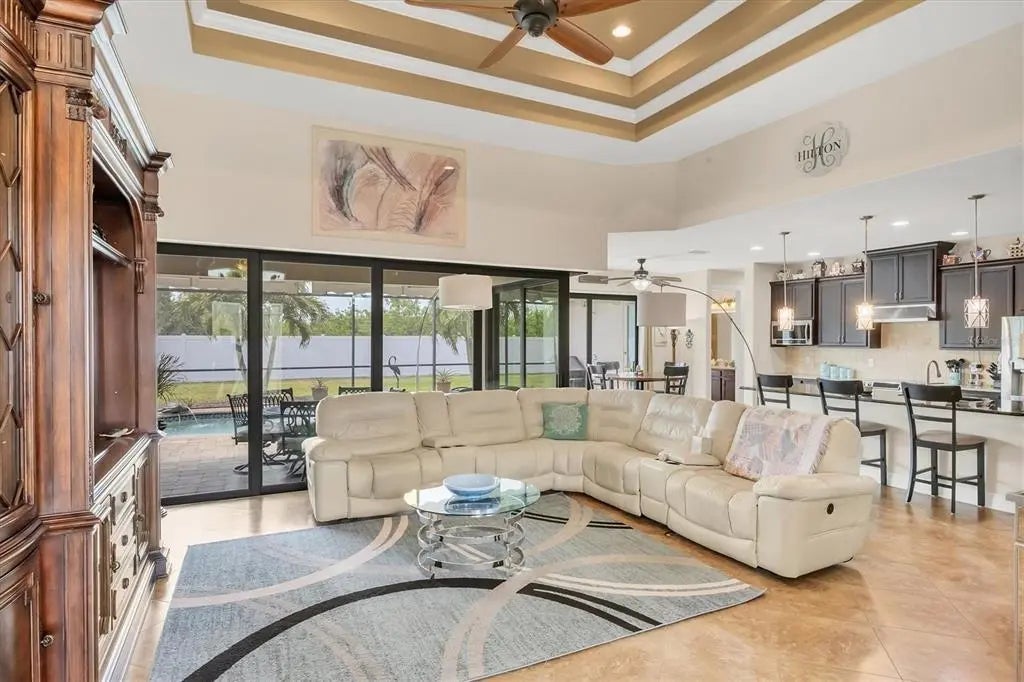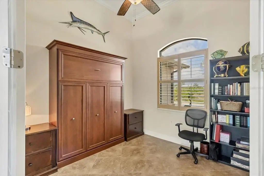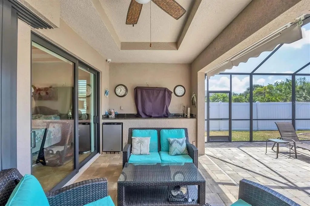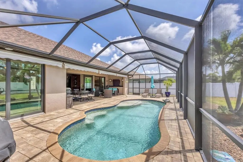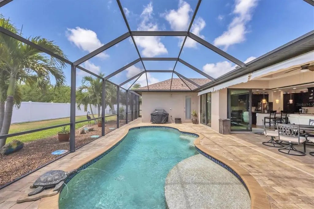 Under contract-accepting backup offers. Situated on a sprawling double lot in the desirable waterfront community of South Gulf Cove, this custom-built DM Dean home is a true Florida gem. From the moment you arrive, the curb appeal is undeniable—stone landscaping, mature palms, concrete curbing, and an extra-wide paver driveway set the tone. The entire property is fully fenced, offering both beauty and privacy, and the extended paver pathway guides you to the elegant double-door entry. Step inside, and you're immediately welcomed by a stunning view—thanks to a full wall of zero-degree pocketing sliding glass doors that open up to the outdoor living space, blurring the line between indoors and out. The expansive living room features a tray ceiling and is filled with natural light, highlighting the tasteful tile flooring that runs throughout the entire home. Just off the main living space, French doors lead you to a private den complete with a built-in Murphy bed—perfect for a guest room, office, or flex space. The heart of the home is the chef’s kitchen, where form meets function. A massive granite island offers ample prep and seating space, surrounded by upgraded soft-close cabinetry, stainless steel appliances, a custom built-in wine rack, and a stylish tile backsplash. The adjacent dining room is framed by more sliding glass doors, offering a seamless transition to the pool area and bringing the outdoors in. This thoughtfully designed split floor plan ensures privacy for everyone. The luxurious primary suite is tucked away on its own side of the home and features tray ceilings, direct access to the pool, and two spacious, custom walk-in closets. The en-suite bath is a serene retreat with dual sinks, a dedicated makeup vanity, a large walk-in tiled shower, and a garden tub bathed in natural light from the surrounding windows. On the opposite side of the home, the second bedroom functions as a secondary suite, complete with its own custom walk-in closet and sliders to the lanai. The third bedroom is generously sized and shares access to the third full bathroom, which conveniently serves as a pool bath as well. Additional interior upgrades include impact-resistant windows and doors, plantation shutters, retractable sunshades, granite countertops and soft-close cabinetry throughout the home—every detail designed for both beauty and functionality. Step out back and discover your personal slice of paradise. The oversized lanai features a full summer kitchen, an inviting heated pool with a charming turtle mosaic, and a spacious covered area perfect for entertaining. Whether you prefer lounging in the sun or relaxing in the shade, there's space for both—and with retractable awnings, you can adjust the comfort to your liking. An outdoor shower adds convenience after a day by the pool. The oversized three-car garage is a dream in itself, complete with a mini-split A/C system—ideal for projects, storage, or hobby space. And don't forget the additional lot. Behind the fence, you’ll find a large, 11x22 ft, powered shed and all the space you need for boats, RVs, or even the future addition of a detached garage or workshop. While this home is not directly on the water, it still enjoys all the perks of South Gulf Cove living—including access to a community boat ramp, pavilions, learning gardens, and playgrounds. Plus, you're just under 10 miles from the pristine Gulf beaches, championship golf, shopping, and dining. FURNITURE INCLUDED WITH THE HOUSE WITH FULL PRICE OFFER.