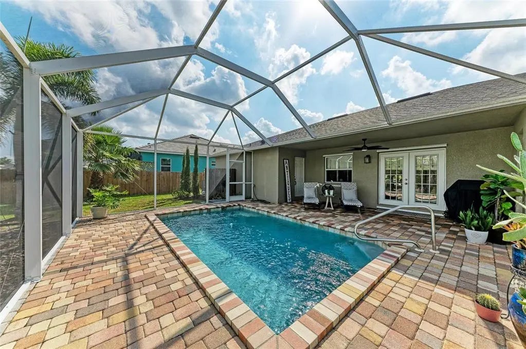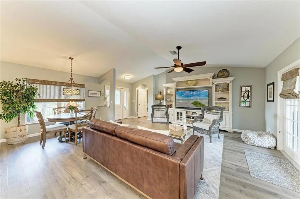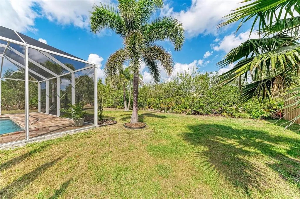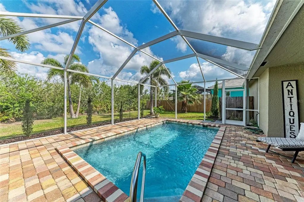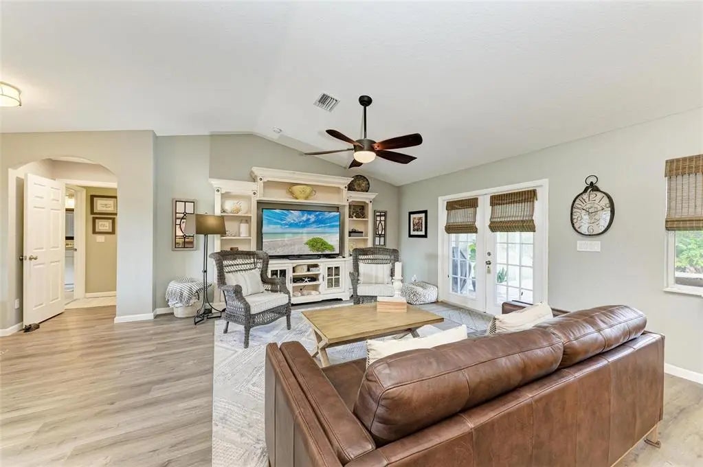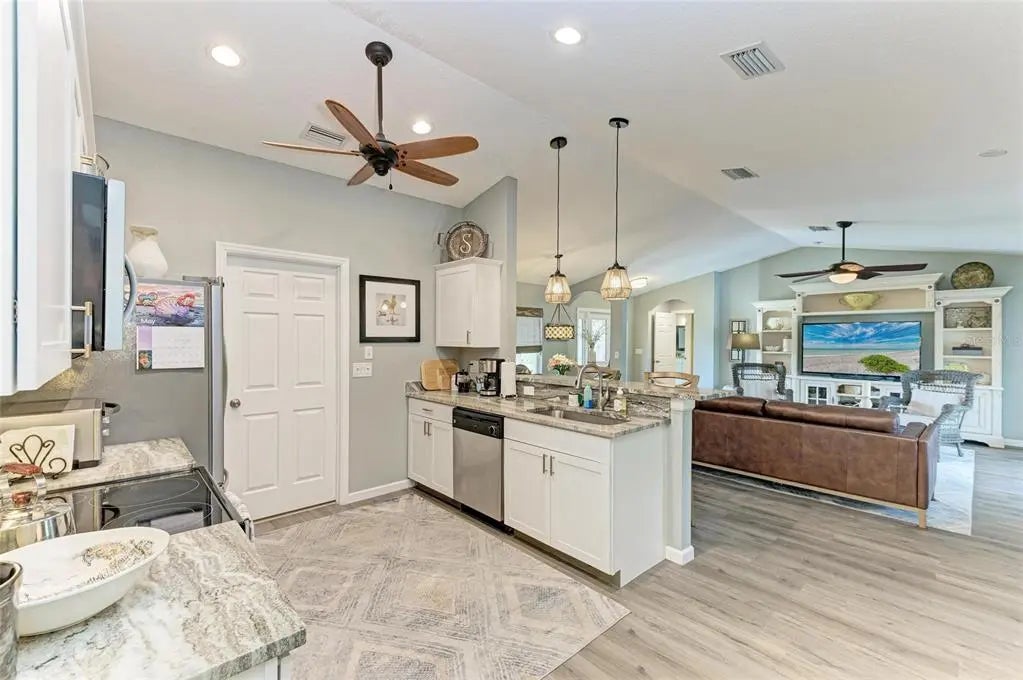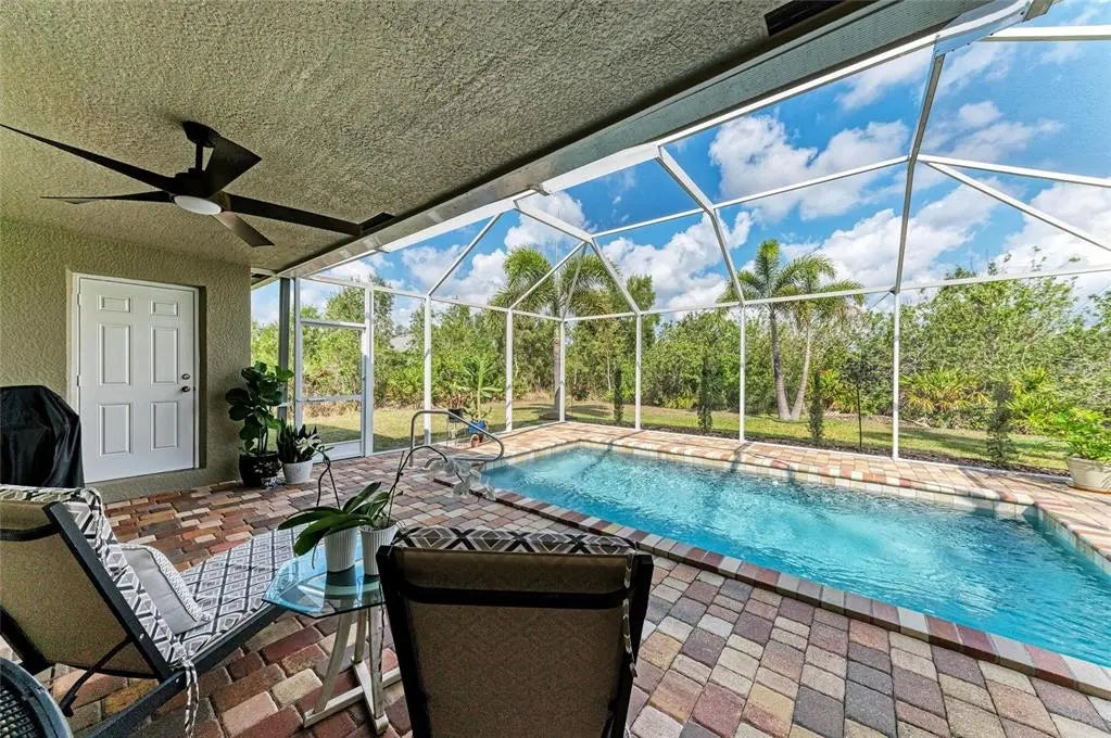 Gorgeous home - a must see! The facade features a front porch with pavers and a single entry door with leaded glass. This stand out feature provides chairs for you to sit and relax outside while enjoying nature's bounty. Welcome to this beautifully maintained home featuring a bright and spacious interior. The home boasts a volume cathedral ceiling over the great room, which seamlessly flows into the dinette and kitchen areas, enhancing the open-concept design. French doors from the great room lead directly to the screened lanai featuring a heated saltwater pool, which includes a baby barrier fence for added safety. Interior floor covering consists of luxury vinyl plank (LVP) flooring running throughout the main living areas, while tile is thoughtfully placed in the bathrooms and laundry room for durability. The kitchen is thoughtfully constructed, complete with stainless steel appliances, granite countertops, and a breakfast bar with overhead stylish pendant lighting. The laundry room features upper cabinets, offering convenient storage space. Designed with a split-bedroom layout, the home offers privacy with two spare bedrooms located on opposite sides of the house. The guest bathroom includes a tiled wall in the combination tub/shower and a granite-topped vanity with a single bowl sink. The owner’s suite is a relaxing retreat, offering private access to the lanai, two closets—including a walk-in—and a spacious en-suite bath featuring an elongated granite topped vanity with dual sinks and combo tub/shower unit. Per the seller, recent post-Hurricane Ian updates include new gutters, lanai screens, and a refrigerator. Additionally, the A/C unit had its coils replaced in 2025, ensuring efficient comfort year-round. Ensconced with concrete curbing, mature landscaping with lush palms surrounds the property, offering both privacy and curb appeal.