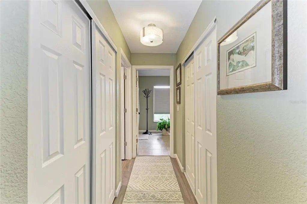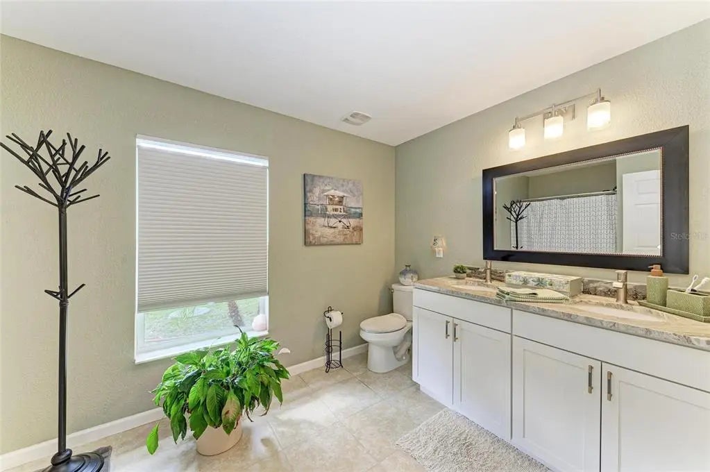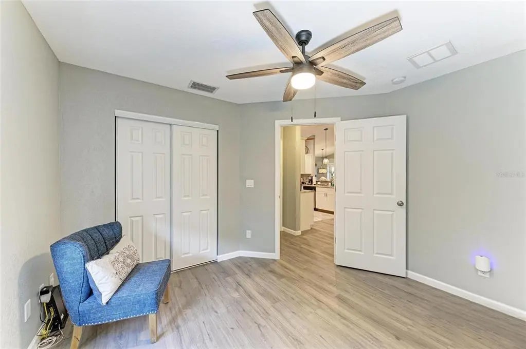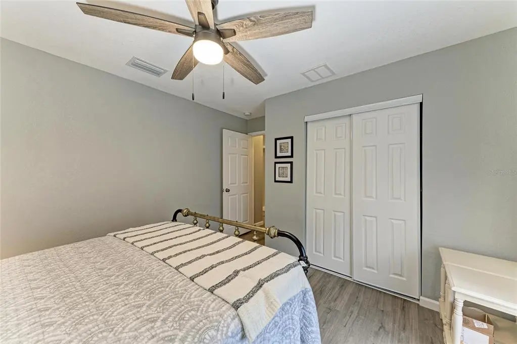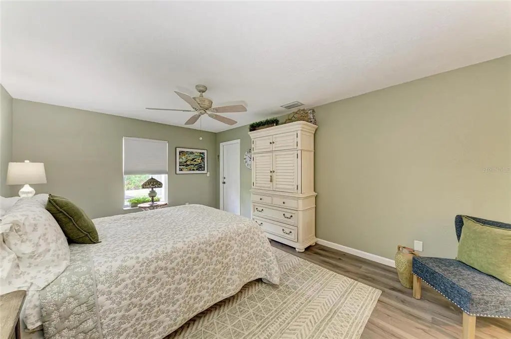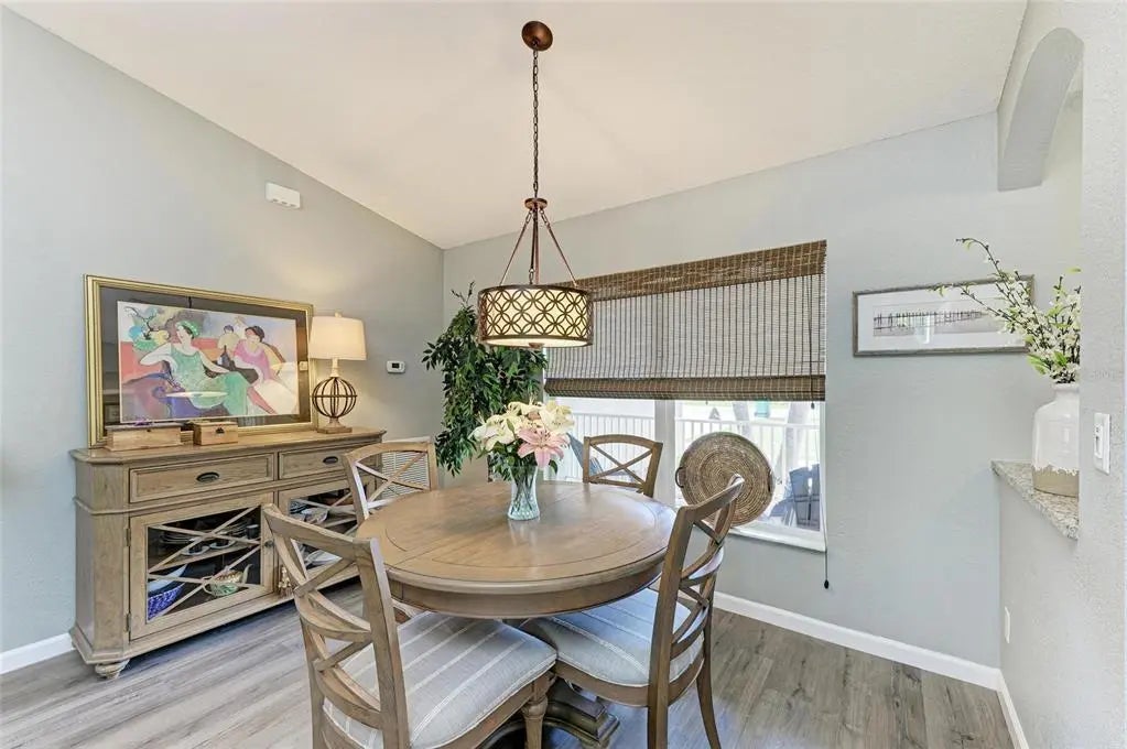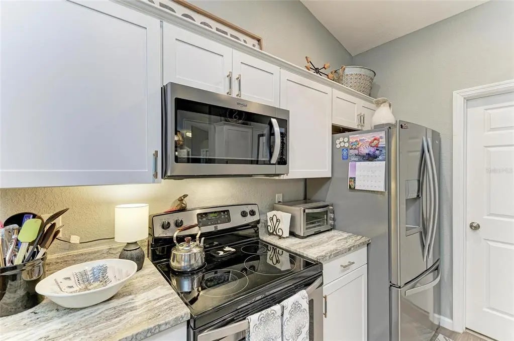 Gorgeous home - a must see! The facade features a front porch with pavers and a single entry door with leaded glass. This stand out feature provides chairs for you to sit and relax outside while enjoying nature's bounty. Welcome to this beautifully maintained home featuring a bright and spacious interior. The home boasts a volume cathedral ceiling over the great room, which seamlessly flows into the dinette and kitchen areas, enhancing the open-concept design. French doors from the great room lead directly to the screened lanai featuring a heated saltwater pool, which includes a baby barrier fence for added safety. Interior floor covering consists of luxury vinyl plank (LVP) flooring running throughout the main living areas, while tile is thoughtfully placed in the bathrooms and laundry room for durability. The kitchen is thoughtfully constructed, complete with stainless steel appliances, granite countertops, and a breakfast bar with overhead stylish pendant lighting. The laundry room features upper cabinets, offering convenient storage space. Designed with a split-bedroom layout, the home offers privacy with two spare bedrooms located on opposite sides of the house. The guest bathroom includes a tiled wall in the combination tub/shower and a granite-topped vanity with a single bowl sink. The owner’s suite is a relaxing retreat, offering private access to the lanai, two closets—including a walk-in—and a spacious en-suite bath featuring an elongated granite topped vanity with dual sinks and combo tub/shower unit. Per the seller, recent post-Hurricane Ian updates include new gutters, lanai screens, and a refrigerator. Additionally, the A/C unit had its coils replaced in 2025, ensuring efficient comfort year-round. Ensconced with concrete curbing, mature landscaping with lush palms surrounds the property, offering both privacy and curb appeal.