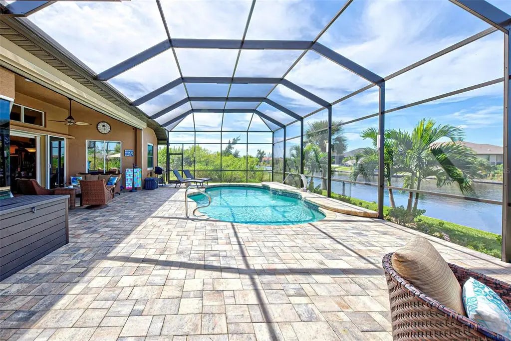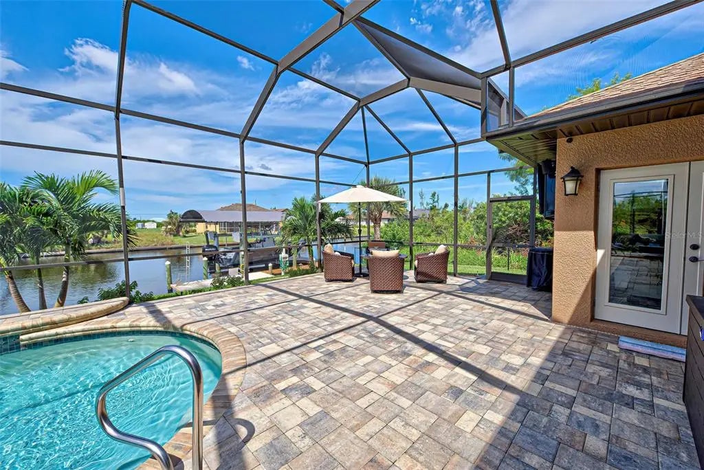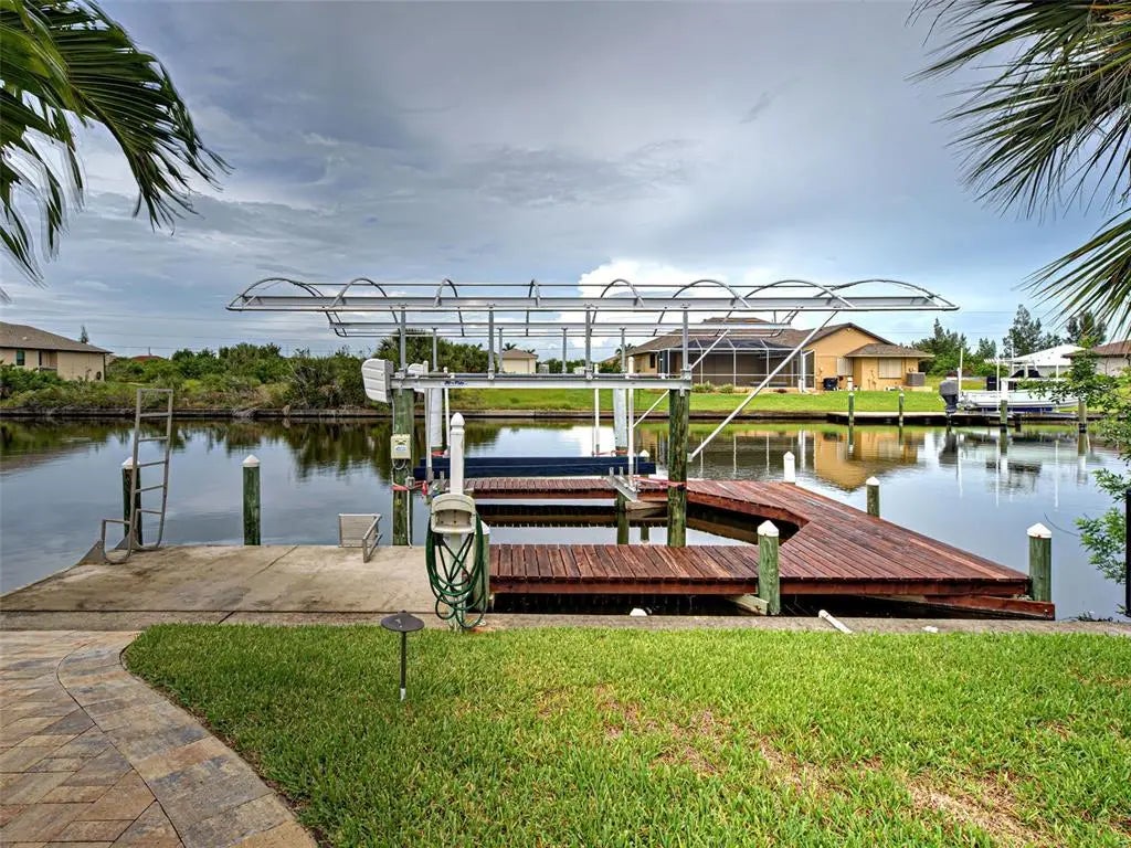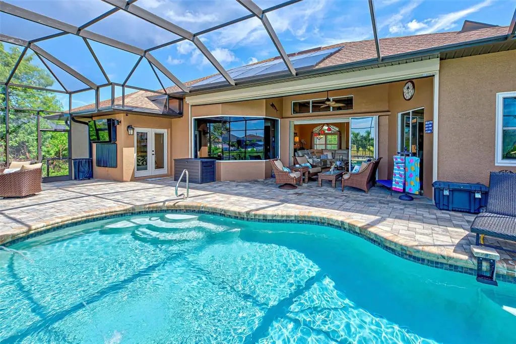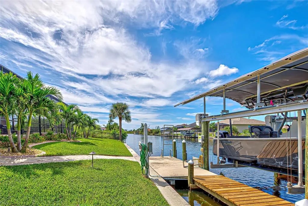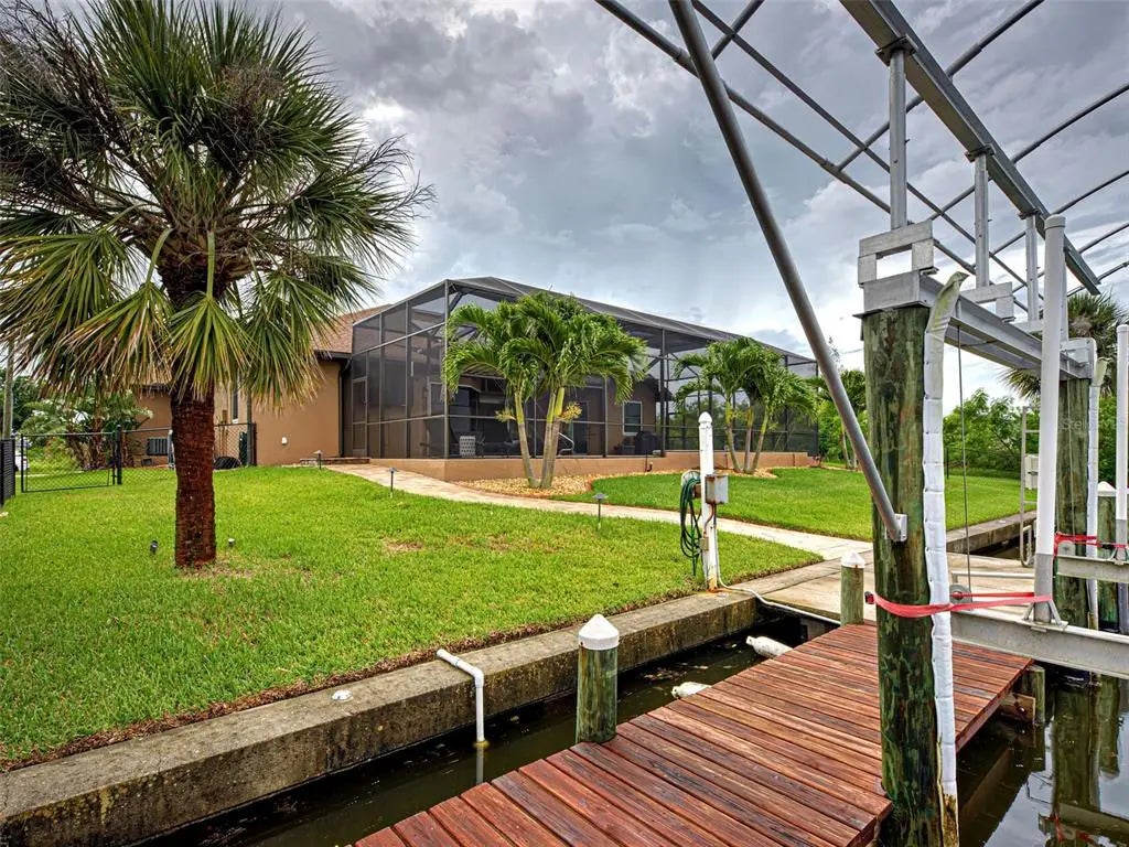 Under contract-accepting backup offers. Solar powered Home designed for effortless Florida living! This gorgeous WATERFRONT home is located in the heart of South Gulf Cove in Section 93, with a SEA WALL, boatdock and lift, this location is prime! With just minutes away from the Interceptor Lagoon, Charlotte Harbor, the Gulf and beyond! This HOME is loaded with upgrades like: New Roof, Hurricane Impact Windows and Sliders, Cat. 5 Kevlar screens for lanai, Photo Voltaic Solar System, new wrap around boatdock, new St. Augustine sod – look for attached upgrades list. Simply stunning 3BR / 2BA / 2 Car plus workshop/storage. Beautiful curb appeal with the etched double doors where an elegant greatroom will draw your eyes to volume tray ceilings with rope lighted crown, before feasting on the waterway views in your very own back yard. Between the sizable great room and adjoining formal dining room, indoor entertaining will be a pleasure. The gourmet kitchen features granite countertops, crowned cabinets, new appliances and a lovely stone backsplash. This adjoins a dinette with phenomenal aquarium windows overlooking the pool and outdoors and adding to the feel of natural light and spaciousness of this home. The master bedroom in this split plan is large enough to include a reading alcove and an admirable window pattern over the bed! The EnSuite is tastefully enhanced with a step-up garden tub with tile surround, as well as a separate walk-in shower. Double vanities, an eyebrow window, and plant shelves are touches not always found in today’s master baths. One of the guest bedrooms in this split plan has French doors opening to the lanai, and the other guest bedroom has a large walk-in closet. Both are generously sized for the comfort of your guests and family. Ready to go outside? The ultra large pooldeck has a large, covered area for dining or lounging and enjoying the waterfront views! There are remote controlled pool cage lights and Keflar Shutter for the lanai. The sparkling saltwater pool comes with a new pool heater for cooler days. Walk down to your concrete dock framed with a new wood wrap around dock and canopy frame with new tarp to protect your boat. New boat lift motors w/remote. Inside Laundry Room, Canal supplied irrigation system, landscaping lighting. Average monthly power bill is only $70.