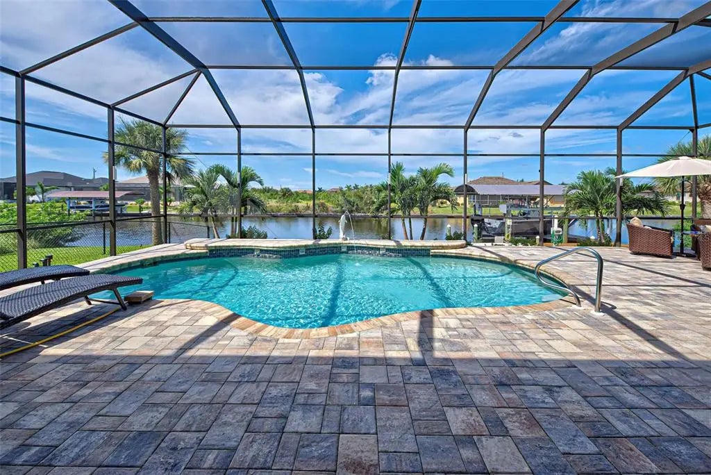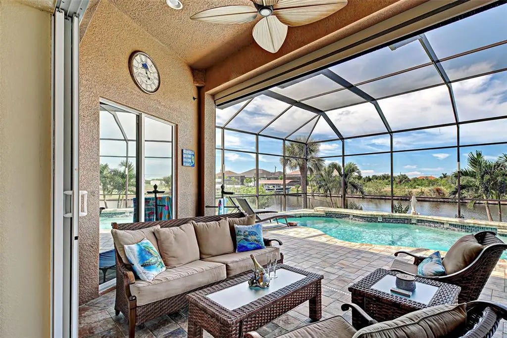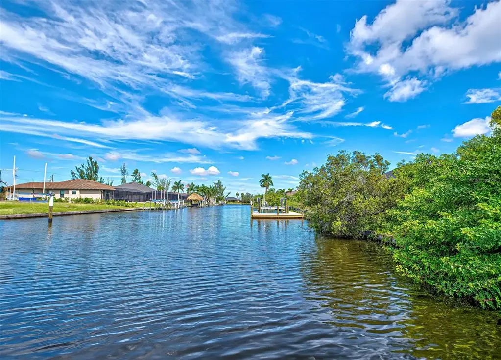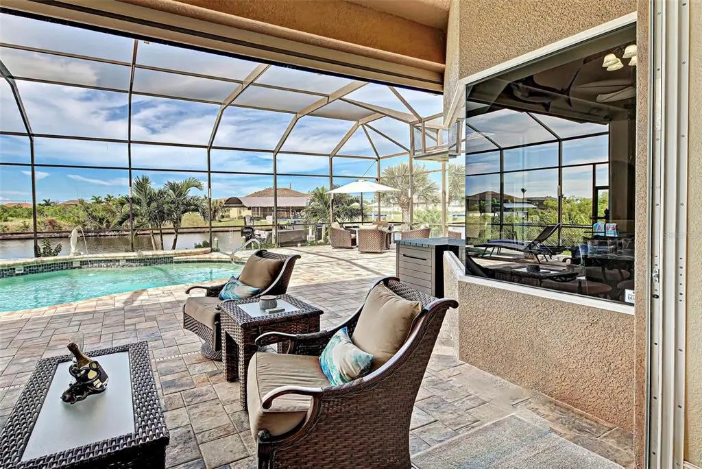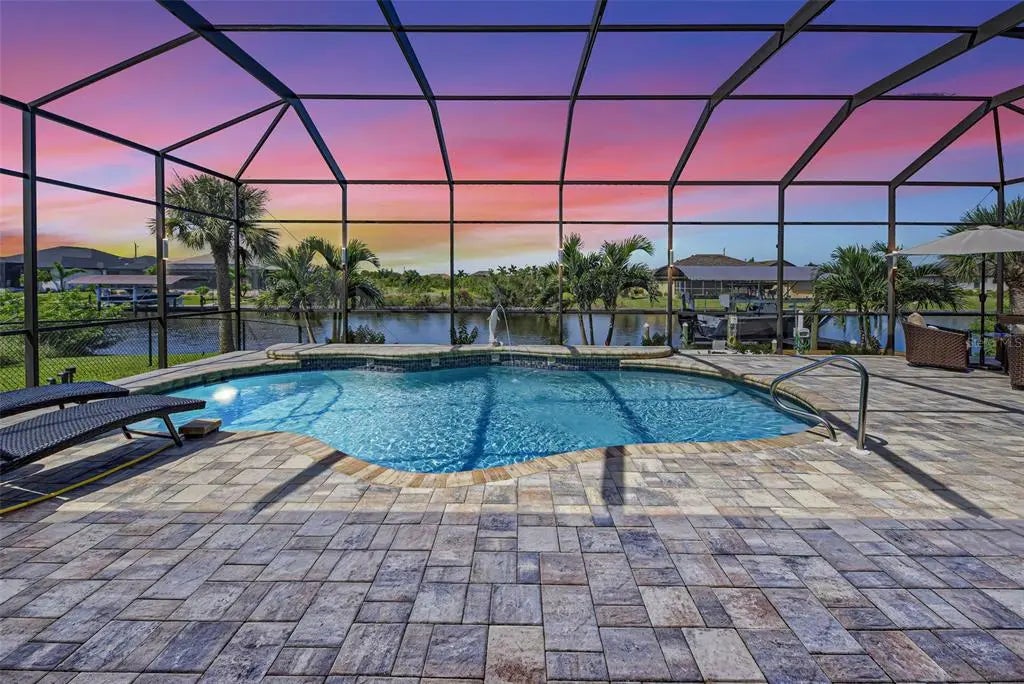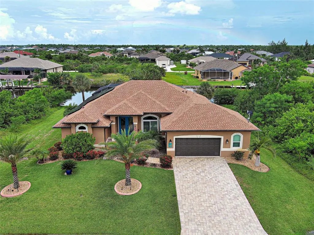 Under contract-accepting backup offers. Solar powered Home designed for effortless Florida living! This gorgeous WATERFRONT home is located in the heart of South Gulf Cove in Section 93, with a SEA WALL, boatdock and lift, this location is prime! With just minutes away from the Interceptor Lagoon, Charlotte Harbor, the Gulf and beyond! This HOME is loaded with upgrades like: New Roof, Hurricane Impact Windows and Sliders, Cat. 5 Kevlar screens for lanai, Photo Voltaic Solar System, new wrap around boatdock, new St. Augustine sod – look for attached upgrades list. Simply stunning 3BR / 2BA / 2 Car plus workshop/storage. Beautiful curb appeal with the etched double doors where an elegant greatroom will draw your eyes to volume tray ceilings with rope lighted crown, before feasting on the waterway views in your very own back yard. Between the sizable great room and adjoining formal dining room, indoor entertaining will be a pleasure. The gourmet kitchen features granite countertops, crowned cabinets, new appliances and a lovely stone backsplash. This adjoins a dinette with phenomenal aquarium windows overlooking the pool and outdoors and adding to the feel of natural light and spaciousness of this home. The master bedroom in this split plan is large enough to include a reading alcove and an admirable window pattern over the bed! The EnSuite is tastefully enhanced with a step-up garden tub with tile surround, as well as a separate walk-in shower. Double vanities, an eyebrow window, and plant shelves are touches not always found in today’s master baths. One of the guest bedrooms in this split plan has French doors opening to the lanai, and the other guest bedroom has a large walk-in closet. Both are generously sized for the comfort of your guests and family. Ready to go outside? The ultra large pooldeck has a large, covered area for dining or lounging and enjoying the waterfront views! There are remote controlled pool cage lights and Keflar Shutter for the lanai. The sparkling saltwater pool comes with a new pool heater for cooler days. Walk down to your concrete dock framed with a new wood wrap around dock and canopy frame with new tarp to protect your boat. New boat lift motors w/remote. Inside Laundry Room, Canal supplied irrigation system, landscaping lighting. Average monthly power bill is only $70.