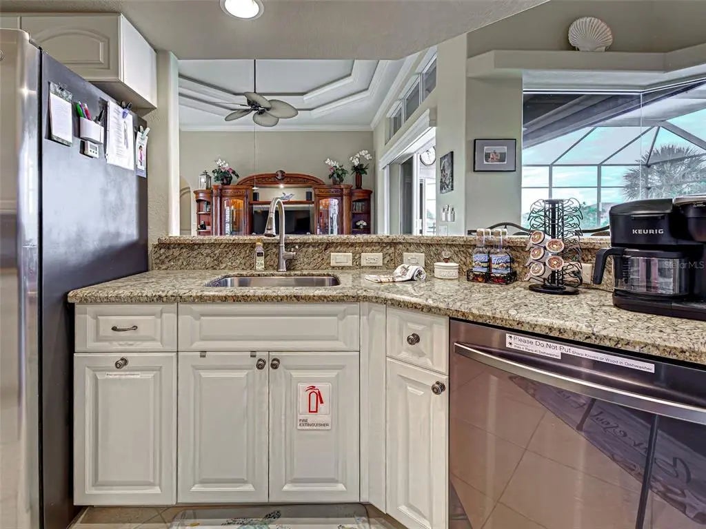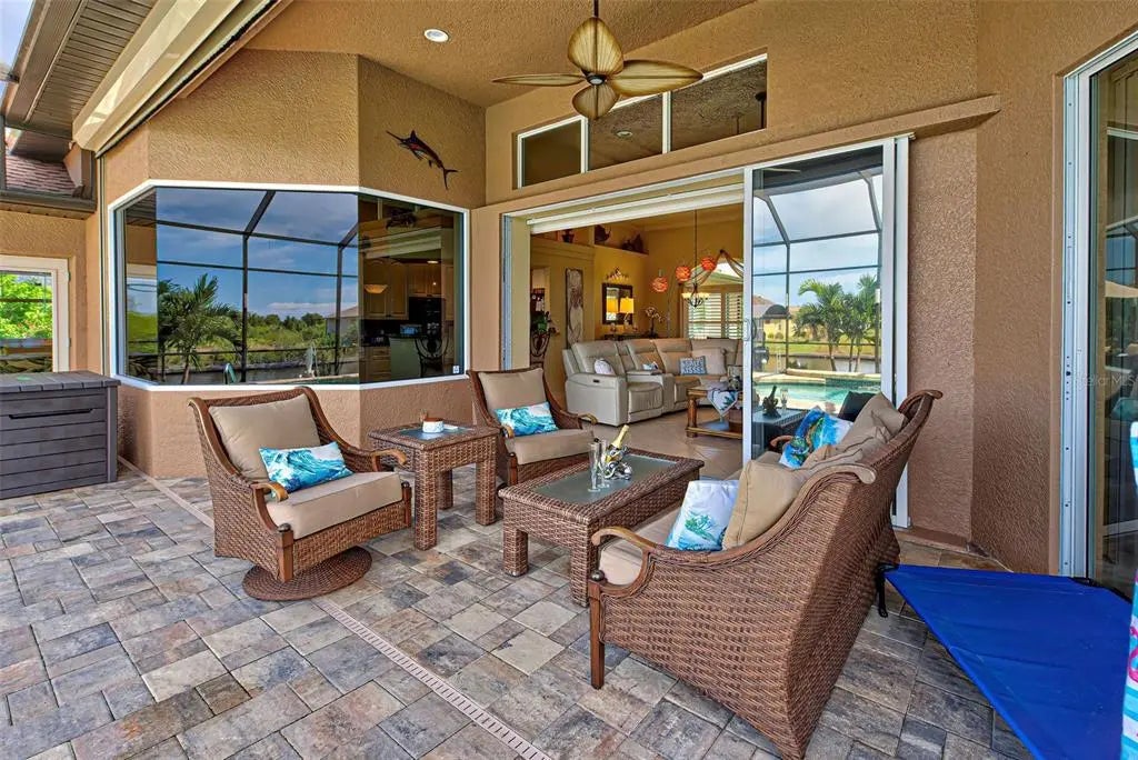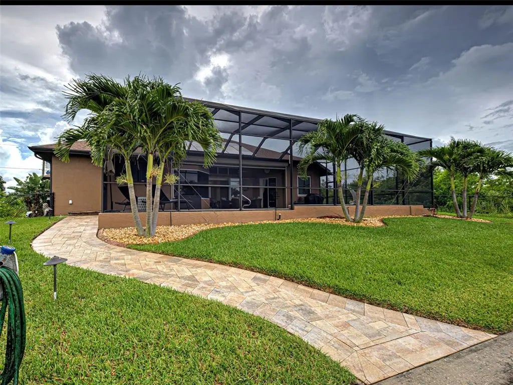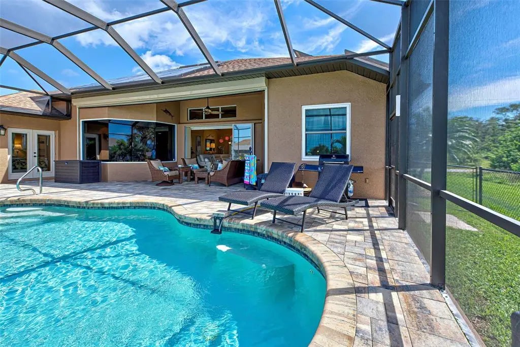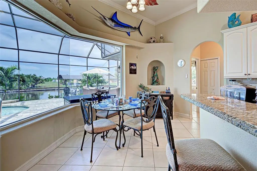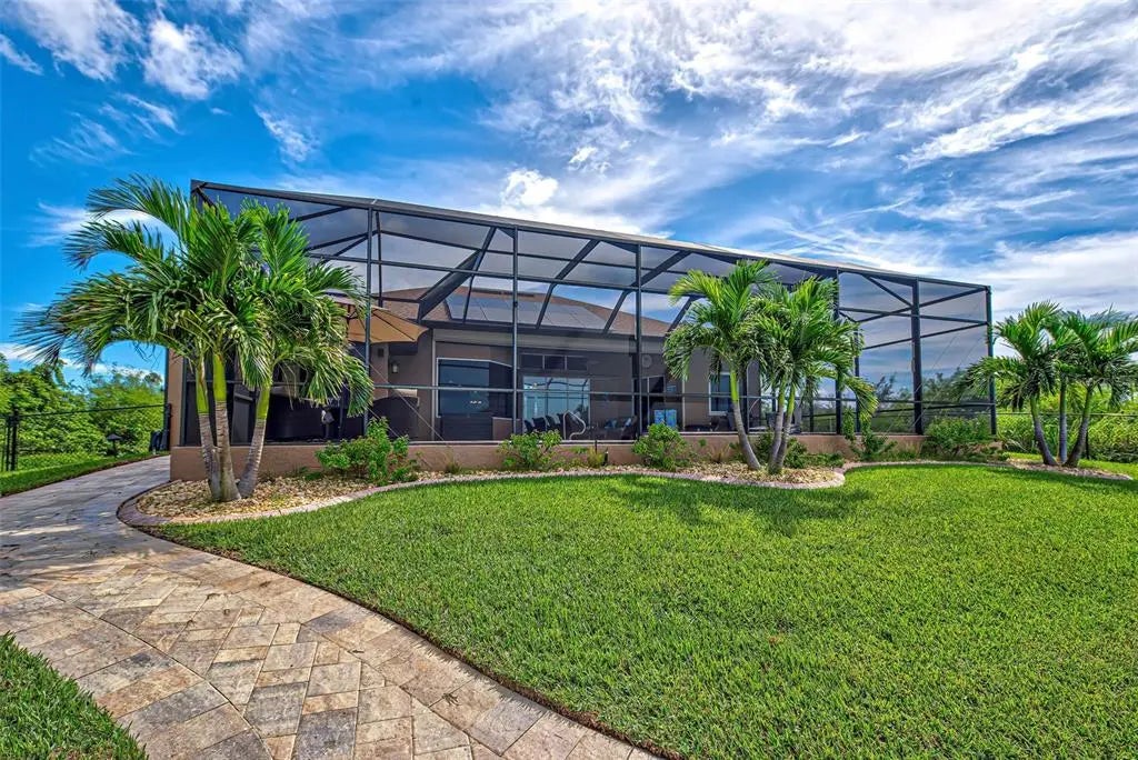 Under contract-accepting backup offers. Solar powered Home designed for effortless Florida living! This gorgeous WATERFRONT home is located in the heart of South Gulf Cove in Section 93, with a SEA WALL, boatdock and lift, this location is prime! With just minutes away from the Interceptor Lagoon, Charlotte Harbor, the Gulf and beyond! This HOME is loaded with upgrades like: New Roof, Hurricane Impact Windows and Sliders, Cat. 5 Kevlar screens for lanai, Photo Voltaic Solar System, new wrap around boatdock, new St. Augustine sod – look for attached upgrades list. Simply stunning 3BR / 2BA / 2 Car plus workshop/storage. Beautiful curb appeal with the etched double doors where an elegant greatroom will draw your eyes to volume tray ceilings with rope lighted crown, before feasting on the waterway views in your very own back yard. Between the sizable great room and adjoining formal dining room, indoor entertaining will be a pleasure. The gourmet kitchen features granite countertops, crowned cabinets, new appliances and a lovely stone backsplash. This adjoins a dinette with phenomenal aquarium windows overlooking the pool and outdoors and adding to the feel of natural light and spaciousness of this home. The master bedroom in this split plan is large enough to include a reading alcove and an admirable window pattern over the bed! The EnSuite is tastefully enhanced with a step-up garden tub with tile surround, as well as a separate walk-in shower. Double vanities, an eyebrow window, and plant shelves are touches not always found in today’s master baths. One of the guest bedrooms in this split plan has French doors opening to the lanai, and the other guest bedroom has a large walk-in closet. Both are generously sized for the comfort of your guests and family. Ready to go outside? The ultra large pooldeck has a large, covered area for dining or lounging and enjoying the waterfront views! There are remote controlled pool cage lights and Keflar Shutter for the lanai. The sparkling saltwater pool comes with a new pool heater for cooler days. Walk down to your concrete dock framed with a new wood wrap around dock and canopy frame with new tarp to protect your boat. New boat lift motors w/remote. Inside Laundry Room, Canal supplied irrigation system, landscaping lighting. Average monthly power bill is only $70.