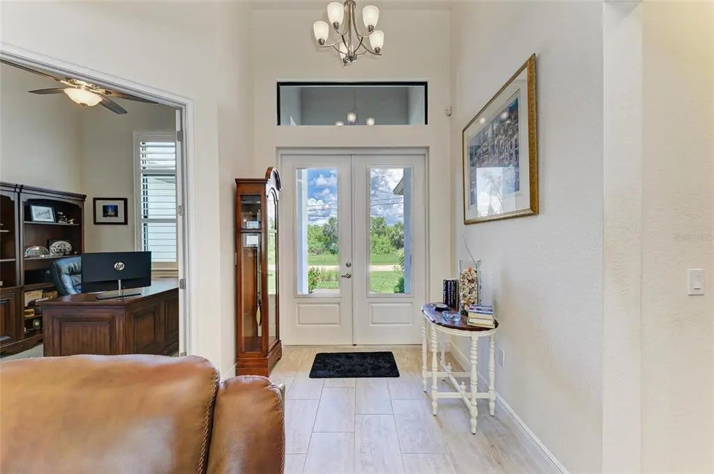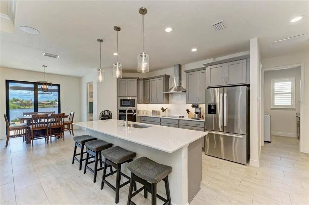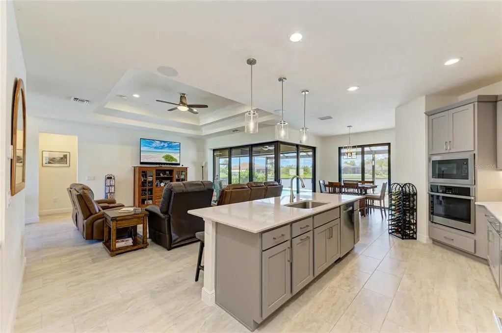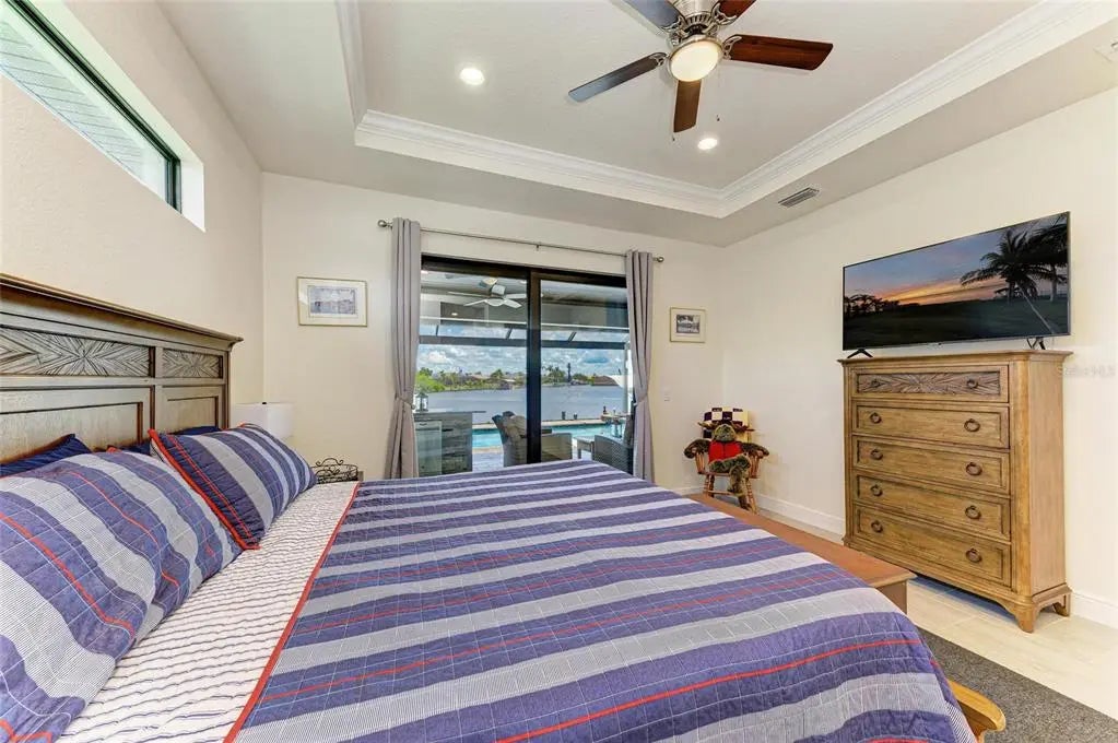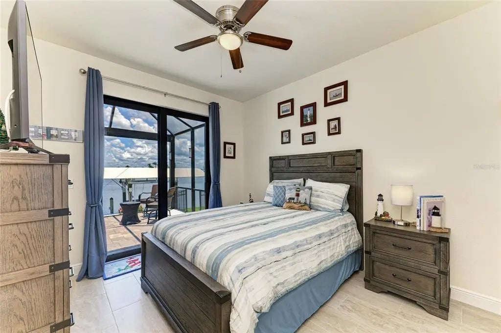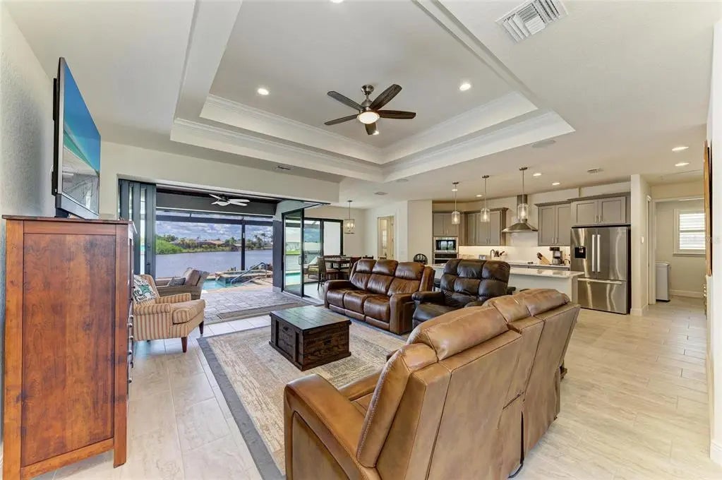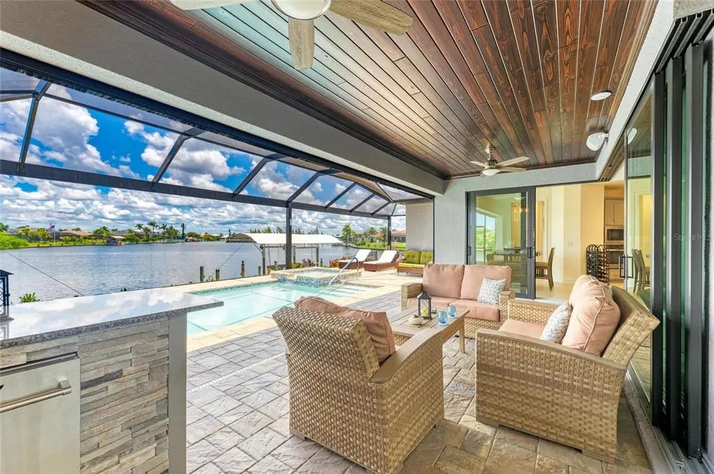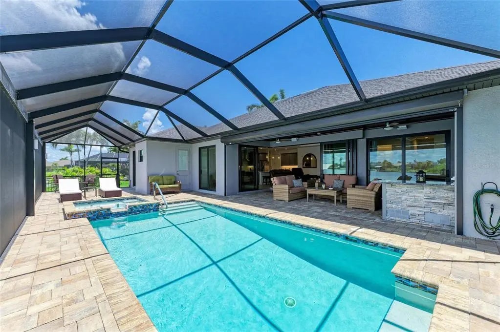 Under contract-accepting backup offers. Why Build when you can have JUST LIKE new NOW? Nestled on an oversized waterfront lot boasting an impressive 111 feet of water frontage, this custom-designed residence is the epitome of Florida living. From the moment you arrive, a paver driveway and walkway—extending around the east side of the home—guide you to the double entry doors adorned with glass inserts and a transom, welcoming you into a refined, thoughtfully planned interior boasting three bedrooms plus a private office for those who work from home. The spacious split floor plan centers around a great room with soaring double tray ceilings, enhanced with crown molding for added distinction. A wide triple sliding glass door connects at a 90-degree angle with one of two sets of double sliders in the dinette, creating a seamless indoor-outdoor living experience offering breathtaking views of the sparkling pool and serene waterfront. The exceptional kitchen is a chef’s dream, featuring a large center island, pendant lighting, gleaming stainless steel appliances, built in oven and range top, granite and quartz countertops, soft-close drawers, undercabinet lighting, and a storage pantry. An adjacent alcove provides access to two generously sized guest bedrooms and a stylish full bath—also accessible from the pool area. Retreat to the luxurious primary suite, which features a tray ceiling finished with crown molding, double sliders providing direct access to the enclosed exterior, his/her closets and a spa-inspired ensuite bath complete with a walk-through tiled shower, separate soaking tub, and dual granite-topped vanities. Step outside to your personal oasis and enjoy the amenities of a newly screened outdoor entertainment area with a heated saltwater pool and integrated spa, a fully equipped outdoor kitchen with grill, sink, and refrigerator, surround sound system, extended Wi-Fi, and an LED lighting package integrated into the pool cage. Open the numerous sliding doors throughout the home to effortlessly merge indoor and outdoor spaces—perfect for entertaining or simply relaxing. Beyond the pool, a paver walkway leads to a private dock area via a custom ramp with railing. Enjoy the tranquil 14’ x 25’ canal-side lower patio, and a 30’ x 7’ composite dock with electricity and a covered 8,000 lb. boat lift —ideal for fishing or launching your watercraft to explore over 55 miles of canals or venture out into the Gulf of Mexico. Additional high-end features include but are not limited to porcelain wide plank tile throughout, wood-stained ceilings in the front foyer and lanai, whole-house generator, impact windows and doors, electric storm shutters at the front door and lanai, security system with remote access to garage and HVAC, epoxy-coated garage floor, functional laundry room with granite-topped folding area and abundant cabinetry. This beautiful property stands out with its lush, upgraded landscaping with concrete curbing, irrigation, and lighting package. Truly a waterfront gem, this home offers both peace and prestige—perfectly blending luxury, functionality, and access to endless water adventures. Take the first step to make this home your very own, call today to view so as not to miss the opportunity to live where every day feels like a vacation.