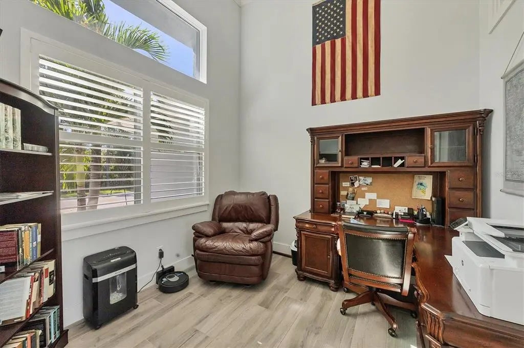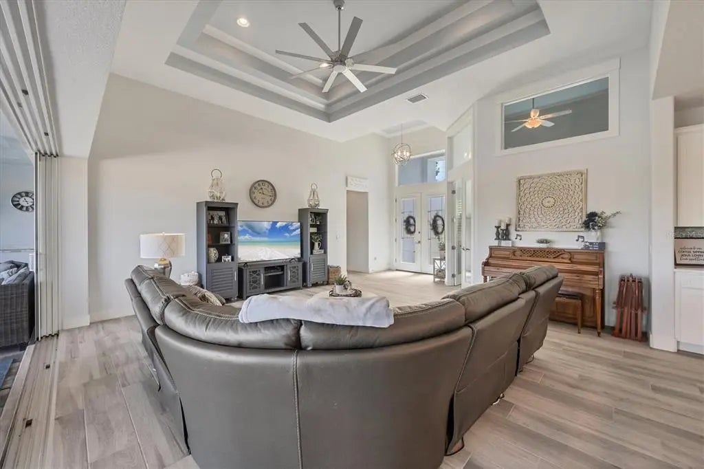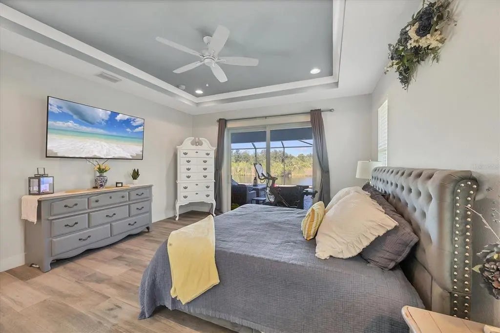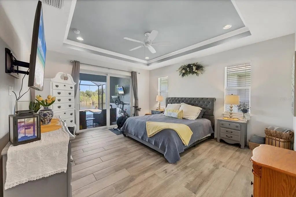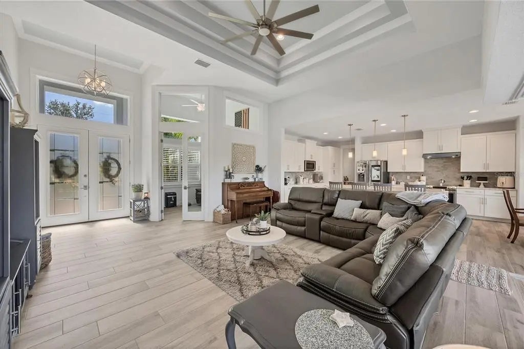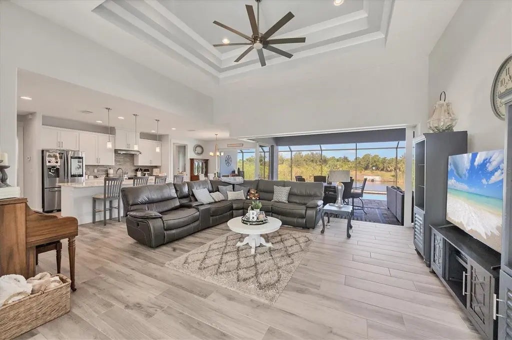 - Interior FeaturesCeiling Fan(s), Crown Molding, High Ceilings, Open Floorplan, Solid Surface Counters, Solid Wood Cabinets, Thermostat, Tray Ceiling(s), Walk-In Closet(s), Window Treatments
