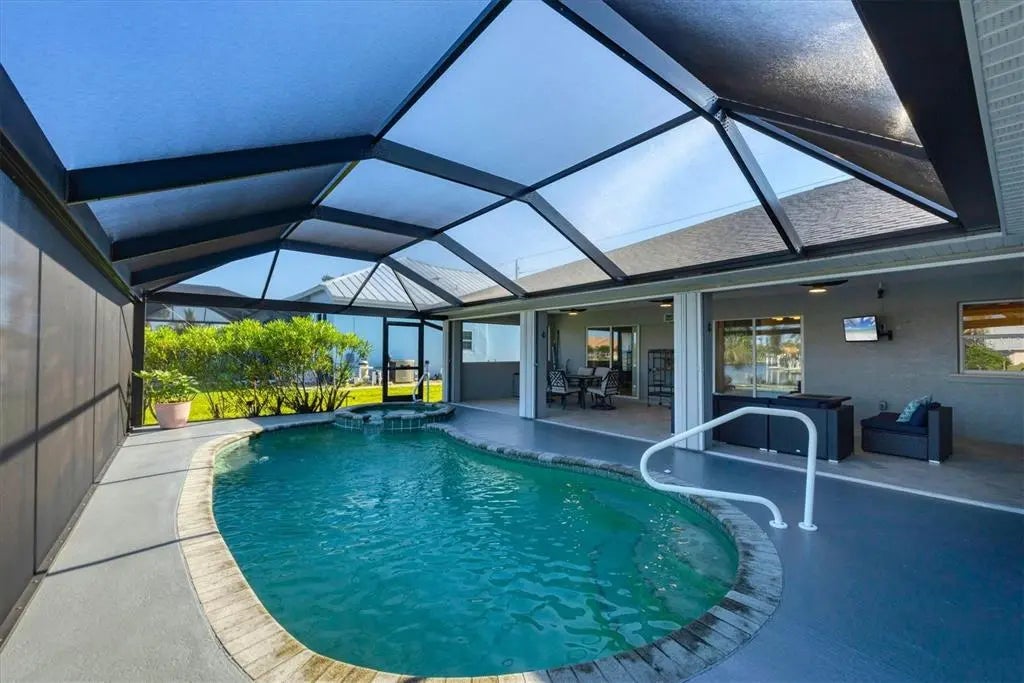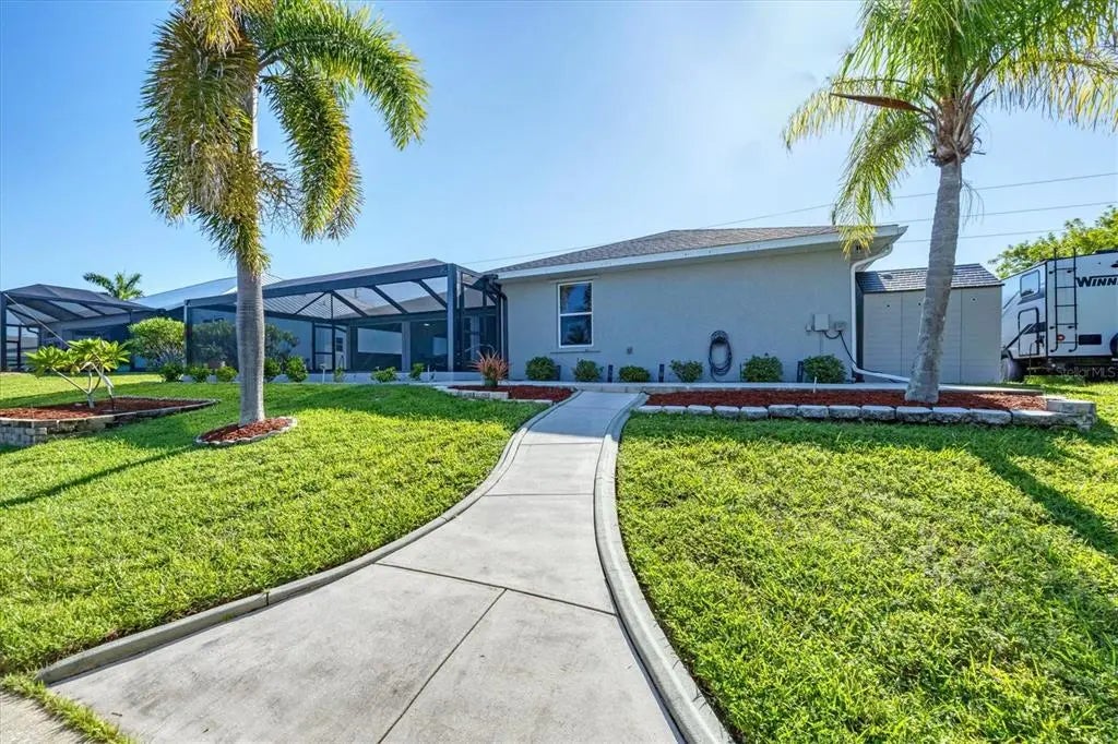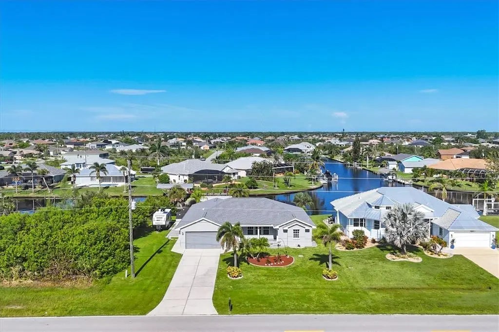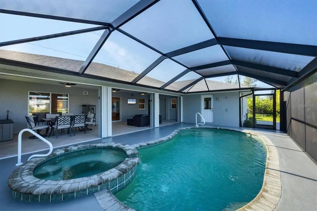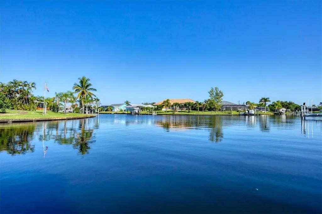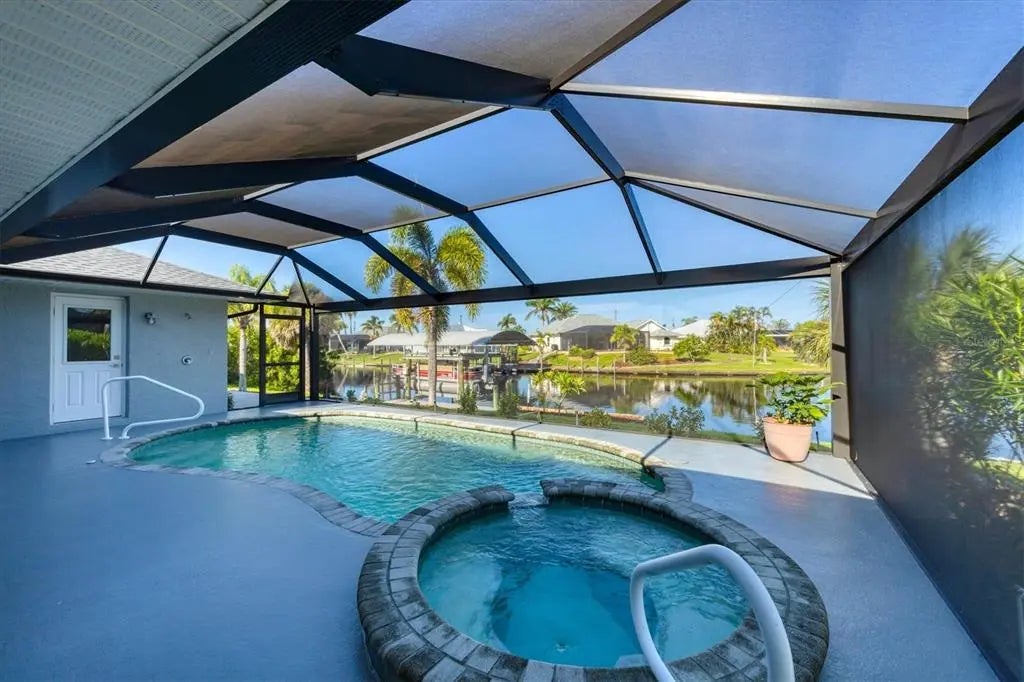 Welcome to 9349 St. Paul Drive, a waterfront gem in the sought-after South Gulf Cove community of Port Charlotte. This 3-bedroom, 2-bathroom home spans 2,141 square feet and boasts one of the best locations off the Main Zephyr Waterway—just one bridge out to open water, making your boating days effortless and exciting. Inside, the thoughtful layout separates the guest bedrooms from the primary suite, offering privacy and comfort for family or visitors. The guest bathroom provides direct access to the lanai, perfect for poolside convenience. With both a living room and a family room, plus a bonus space ideal for an office or craft room, the home delivers versatility to fit your lifestyle. Function meets practicality with a 2-car garage, two 7x7 outdoor sheds on a stone pad for extra storage, an RV hookup, and a backup generator wired directly to the panel. Updates include a newer roof, new lanai cage, new AC and air handler, new hot water heater, and fresh exterior paint in 2022. The kitchen features a new refrigerator, with an additional one located in the garage. Step outside to a spacious west-facing lanai built for relaxation and entertaining, with defined seating and dining areas, an outdoor shower, and a heated chlorine pool with spa. A cement pad off the lanai offers the perfect spot to soak in Florida’s unforgettable sunsets. The property includes a concrete seawall, a dock with water and electric, and a newer covered 10,000 lb. boat lift, all set along a cement walkway that enhances waterfront access. Low-maintenance landscaping means less yard work and more time to enjoy everything this area has to offer—world-class fishing in Charlotte Harbor and Boca Grande, boatable restaurants, top-rated golf courses, and incredible Gulf beaches. The home also features Bluestream internet and a transferable flood insurance policy for added peace of mind. This is Florida living without compromise—priced right and ready to deliver the paradise lifestyle you've been searching for.