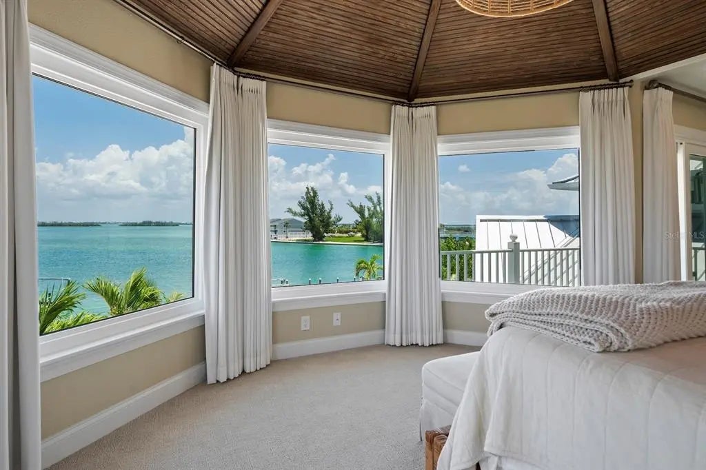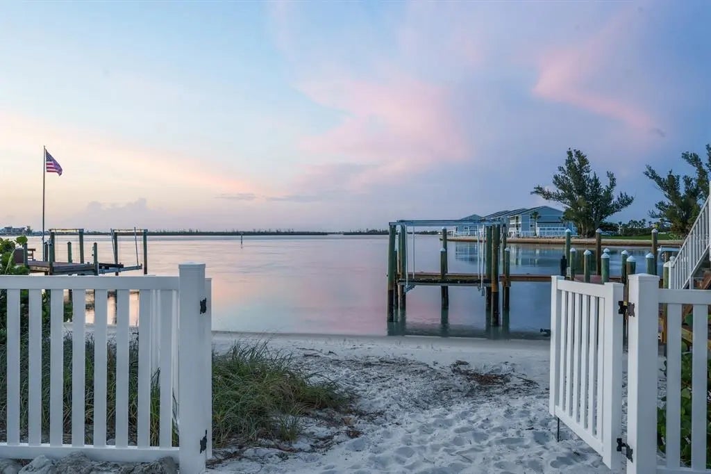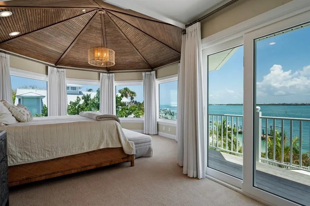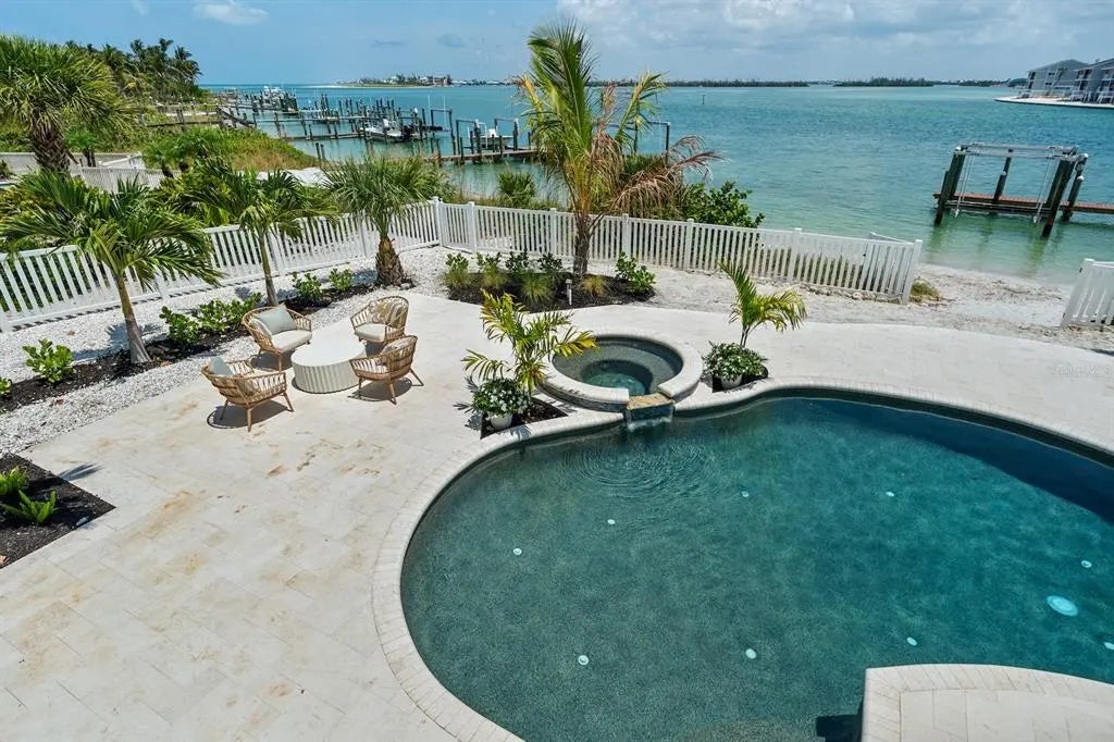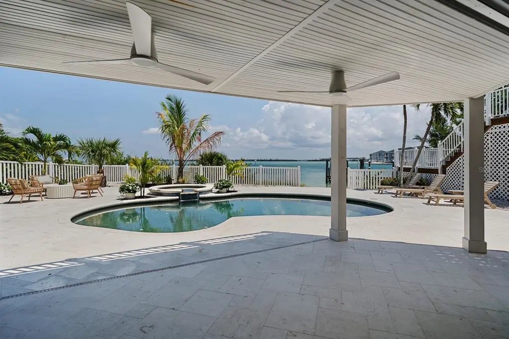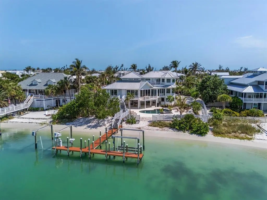Coastal architecture, a modern Gulf Front masterpiece in Boca Grande, where bold design meets serenity. Designed by award-winning architect Gerald R. Maki and constructed by expert builder Jack Curley, this custom turnkey beachfront estate exudes commanding presence with clean lines, soaring spaces, and walls of glass, all set against a private Gulf-front backdrop. The main living level is a true spectacle, boasting 20-foot ceilings, custom woodwork, and a dramatic spiral staircase that sets the tone for the expansive great room. Multiple lounge zones and wraparound terraces seamlessly open to the outdoors, inviting guests to relax and unwind. A generous dining area, an updated kitchen with sleek cabinetry and modern finishes, and a layout designed for effortless entertaining and everyday luxury complete the living space. Upstairs, a glass-wrapped primary suite on its private level offers a lofted sanctuary with water-facing terraces, a sitting room, an office, and a spa-style bath that echoes the serenity of the setting. Two additional en-suite guest rooms provide privacy and balcony access, while the two-car garage with a dedicated golf cart bay ensures functional luxury. Even dedicated outdoor storage for fishing and diving gear is available, positioned for direct access to the water. Outside, the home underwent a transformative makeover in May 2025, featuring a modern tiled pool deck, a resurfaced and rebuilt heated pool and spa, lush native landscaping, and a rebuilt deepwater dock with two boat lifts. Just a short distance from your private, sandy beach. Sustainable and secure, the home is equipped with solar power and a rainwater harvesting system that supplies irrigation. Design-driven, Gulf-facing, architecturally significant, and turnkey perfection—this is one of a kind.