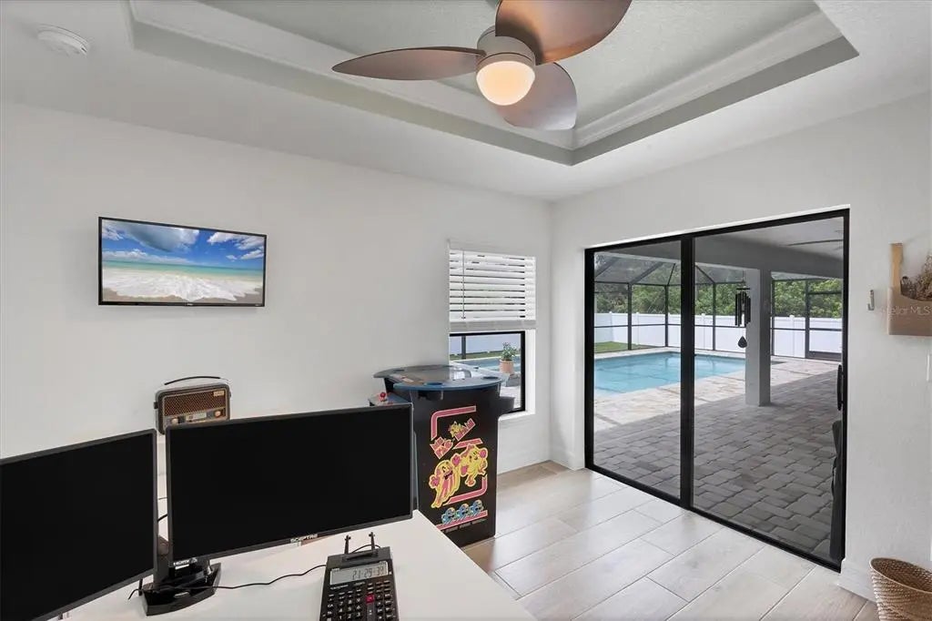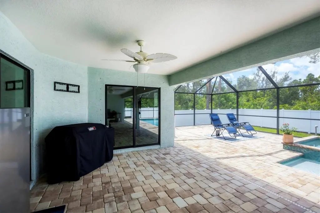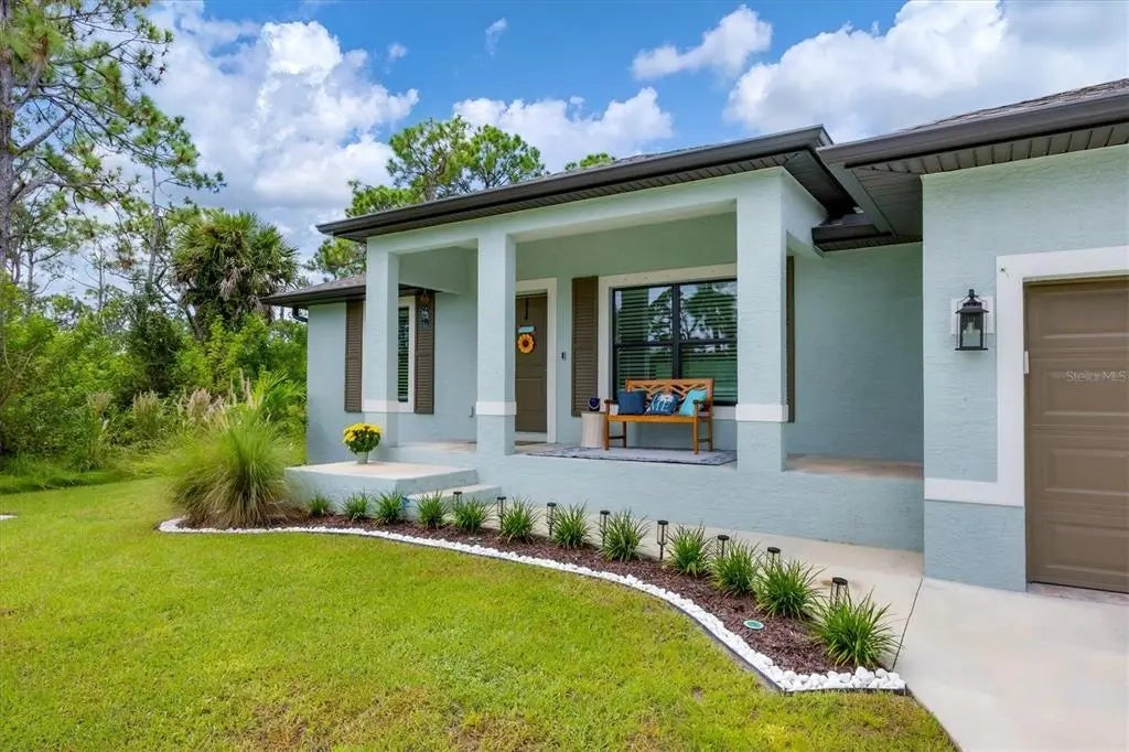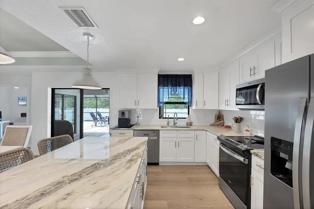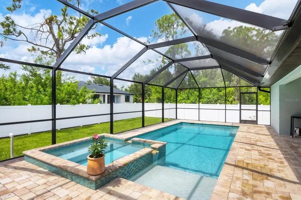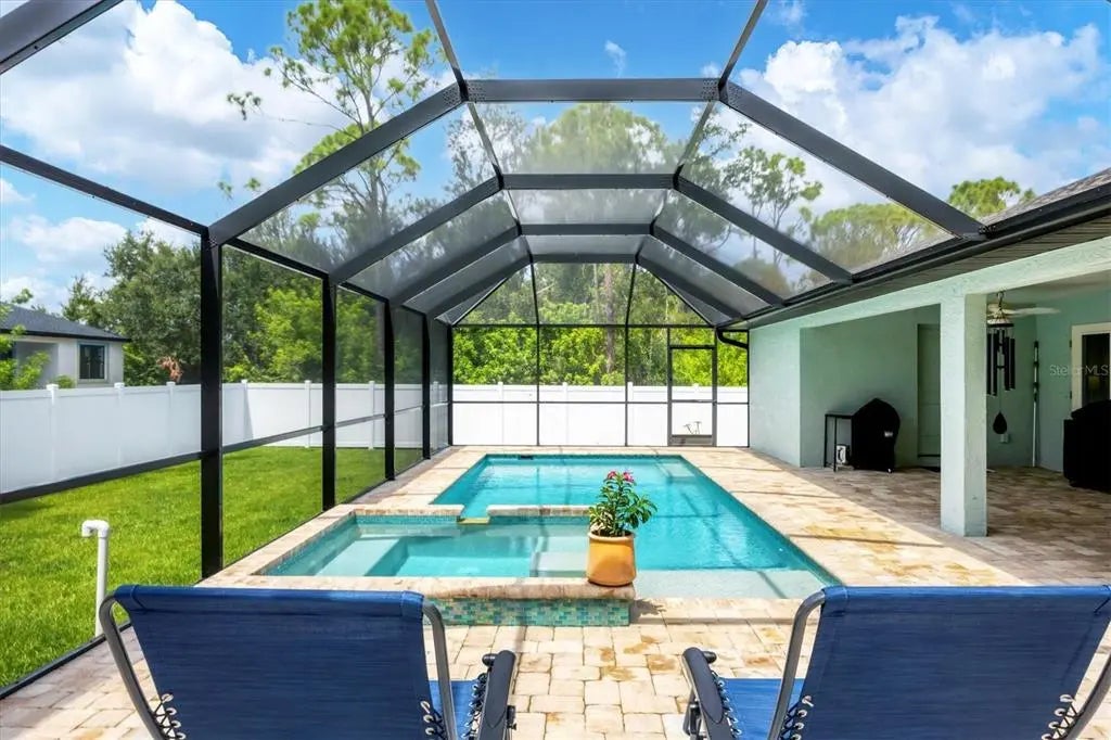 Nearly new coastal-style home with 3 bedrooms PLUS an office/den/flex room, 2 baths, and an oversized 3-car garage with a saltwater pool and spa in desirable South Gulf Cove! This open-concept retreat highlights crown molding, tray ceilings, shiplap accents, porcelain plank tile, and level 4 granite throughout. The chef’s kitchen boasts solid wood soft-close cabinetry, Whirlpool stainless steel appliances, TWO pantries, tiled backsplash, and a large center island. The private owner’s suite offers direct patio access, a large walk-in closet and pool access. Two guest bedrooms feature spacious closets, while the versatile flex room overlooks the pool and lanai through sliding glass doors. Both bathrooms are beautifully appointed with tiled showers and benches. Step outside to your backyard oasis, complete with a saltwater heated pool and spa, a spacious covered lanai, and a massive screened paver deck with sunny SW exposure. The fully fenced yard provides both privacy and space to relax or entertain. Additional highlights include a laundry room with sink and a linen closet, hurricane shutters, and high-end fixtures throughout. Flood insurance is transferable offering peace of mind and convenience for the new owner. This boater’s paradise also offers an optional community boat ramp with Gulf access, and you’ll be just minutes from beaches, fishing, golf, shopping, and dining. Move right in and enjoy the Florida lifestyle!