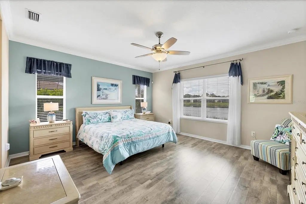 - Interior FeaturesCeiling Fan(s), Crown Molding, Eating Space In Kitchen, Kitchen/Family Room Combo, Open Floorplan, Primary Bedroom Main Floor, Solid Surface Counters, Solid Wood Cabinets, Split Bedroom, Thermostat, Walk-In Closet(s), Window Treatments