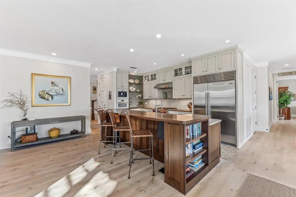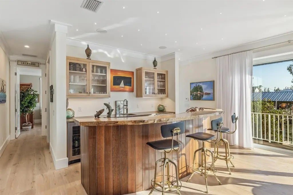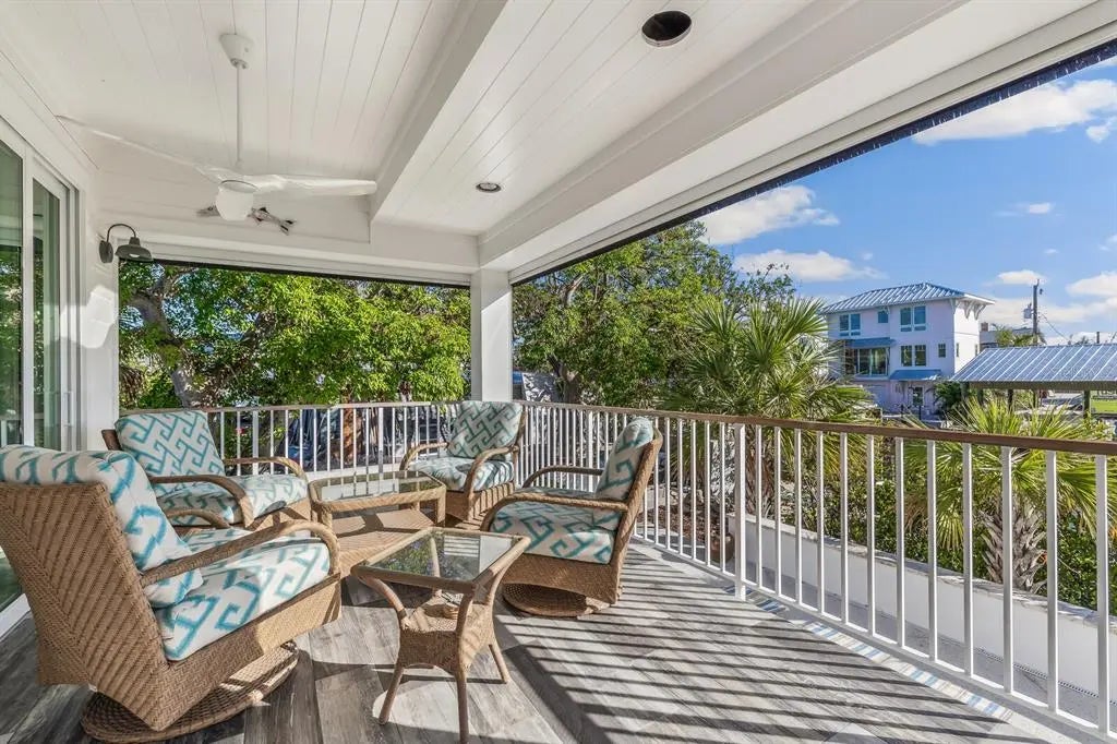 Welcome to an extraordinary coastal residence in the historic village of Boca Grande. This meticulously crafted home has an impressive 5,036 square feet, five bedrooms (the first-floor bedroom could be a den or office with direct access to a screened porch), and five bathrooms. This sturdy and elevated home on the natural “crown” of the island has not suffered any hurricane damage from wind or water. The home and the setting epitomize small island living. This remarkable home features an open floor plan, custom woodwork and oak flooring. The gourmet kitchen features professional-grade appliances including a Subzero refrigerator, a 4 burner Wolf stove with griddle, Miele wall steam oven, and an Asko dishwasher. A custom-designed breakfast bar, walk-in pantry, and an innovative Miele coffee bar cater to both daily living and elegant entertaining. This home features an 11’ curved “live edge” tiger maple bar with a bar sink, refrigerator, ice machine and custom cabinetry. Wine connoisseurs will appreciate the 100+ bottle custom chilled wine closet. The bar and adjoining lounge areas have LED “star constellation” lighting for a clean and enchanting ambiance. The bar and lounge look out through large disappearing sliding-glass doors to the coral stone patio, outdoor wood fireplace and canal, inviting seamless indoor-outdoor living with highly desirable southern exposure. Practical luxury abounds with an elevator, impact glass windows and doors, Hardi Plank siding, and a metal roof ensuring both comfort and security. The oversized garage accommodates both vehicles and a golf cart, perfect for exploring the charming village surroundings. The private den/office/bedroom, separate formal dining room, library, and bonus room offer versatile spaces for work and leisure. The home features a formal dining room that could be used alternatively as a music conservatory or a large, sunny office. There is a “bonus” room on the midlevel that has a full laundry with folding table and drying closet, a number of cleverly hidden spaces for storage, and a vaulted ceiling central space for work or leisure. The second floor features a gallery hallway and library with access to an outdoor balcony. For sailing or powerboat enthusiasts, the property's 80’ dock and 10,000-pound boat lift provide direct, deep-water access to Florida's pristine waters, without height-restrictive bridges. The home's location on the nearest canal to the center of town, offers boaters optimal convenience and privacy. The dock itself has a swim ladder and a custom-designed pivoting platform for safely launching small crafts like paddle boats, kayaks and SUP boards. Snook and other game fish can be caught right off the sunny dock, and the dock has a fish-cleaning station. Thoughtful additions include electric screens, a hidden wall safe nook, custom closet wooden built-ins, pocket doors, Plantation shutters, motion detection lighting, and innovative storage solutions demonstrate the meticulous attention to detail throughout this exceptional property. This residence stands as a testament to luxurious coastal living, where every element has been carefully considered to create an unparalleled living experience.