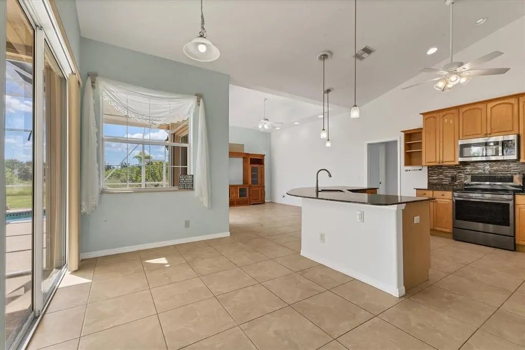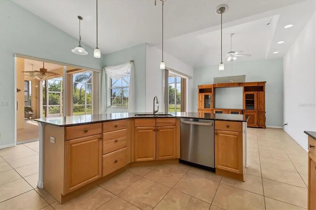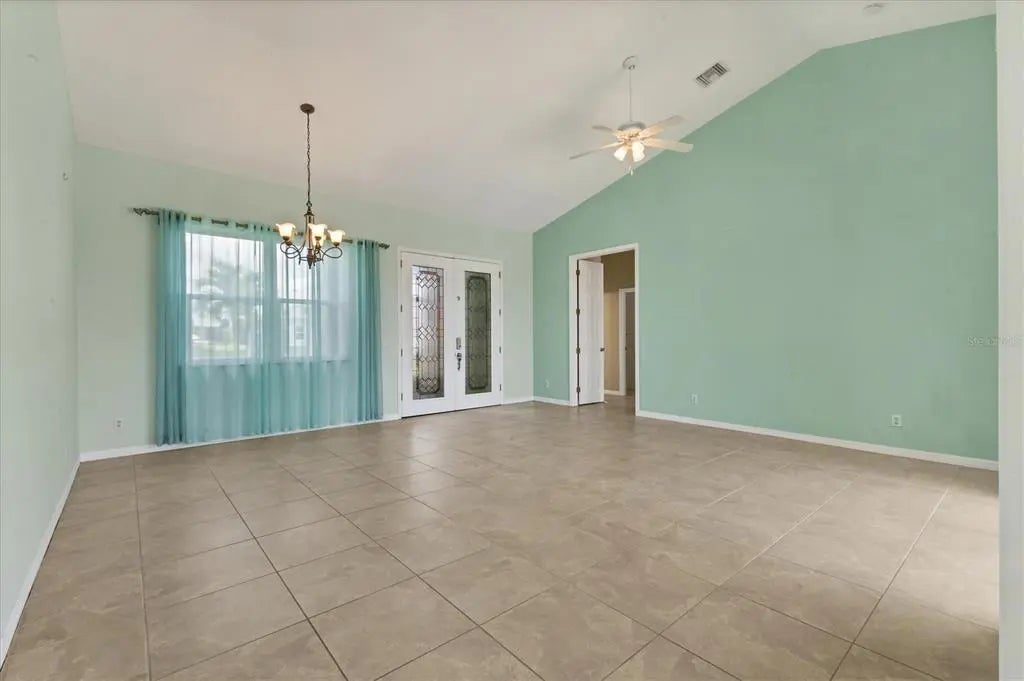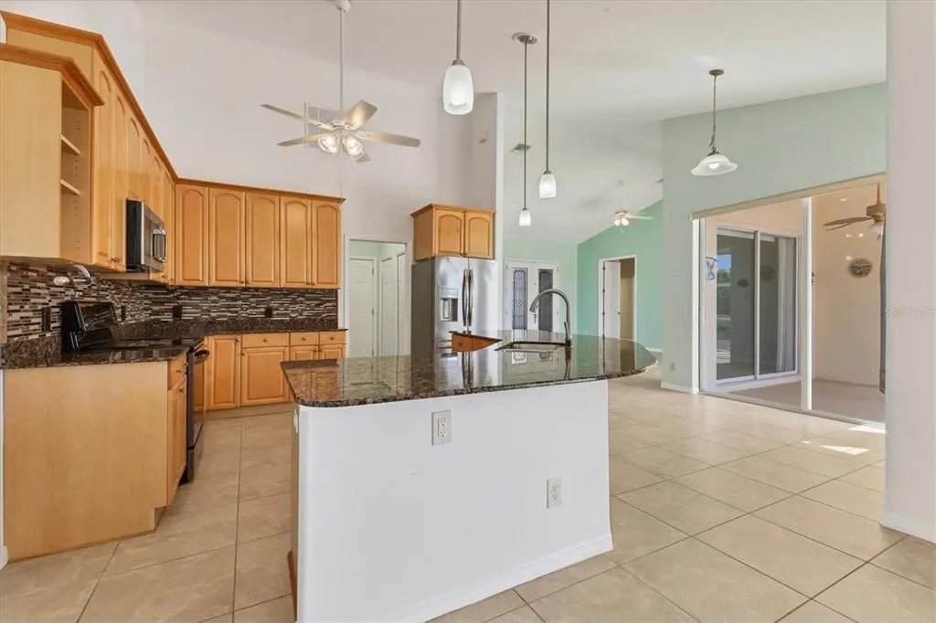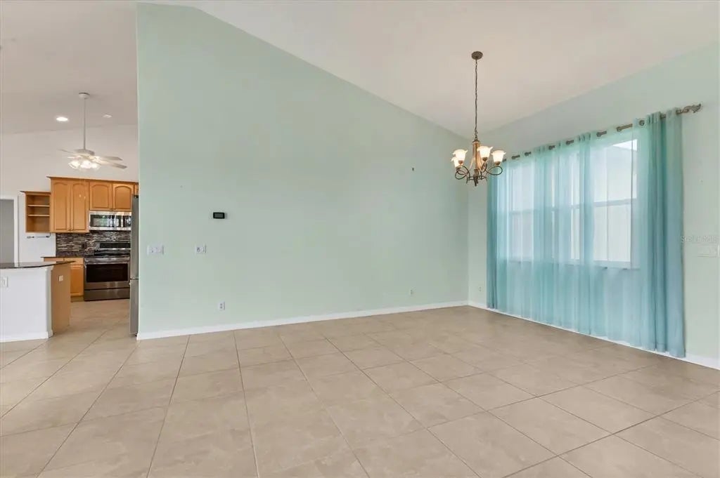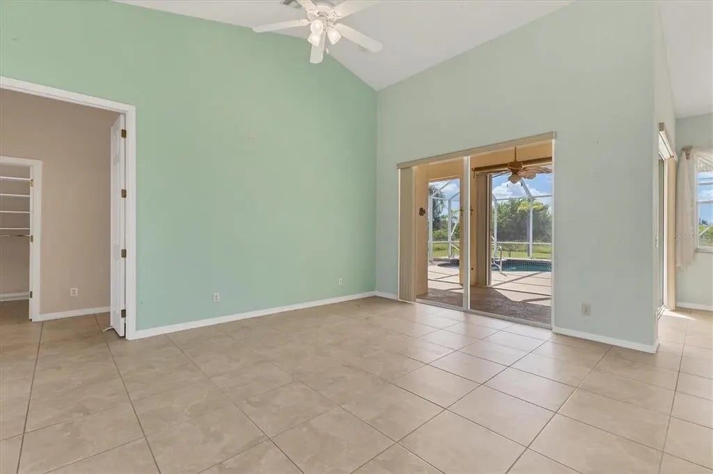 - Interior FeaturesCeiling Fan(s), Eating Space In Kitchen, High Ceilings, Kitchen/Family Room Combo, Open Floorplan, Solid Surface Counters, Split Bedroom, Thermostat, Vaulted Ceiling(s), Walk-In Closet(s)