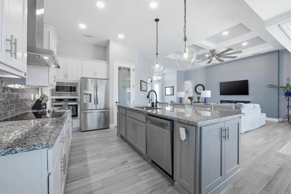 - Interior FeaturesCeiling Fan(s), Coffered Ceiling(s), Eating Space In Kitchen, High Ceilings, Kitchen/Family Room Combo, Living Room/Dining Room Combo, Open Floorplan, Primary Bedroom Main Floor, Split Bedroom, Stone Counters, Thermostat, Walk-In Closet(s), Window Treatments