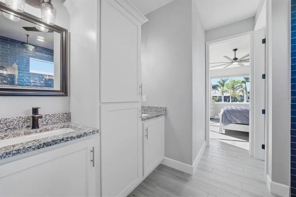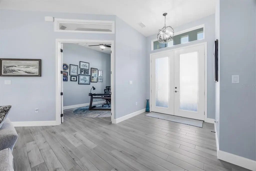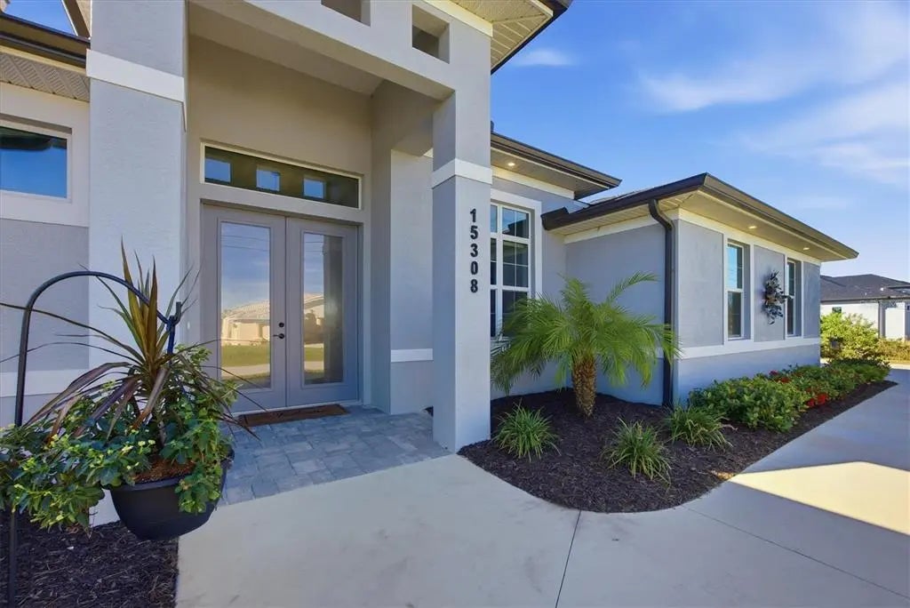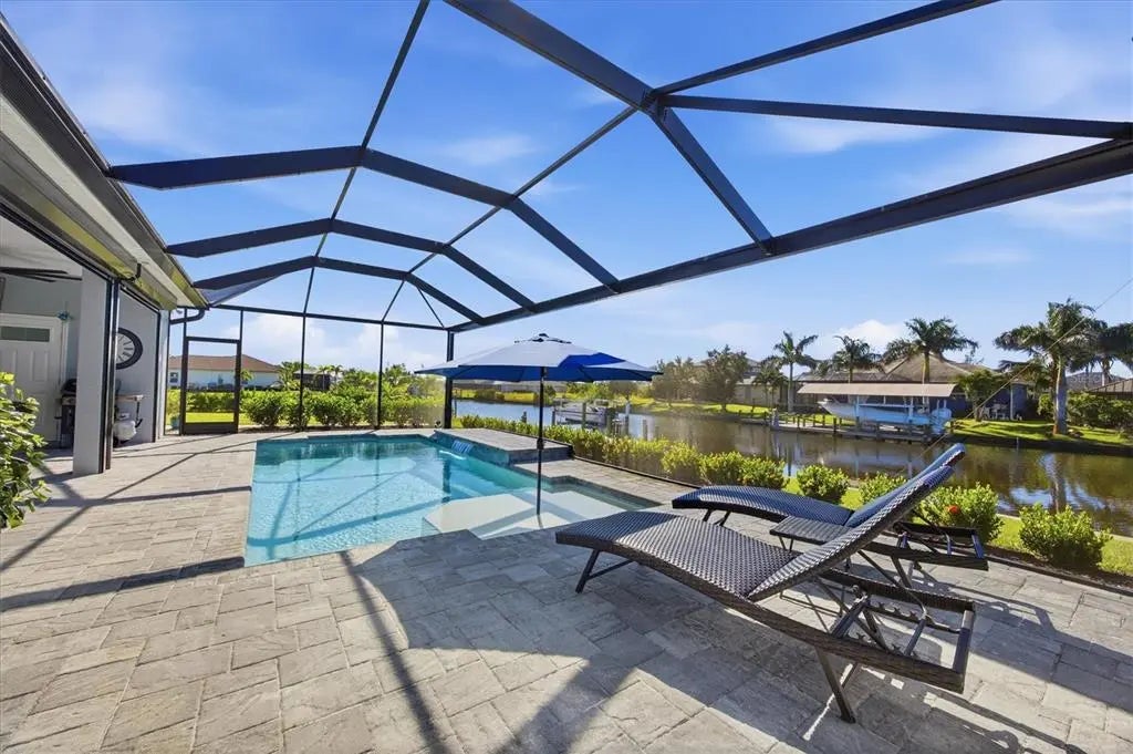 Double Waterfront Lot with 160ft of Seawall, 40ft Composite Dock, 10,000lb Boat Lift, Shed, Heated Pool, Impact Windows/Electric Roll Down Shutters, Custom-Built, and Fully Furnished! Welcome to your dream retreat in the sought-after waterfront community of South Gulf Cove! This fully furnished 3-bedroom + office, 2.5-bathroom home sits on a rare DOUBLE LOT combining elegance, comfort, and functionality. From the moment you arrive, you’re welcomed by lush landscaping and fresh sod that beautifully frame the impressive 160-foot property frontage. Step through the front door and be greeted by vaulted ceilings, stunning taupe plank tile flooring throughout, expansive 9-foot sliding glass doors, and an open living space featuring a cozy fireplace, all set against serene waterfront views. The chef’s kitchen is designed for both beauty and function, offering stone counters, custom soft-close cabinetry, stainless steel appliances, a large island with double-ended cabinetry, and a walk-in pantry. The dining room overlooks grand picture windows and opens seamlessly to the pool area through sliders, making entertaining effortless. The split floor plan ensures privacy for all. The primary suite is a peaceful retreat, featuring a large window overlooking the water, private sliders to the pool, and a spa-like bath with a stunning-tiled walk-in shower, dual vanities, and a spacious walk-in closet. Two additional bedrooms are filled with natural light and share a well-appointed guest bath. A dedicated office, finished laundry room, and oversized garage add convenience to everyday living. Outside, you’ll find a true Florida paradise. The pavered pool deck features a sparkling heated pool with a sun shelf and umbrella stand, a fountain, and ample space for lounging or entertaining. A poolside half bath makes outdoor living even easier. The secondary lot features a spotless 12x16 shed with a ramp, while a private sidewalk leads to the 8x40 dock, complete with water, electric, and a 10,000-pound boat lift. This setup is ideal for enjoying miles of canals with quick access to Charlotte Harbor, the Gulf of Mexico, and beyond. Located just minutes from sidewalks, a park, and beautiful walking paths, this home is within easy reach of world-class fishing, stunning beaches, pristine golf courses, shopping, and dining. Whether as a primary residence, seasonal escape, or turn-key investment, this waterfront home is the perfect blend of luxury and lifestyle.
