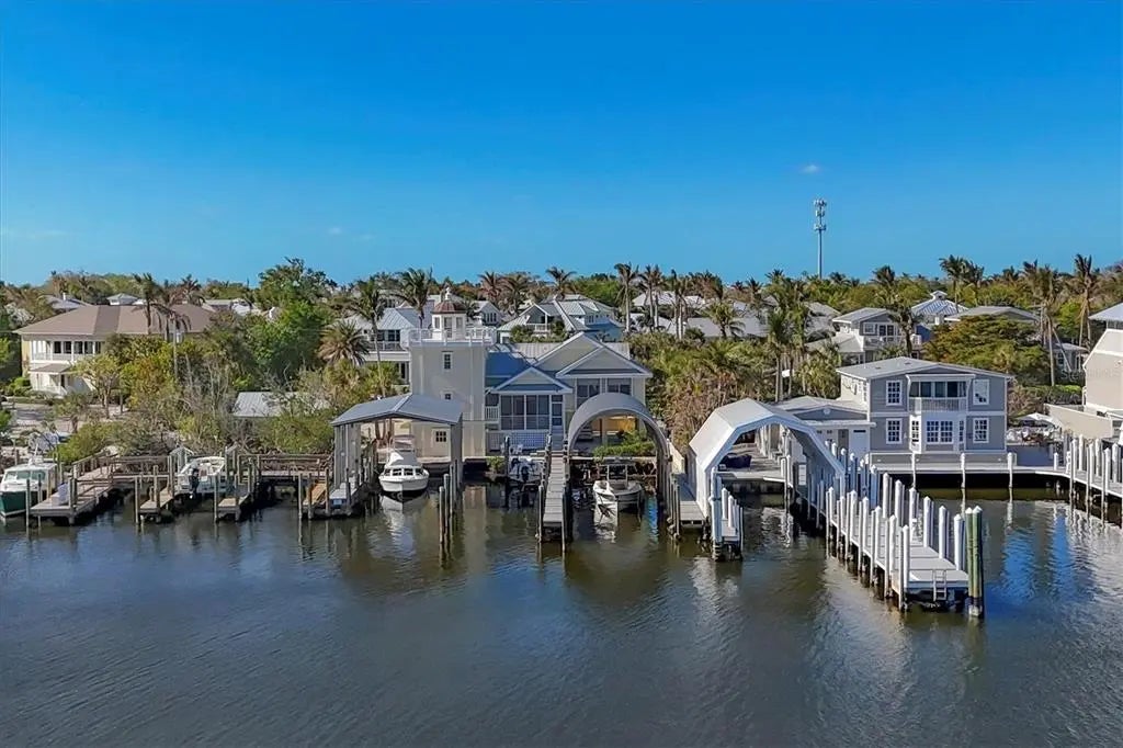 RARE OPPORTUNITY OF PURCHASING A CUSTOM WATERFRONT HOME WITH PRIVATE “MARINA” WHICH INCLUDES 3 DEEPWATER SLIPS, 2 OF WHICH ARE UP TO 100 FEET IN LENGTH, IN THE HEART OF BOCA GRANDE! Located with easy access to the ICW from the Millers Marina Channel this is a one of a kind property. Offering deepwater, long slip lengths and housing for the owner and/or the crew! Of the two covered slips, one is 60ft x 18 1/2ft and the other slip is 100ft x 18 1/2ft. Both boat covers are a work of art and engineered with concrete 45 ft long driven pilings, metal roof detailed with a yellow pine underside and galvanized aluminum. The center slip is 100ft x 20ft and is equipped with a lift. A tackle room is conveniently located adjacent to the dock for easy access. Designed by architect George Palermo and built by Pat Ball of Ball Construction originally on a 50 ft wide lot in 1994 then added on in 1999 when a 25ft adjacent lot was purchased for a combined 75ft of prime waterfront. The home consists of 4 bedrooms, 4.5 baths, a comfortable kitchen and living area, loft, large screened deck overlooking the water and boat docks plus a roof top deck. The house can be used as a primary or vacation home as well as staff for crew and team members. The main house has a kitchen and living area with sliders and a screened lanai overlooking the water and docks. The master bedroom has a queen bed and an en suite bathroom with a stall shower. There is also a guest bedroom with a queen-sized bed, both bedrooms have sliders to enjoy the view, with electric hurricane shutters for extra protection. A loft area overlooks the living area and water with a trundle bed but is also perfect for an office! The “Lighthouse” is accessed via a rear entrance to a bedroom with an en suite full bath, then up a set of stairs to a loft with built-in bunk beds and a full bath. There is a special rooftop deck with a custom copper topped light with access via pull down stairs. Call now for a private showing of this special piece of Boca Grande, Florida.