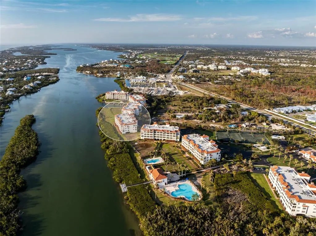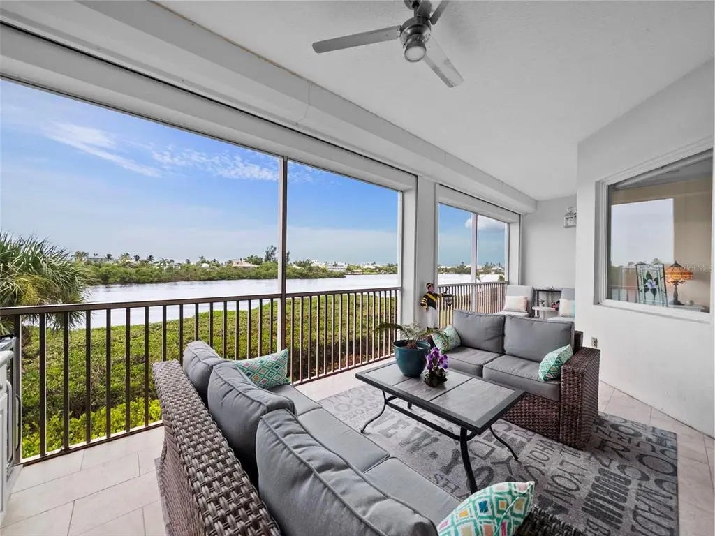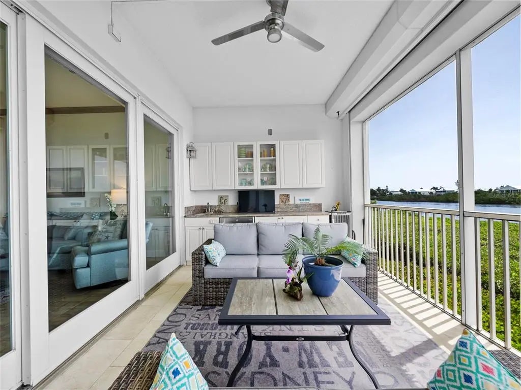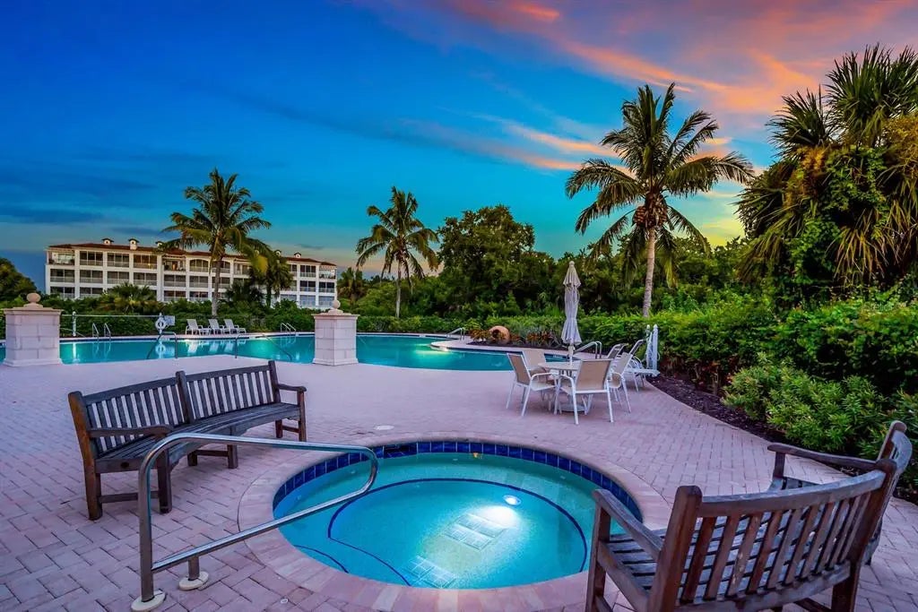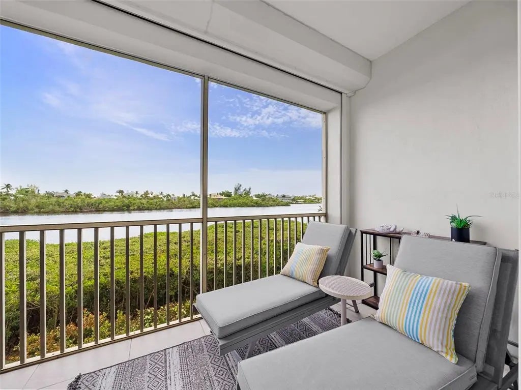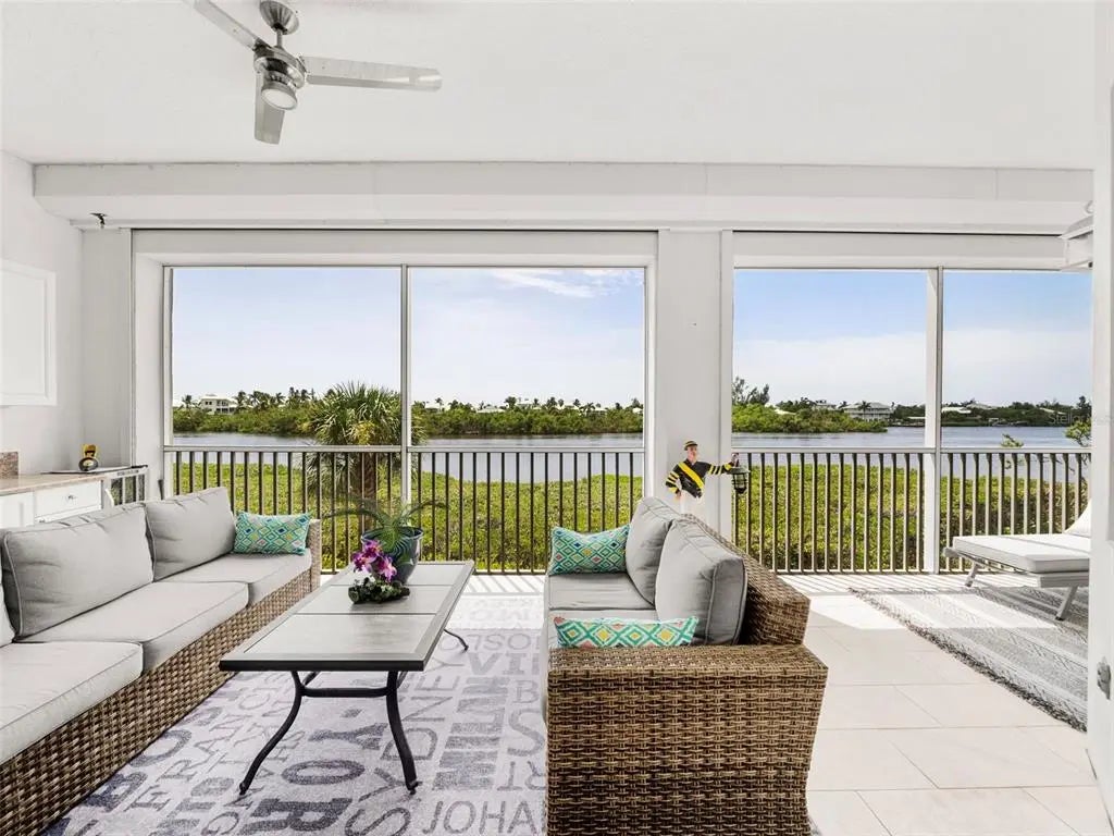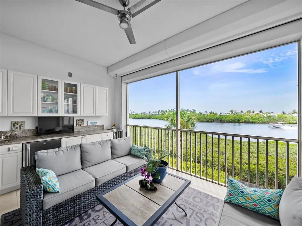 Welcome to this exquisite two-bedroom, two-bathroom condo in the coveted Hacienda Del Mar community. Ideally situated in the closest building to the Intracoastal Waterway, this residence offers an immersive coastal Florida lifestyle. The condo is superbly maintained and features premium finishing's and robust construction quality. Throughout the property, you'll find elegant French pattern porcelain tile flooring, there's a large gourmet kitchen, complete with granite countertops, a beautiful tile backsplash, custom wood cabinetry, and stainless steel appliances. The bathrooms are elegantly appointed with deluxe plumbing fixtures, crown molding throughout; the great room showcases classic stained crown molding, while the other rooms feature a soft white finish. The spacious bathrooms offer distinctive marble counters, custom cabinetry, and gorgeous showers, with the master bath including a large soaking tub. The outdoor kitchen is well-equipped with high-quality cabinetry and a beverage fridge. The residence offers 10-foot ceilings, 8-foot solid core doors and all Andersen impact-resistant sliders and windows, plus motorized hurricane shutters on the lanai for added peace of mind. A new AC system was installed in September 2024 and water heater in October 2023. Many furnishings are negotiable, that can make settling into this property even easier. Hacienda Del Mar boasts spectacular tropically landscaped grounds and a range of incredible amenities, including two large swimming pools, a spa, stunning waterfront clubhouse, tennis and pickle ball courts, a fitness center, day dockage, a massive fenced-in dog park, and paver sidewalks throughout the approximately 23-acre property. The location is convenient, with walking distance to the ferry to Palm Island and close proximity to historic Boca Grande, full-service marinas, world-class fishing and boating, as well as dining, shopping, and miles of pristine sandy beaches.