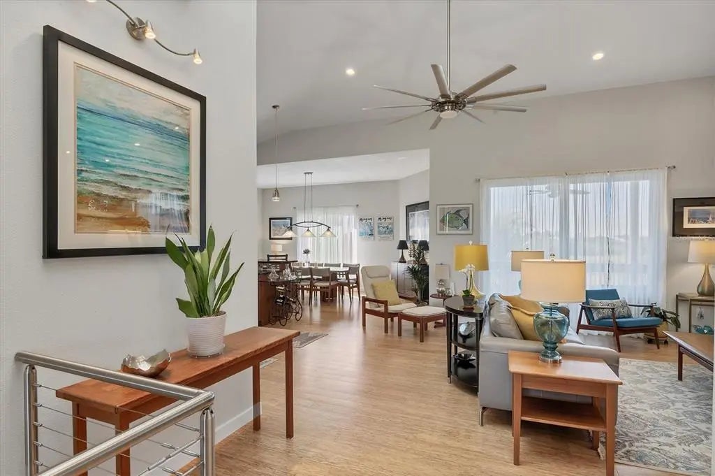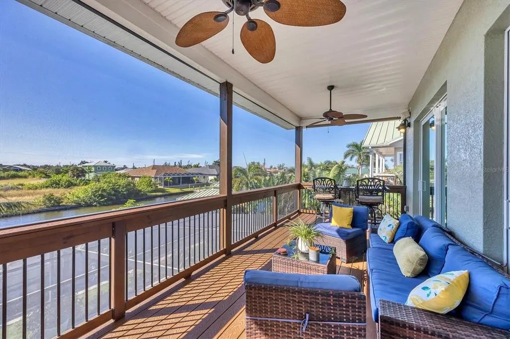 Sailboat Waterfront Retreat with Pool, Dock, Lift & Key West Charm! When you walk up, you’ll be WOWED by the dual staircase entry and gorgeous front porch, perfect for watching the sunrise over Charlotte Harbor. This Key West–style two-story home captures the best of coastal living with thoughtful design, modern upgrades, and incredible outdoor spaces offering both sunrise and sunset views. The main living area is lined with custom impact windows and doors, flooding the space with natural light and showcasing beautiful water views. A stunning cupola with lighting adds architectural charm and a warm coastal glow throughout the home. Inside, you’ll find gorgeous bamboo floors, plantation shutters, and a bright office/music room perfect for creativity or quiet focus. The updated kitchen features stone countertops, custom cabinets, a wine fridge, and a beautiful American cherry butcher block island, a true centerpiece for gathering and entertaining. Both upstairs bedrooms offer stunning views and French doors that open to the beautiful front porch, creating the perfect spot to enjoy morning coffee or gentle coastal breezes. The primary suite features a large walk-in closet and a spa-like en-suite bathroom with an updated shower and elegant finishes. The guest bedroom includes a charming barn door, abundant natural light, and its own en-suite bathroom with gorgeous coastal tile, a designer backsplash, and thoughtful updates throughout. Together, they create a perfect split plan that combines privacy, style, and comfort. Built with full ICF (Insulated Concrete Form) construction, this home provides exceptional energy efficiency, hurricane protection, and soundproofing. The solid concrete design helps maintain consistent indoor temperatures, lowers energy costs, and ensures lasting durability and peace of mind. Step out onto the screened back patio, designed for the ultimate in outdoor entertaining. Enjoy breathtaking sunsets over the water while relaxing to your favorite tunes through the built-in Bose outdoor speakers. A convenient door leading directly to the dining room makes it easy to flow between indoor and outdoor spaces — perfect for gatherings, dinner parties, or simply unwinding at the end of the day. Downstairs, you’ll find a spacious in-law suite featuring its own private porch, vinyl flooring, and custom impact windows that fill the space with light. It includes a comfortable bedroom, bathroom with a walk-in shower, and a large living area that opens to a private deck with a sunshade—perfect for relaxing or entertaining. Ideal for guests, extended family, or private living quarters, this space offers comfort and versatility. Outback, relax by the heated saltwater pool with sunshade and new pool pump (2025). Boaters will love the 10,000 lb Deco boat lift, dock with water and electric, and sailboat access (NO BRIDGES) to open water just minutes from the lock. Additional features include a whole-house Aquasana water filtration and conditioning system (10M gallon capacity), heat pump water heater, 3-zone AC with an extended 10-year warranty, SimpliSafe security system, and an avocado hybrid Hass tree for a touch of tropical charm. The home also has an elevator shaft already in place, currently being used for storage but ready to be upgraded for future elevator installation if desired.