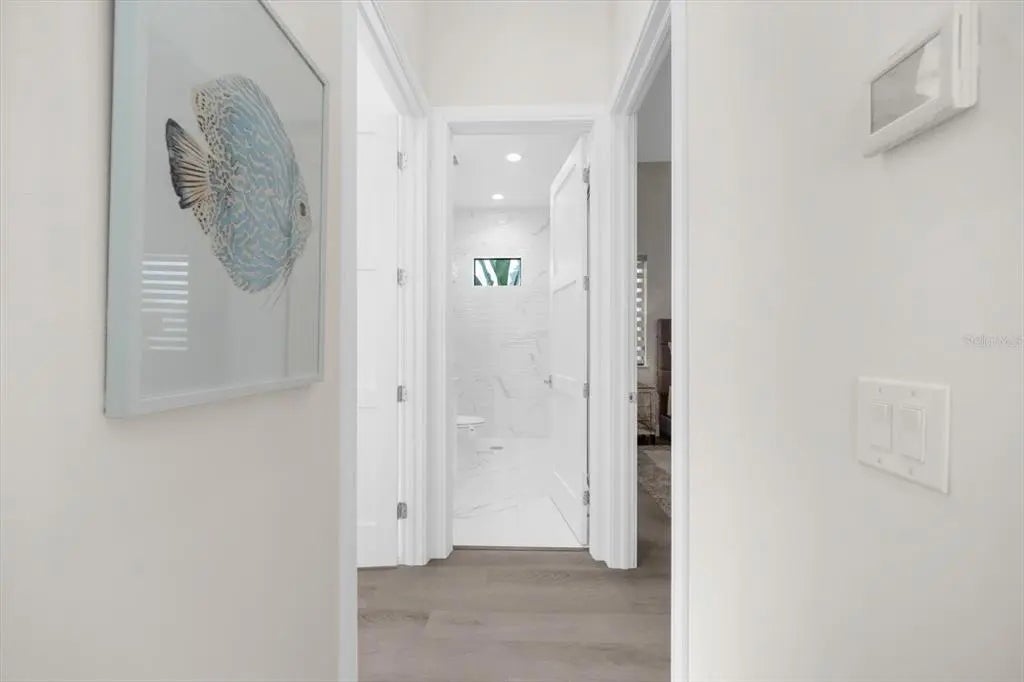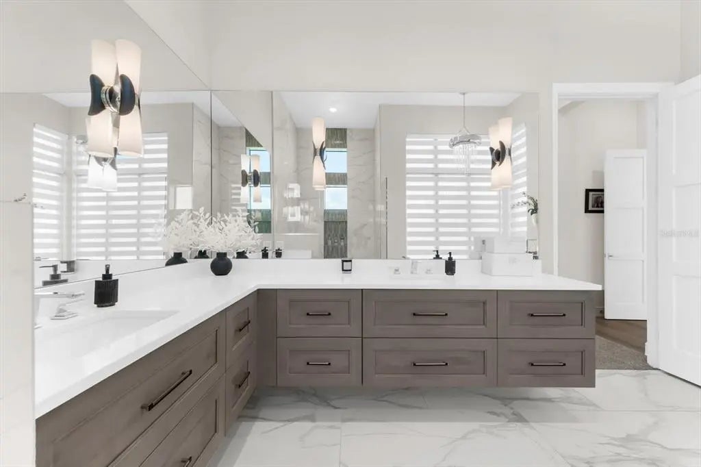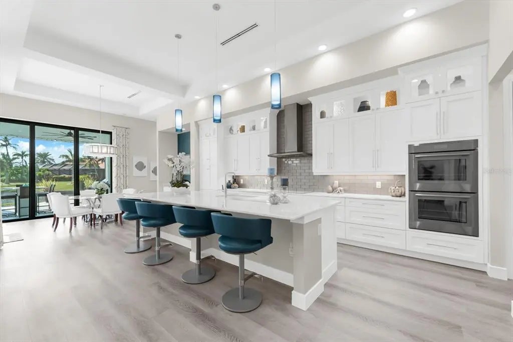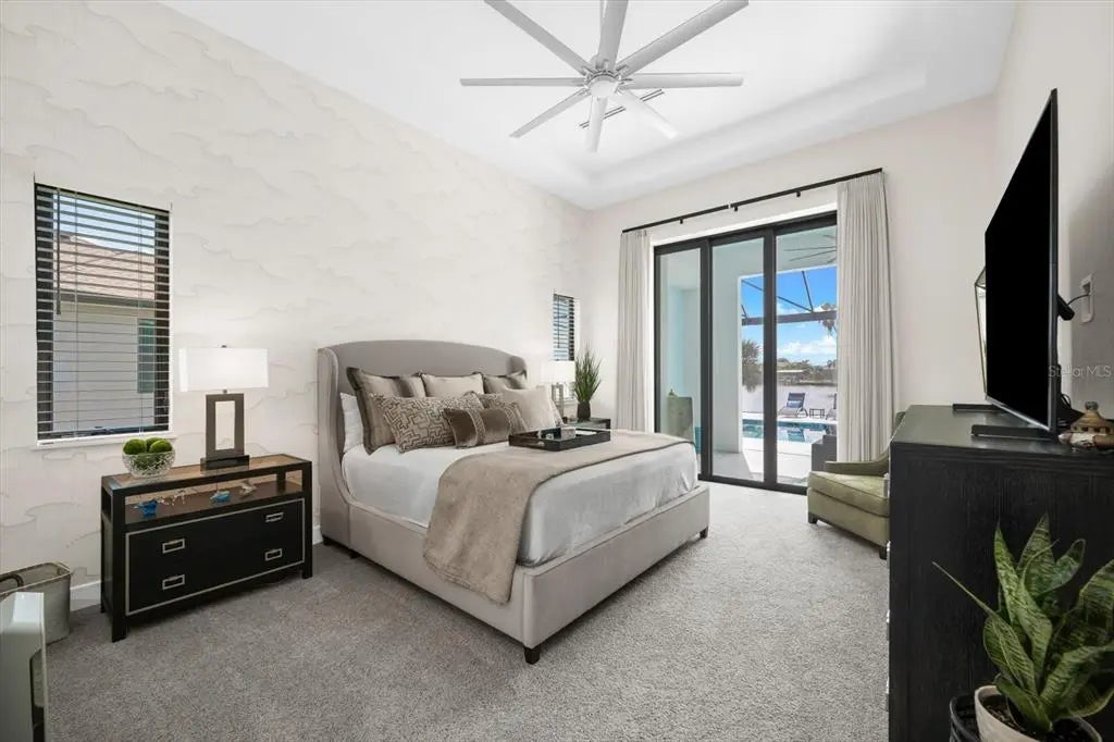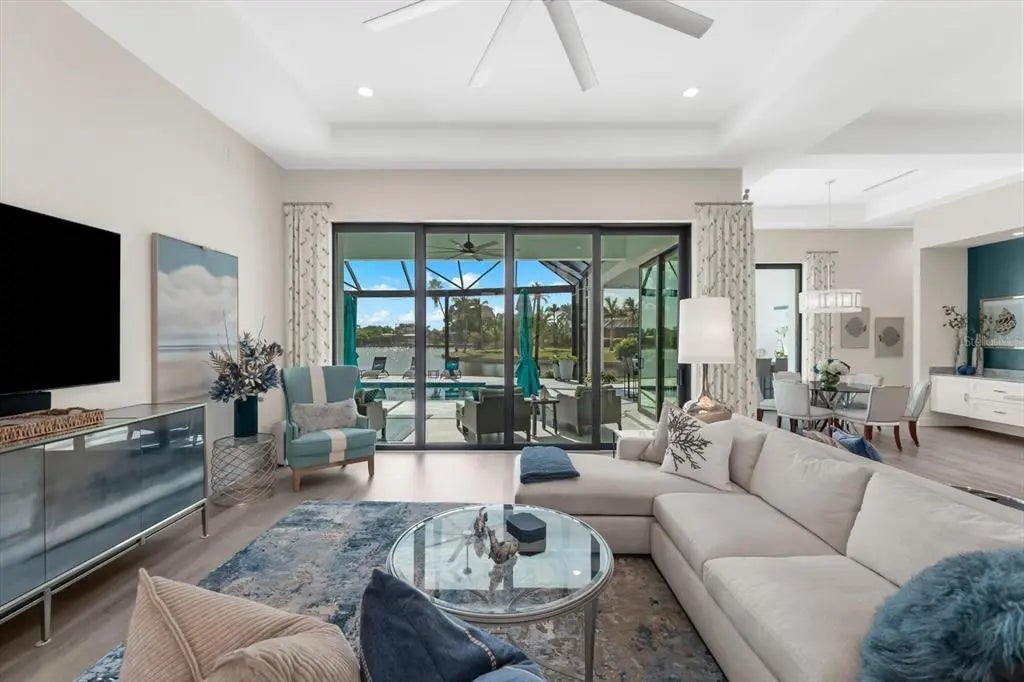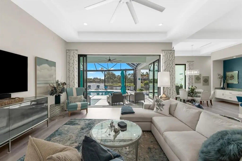 Introducing an extraordinary waterfront residence designed by the renowned Sater Design Group, celebrated for their award-winning designs worldwide. This custom-built soft contemporary home sits on an oversized 0.34-acre lot with stunning intersecting canal views and direct boating access to Charlotte Harbor and the Gulf of Mexico. Offering 2,836 square feet of air-conditioned living space plus 1,648 square feet of unconditioned areas, this home delivers a complete lifestyle experience inside and out. A dramatic glass entryway welcomes you through 10-foot double glass doors with sidelights and a transom window above, setting the tone for the thoughtful architectural details and upscale finishes throughout. The open-concept interior includes three spacious bedrooms, three full bathrooms, and a dedicated office. Soaring ceilings, 8-foot solid core shaker interior doors with Emtek hardware, and PGT impact-resistant casement windows and sliders fill the home with natural light and serene views. The chef’s kitchen features high-end Thermador appliances—including an induction cooktop with vent hood, double ovens, built-in side-by-side fridge and freezer, full-size wine cooler, and under-counter microwave—all integrated into custom double shaker cabinetry with glass display uppers and quartzite countertops. A floating buffet anchors the adjacent dining area, while a large walk-in pantry adds a second Bosch dishwasher, custom cabinetry, and quartz workspaces matching the kitchen and laundry room. The owner’s suite is a private retreat with a spa-inspired bath showcasing a freestanding Jacuzzi tub, glass-enclosed shower under soaring 12-foot ceilings, floating vanities with quartz counters, Kohler sinks, and a Toto Washlet. Built-in drawers feature integrated power and custom organization, and the spacious walk-in closet includes attic access. Outdoors, enjoy a resort-style setting with two large covered lanais—perfect for lounging, dining, or entertaining. One lanai features a fully equipped outdoor kitchen ideal for alfresco meals. A custom-designed pool and spa sit at the heart of the outdoor space, enclosed in a picture-frame cage. The pool features a Caribbean blue pebble finish, elevated interior sections for water sports, a sun shelf, a matching tile spa waterfall, LED lighting, and remote control. Over 1,400 sq ft of tumbled marble pavers in a French pattern surround the pool and outdoor shower area, creating a luxurious and durable entertaining space. The oversized lot is professionally landscaped with decorative rock along the canal edge, lush St. Augustine/FloTam sod, and a full irrigation system fed by canal water. Built for efficiency and durability, the home features 12-foot-high CMU block exterior walls with foam insulation, a flat concrete tile roof, with waterproof membrane, a spray foam-insulated attic with no soffit vents for a sealed system, and an oversized Trane HVAC. A hybrid 50-gallon water heater with heat pump and recirculating system boosts efficiency. Additional features include a three-car garage with epoxy flooring, custom CHI doors, jackshaft openers, and impact-rated service door, plus a charcoal/gray French-pattern paver driveway that enhances curb appeal. This exceptional property offers a rare blend of cutting-edge design, luxury finishes, and direct access to some of Florida’s most desirable waterways. This home must be seen to appreciate.