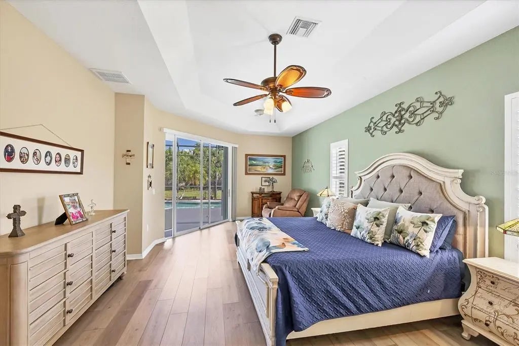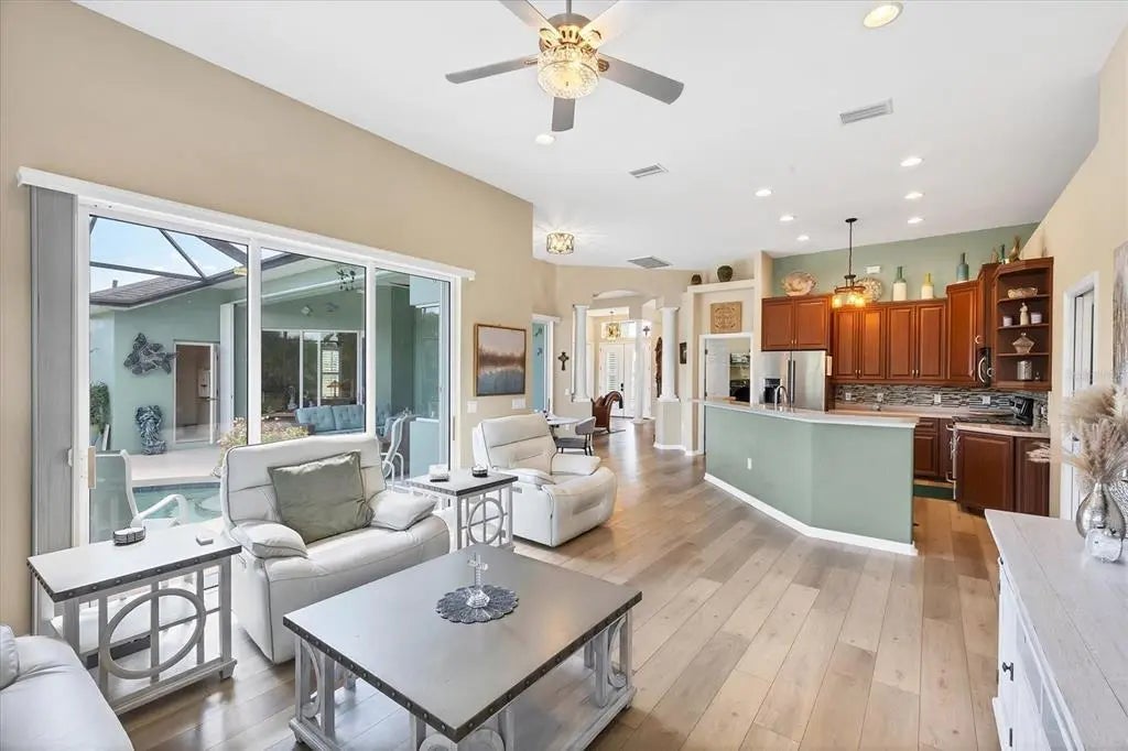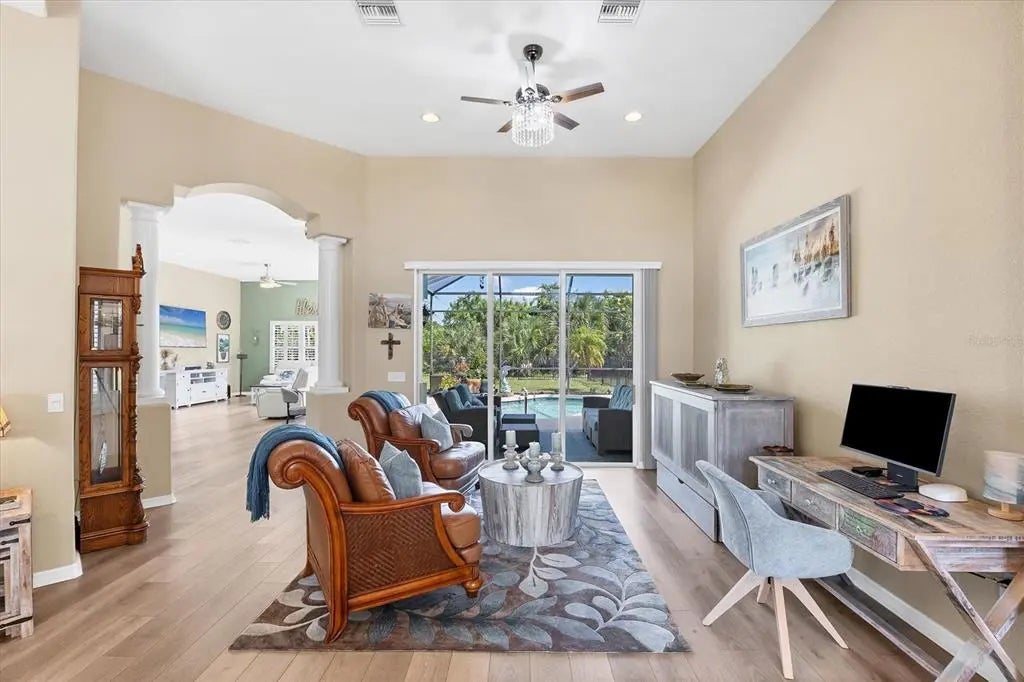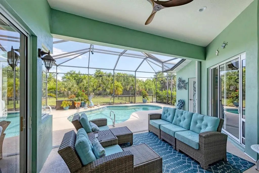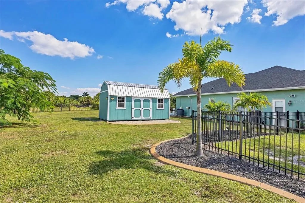 Yes, you can HAVE IT ALL! This meticulously maintained ESTATE home is situated on a DOUBLE LOT with almost a 1/2 ACRE of land! Enjoy wide-open views and breathtaking sunrises, all just minutes to local amenities. This light and bright property will fulfill your Florida dreams in every way providing the space and flexibility to do almost anything you can think up! This stately home immediately welcomes you with an abundance of exterior curb appeal! Custom paint, curbing, mature landscaping, and aluminum fencing all lead to the lovely glass double front doors. Once inside, you are immediately taken in by the sheer volume and the abundance of natural light pouring in and you begin to see the details of this well-thought-out floor plan that sets this home apart! From the 10ft ceilings, decorative arches/columns, plantation shutters, to the upgraded light fixtures and fans, just to name a few. Multiple sets of 8ft sliding glass doors add functionality and integrate indoor and outdoor living. Luxury vinyl plank floors throughout bring together these elements with style and uniformity. The neutral palette allows you to easily personalize this home to make it yours! This floorplan was truly designed for meeting, greeting, and entertaining all family and friends in total comfort! All rooms are generously sized, and it offers a formal living room, dining room and a family room! In the kitchen you will notice an abundance of cabinets and counter space, plenty of room for more than 1 cook! Staggered raised-panel cabinetry adds elegance and the plant shelving above can be embellished to your liking. Corian countertops, glass backsplash, raised bar, and stainless appliance package are just a few of the features that make this kitchen special. Even the walk-in pantry is a showstopper! Large enough to store all your cooking/baking appliances and still allow for plenty of food storage. Small dinette area has a large picture window and sliding glass door accessing the lanai, is easily accessible for morning coffee! The primary bedroom is spacious enough to accommodate even the largest furniture with room for a sitting area and sliders accessing the lanai. The ensuite begs you to create your own Zen space by features a soaking tub, tiled walk-through shower, large dual vanities, and 2 walk-in closets. The second and third bedrooms are located adjacent to the great room so your guests can enjoy their rest and relaxation time in total privacy. Each room is a comfortable size, with a large window, plantation shutters, and ample closets. Bedrooms are separated by a conveniently located full bathroom. The covered lanai leaves plenty of room to entertain, dine or just relax out of the Florida sun. There is a spacious deck for sunbathing or if you prefer, the sparkling pool is sure to cool you off and is heated for those cool winter days. On the practical side, both lots have Aluminum Fencing 2022 complete with a separate dog run, 10x20ft Shed 2022, New Roof 2022, Gutters 2022, Exterior and Interior Paint 2022, Well Irrigation, and Plantation Shutters 2022.