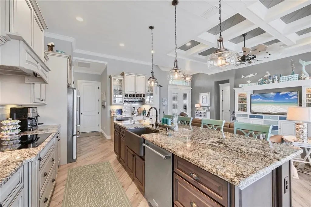 - Interior FeaturesCeiling Fan(s), Coffered Ceiling(s), Crown Molding, Eating Space In Kitchen, High Ceilings, Open Floorplan, Primary Bedroom Main Floor, Solid Surface Counters, Solid Wood Cabinets, Split Bedroom, Stone Counters, Thermostat, Vaulted Ceiling(s), Walk-In Closet(s), Wet Bar, Window Treatments